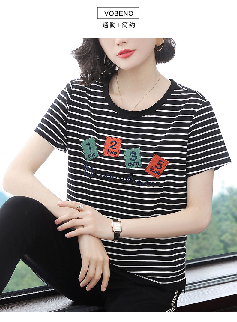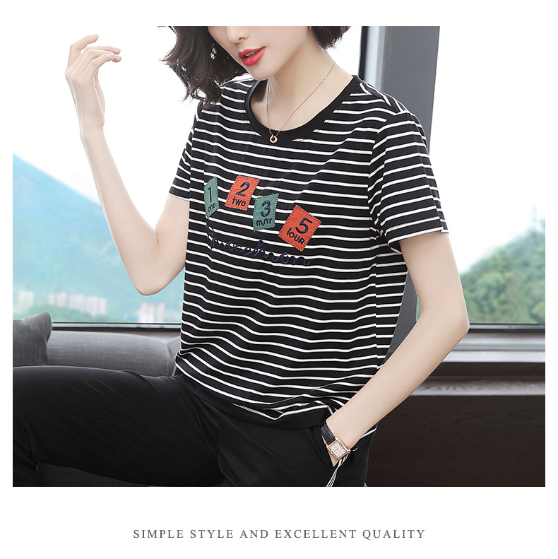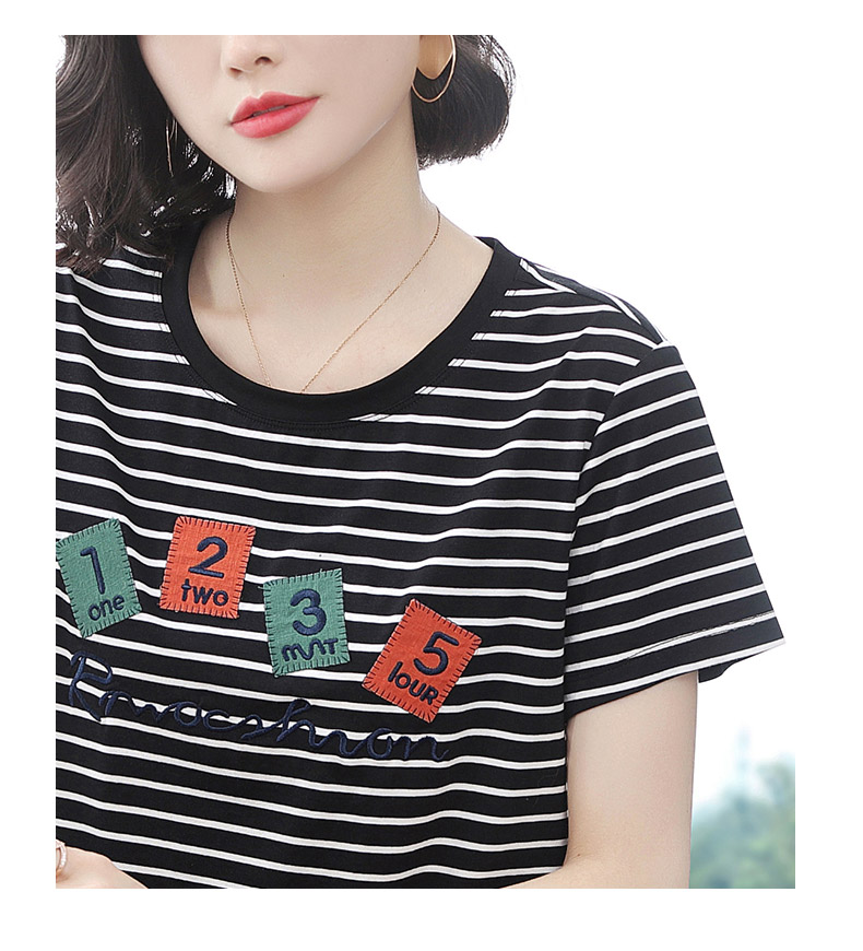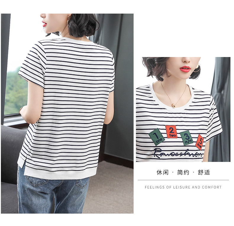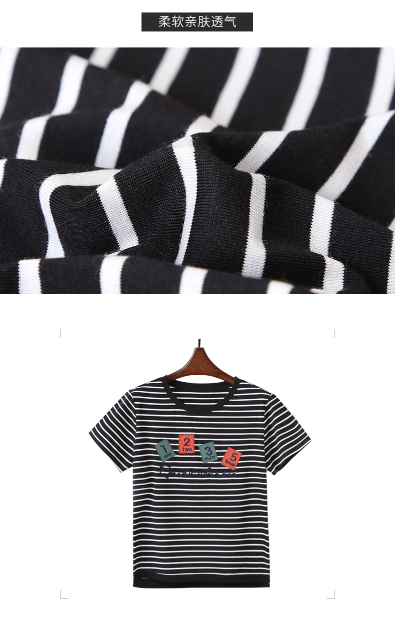 黑白條紋t恤女短袖寬松2019新款夏裝韓版圓領體恤大碼刺繡上衣潮