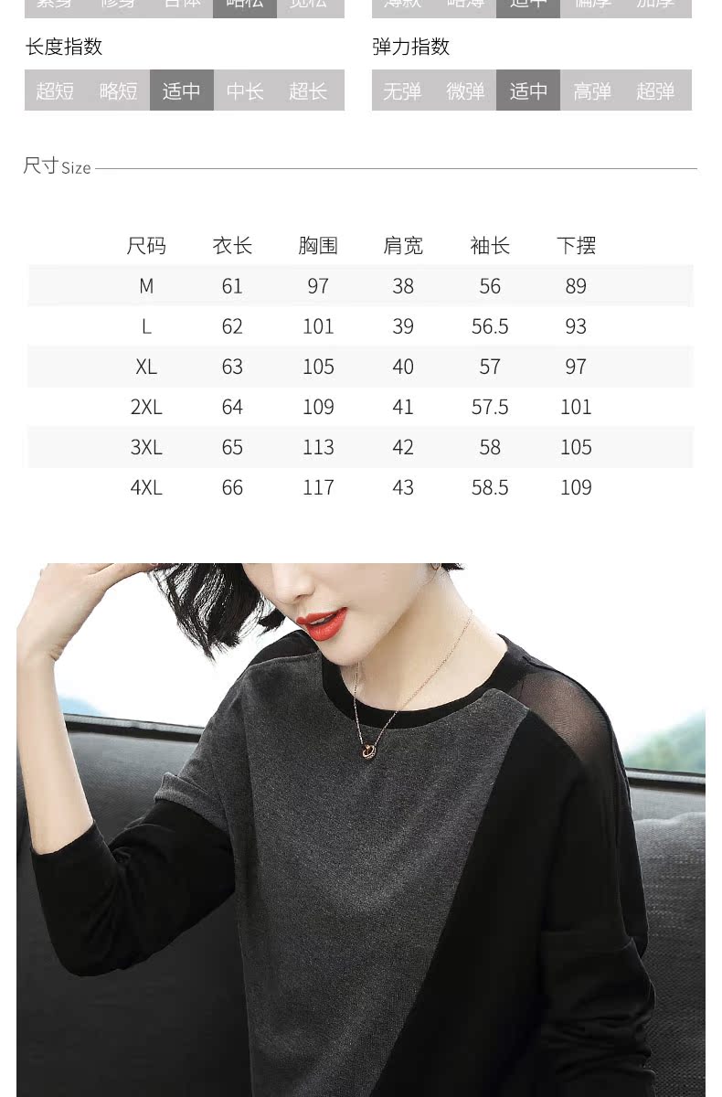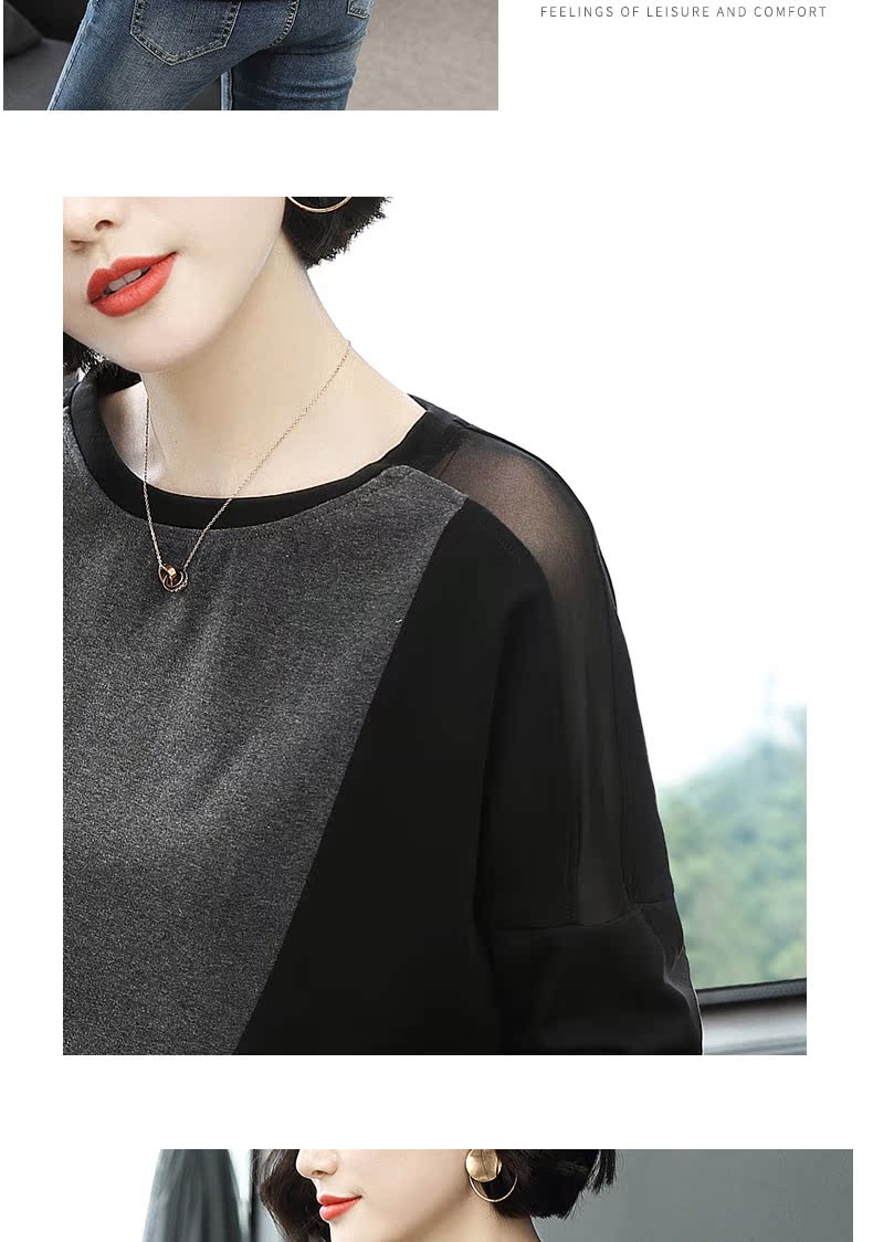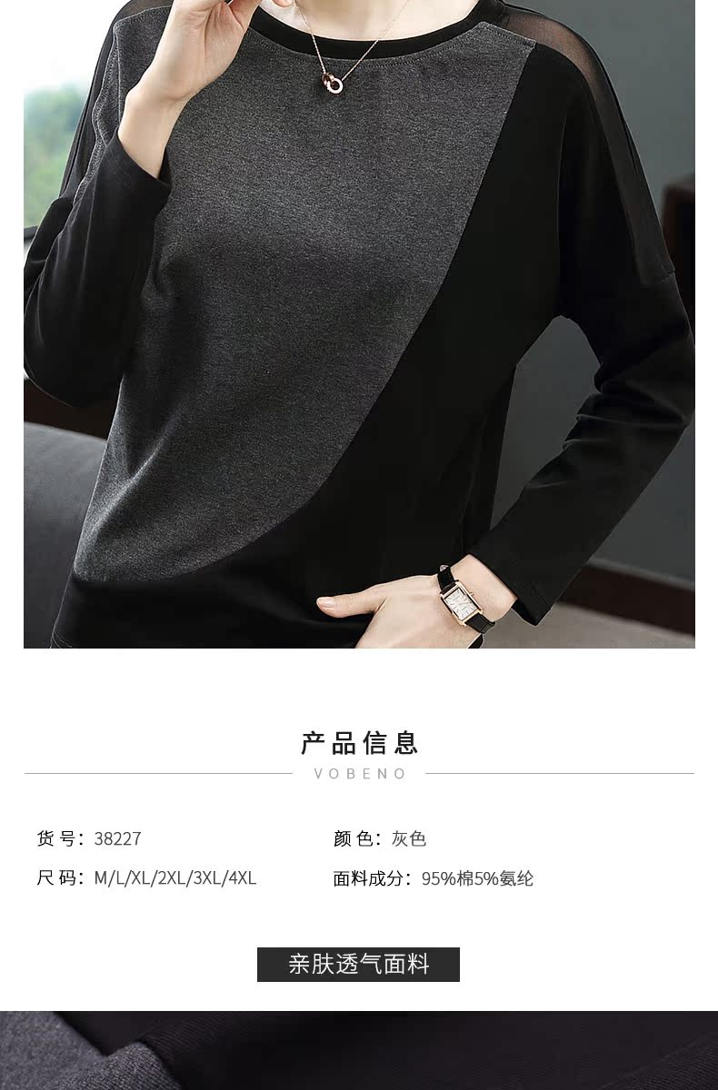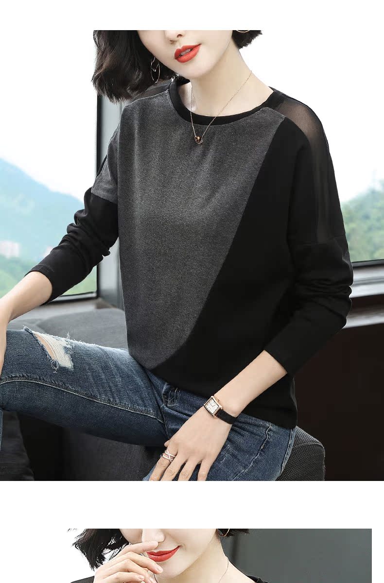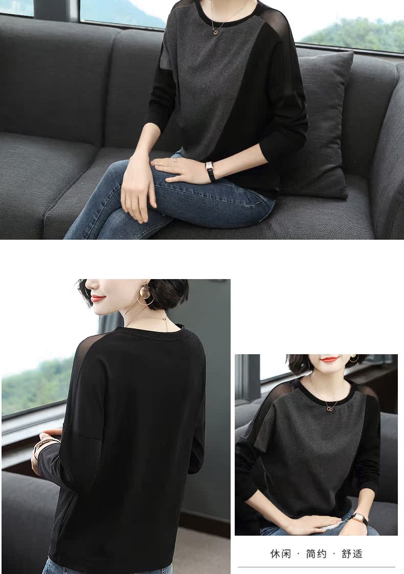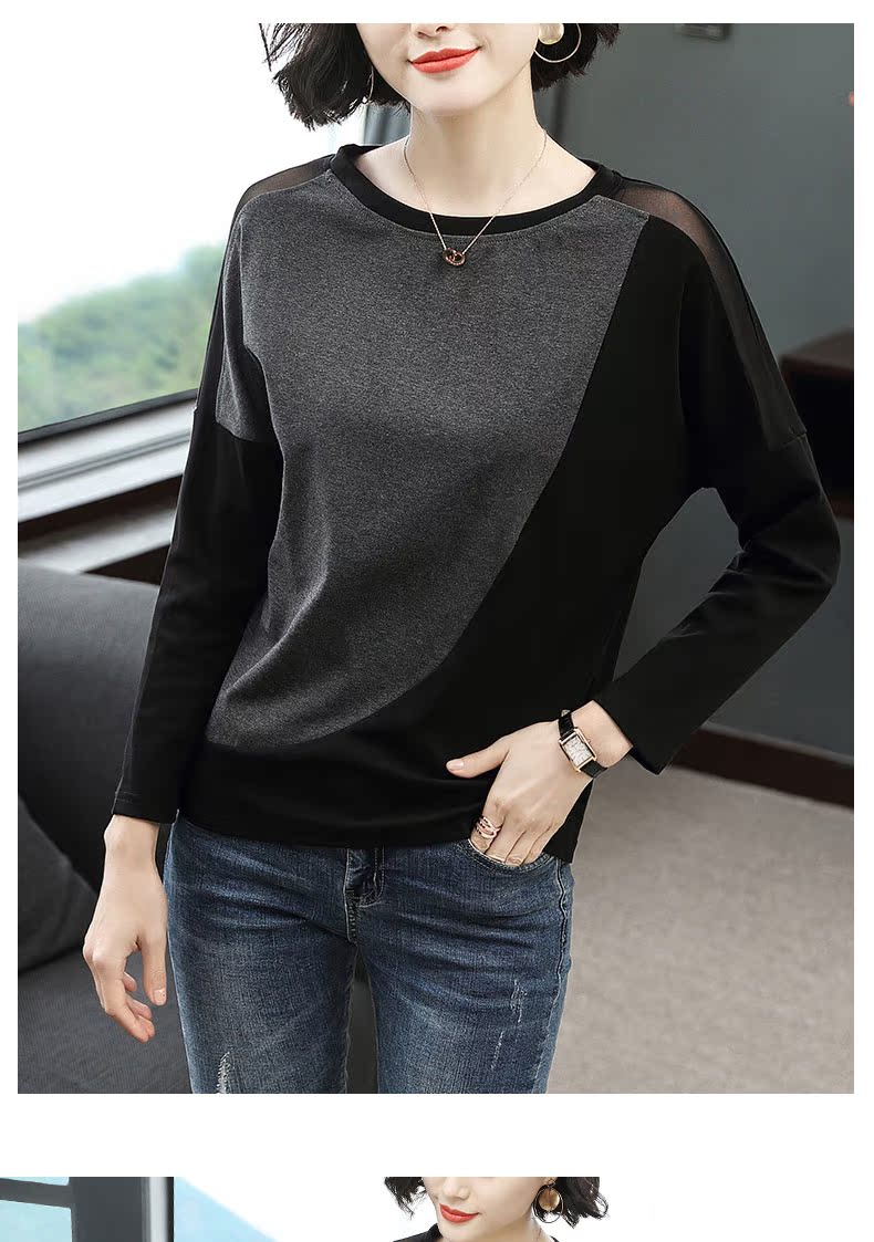 2019新款女裝長袖t恤女寬松網紗拼接拼色時尚大碼打底衫春裝上衣