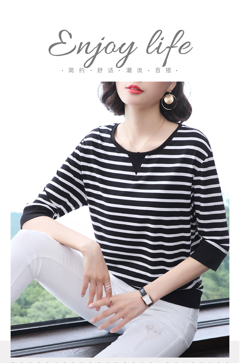 2018秋裝新款女t恤條紋大碼胖mm女裝拼接體恤春秋季中袖打底衫女