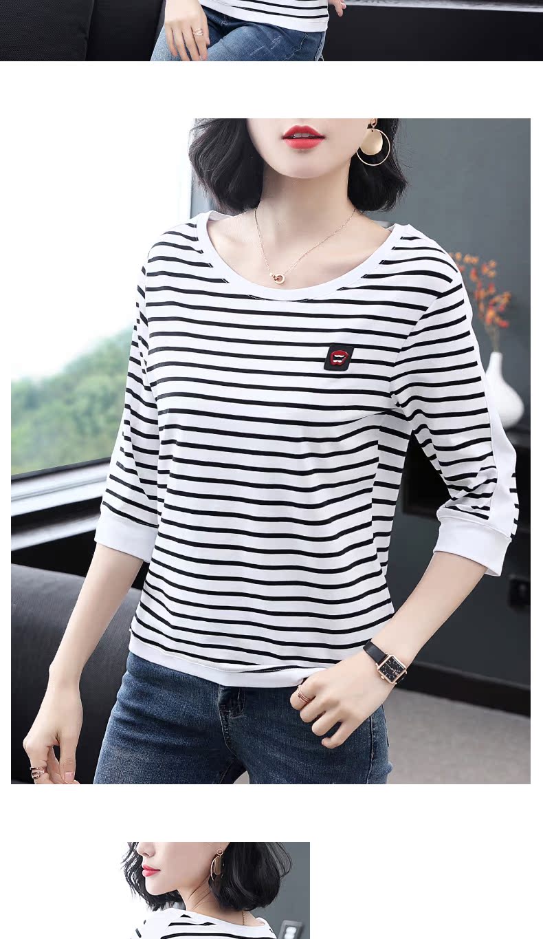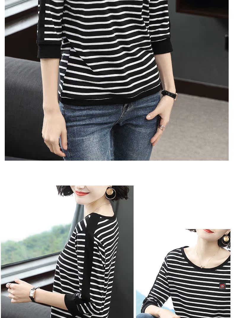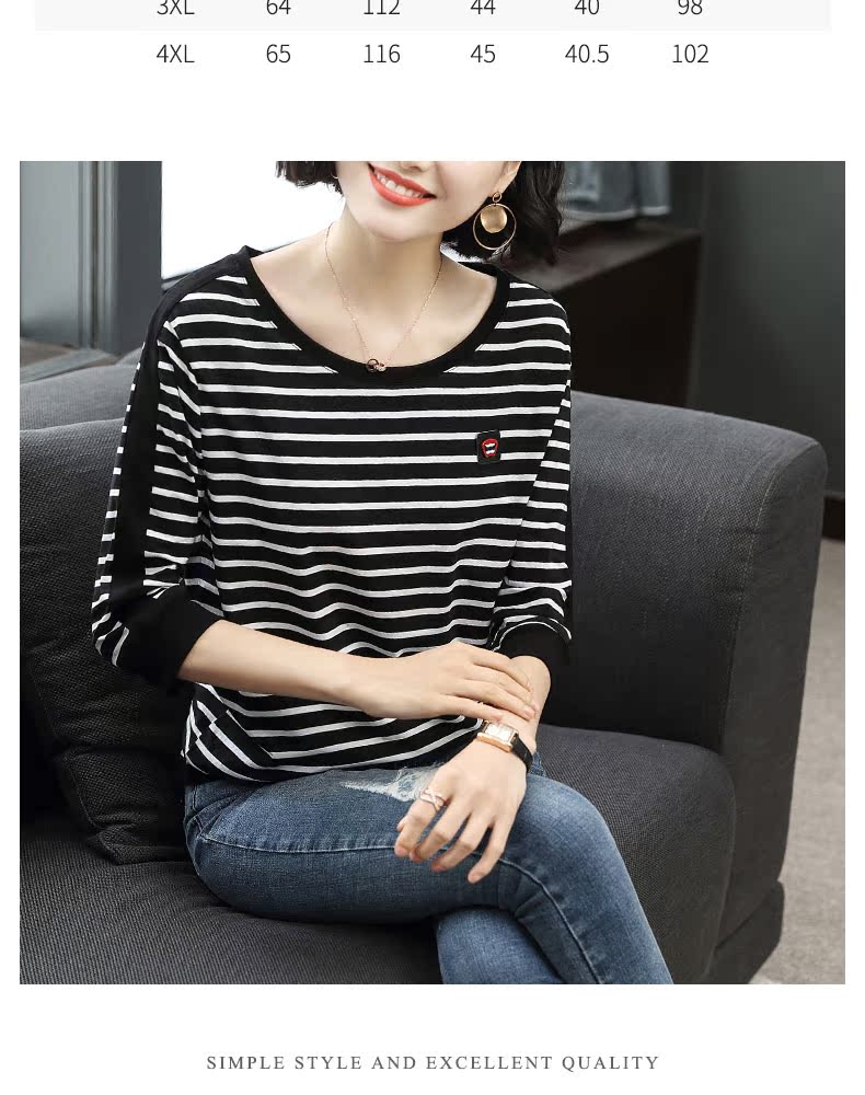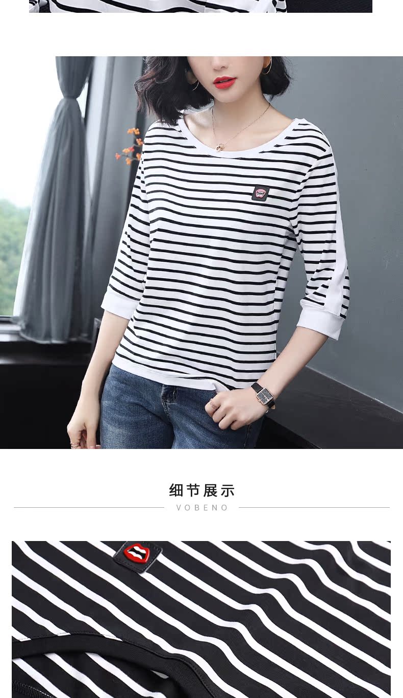 2019新款女裝春裝七分袖t恤女韓版黑白條紋打底衫寬松上衣小衫潮