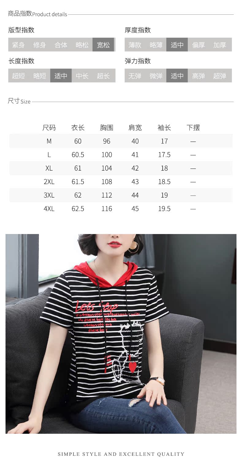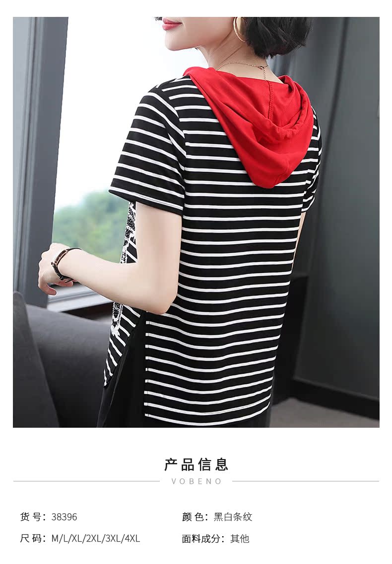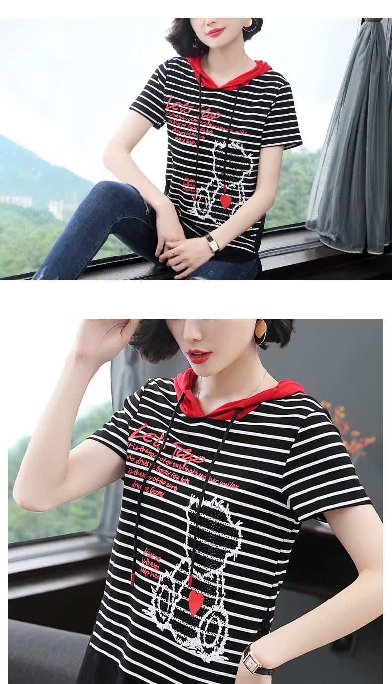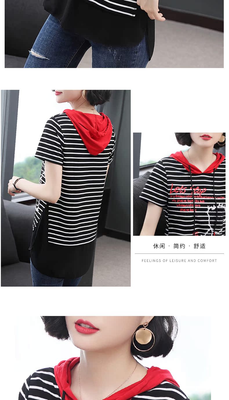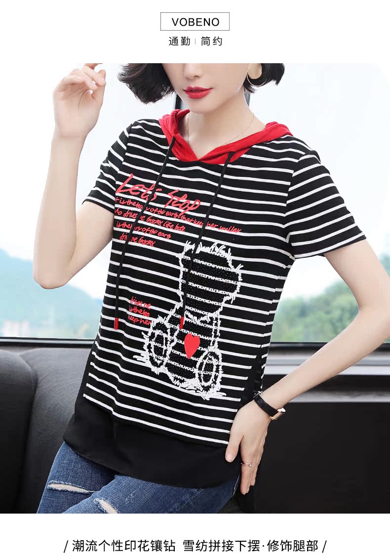 連帽短袖t恤女條紋2019新款夏季中長款韓版印花體恤前短后長上衣