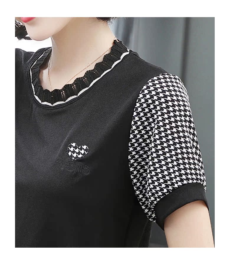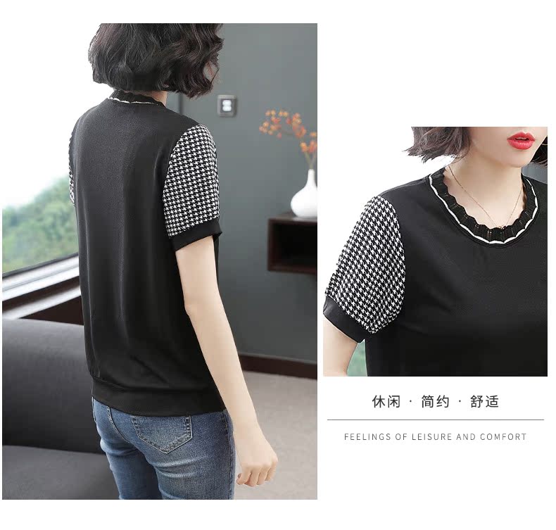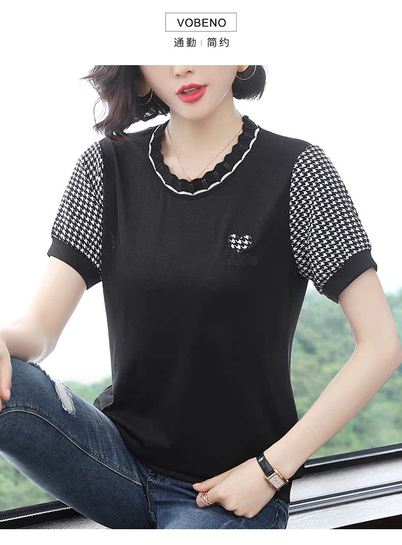 2019新款夏裝短袖t恤女寬松大碼韓版超火cec格子半袖拼接體恤小衫