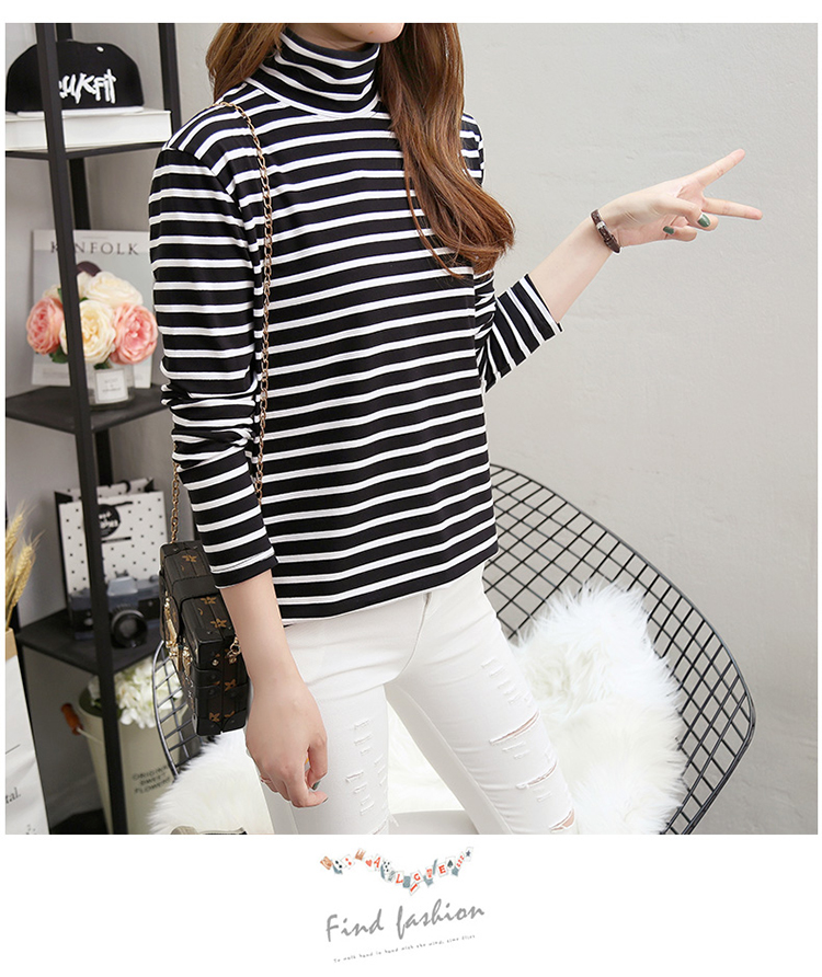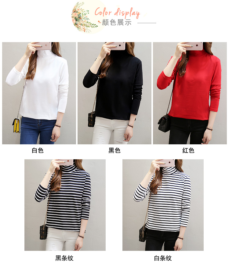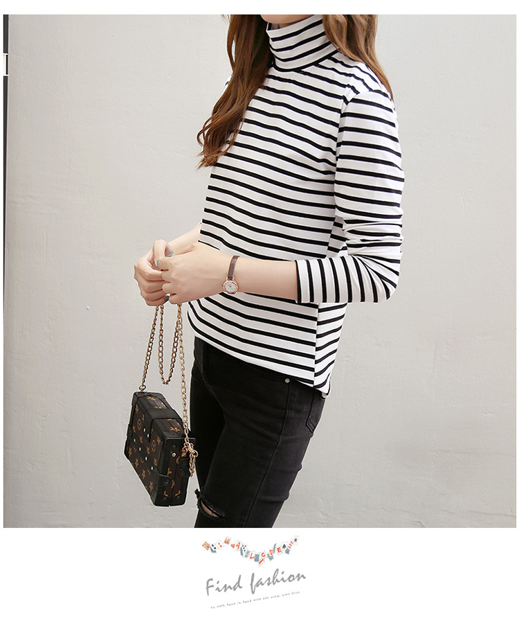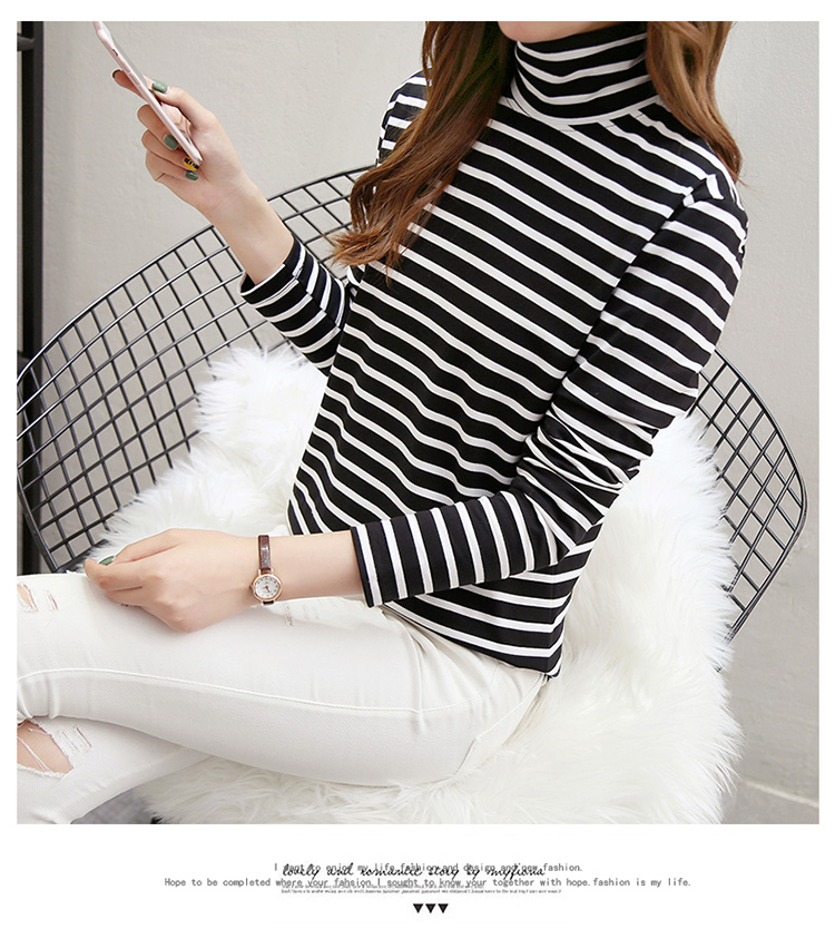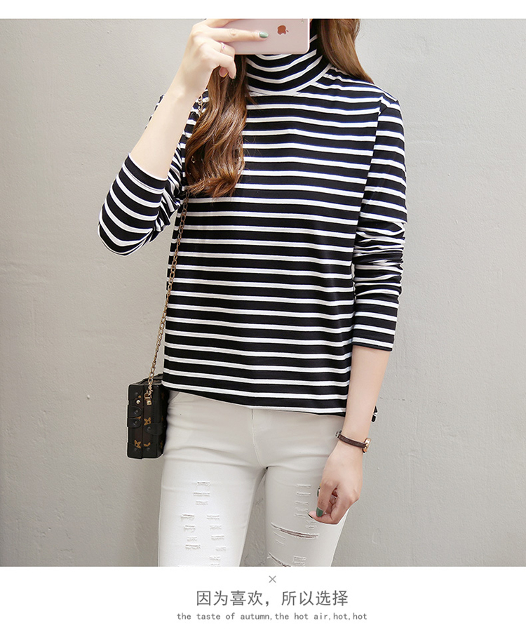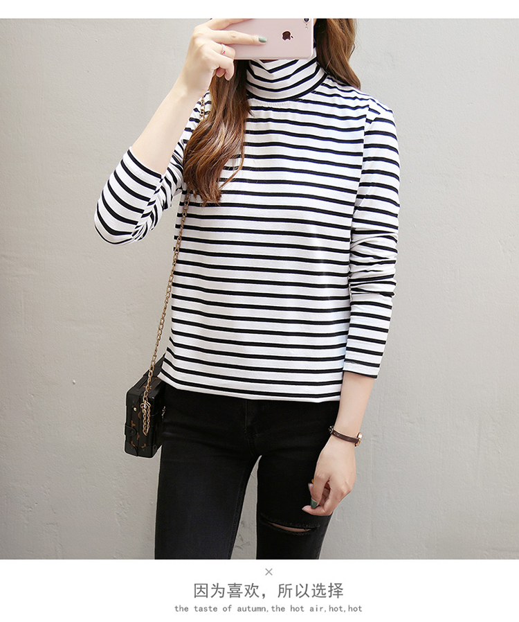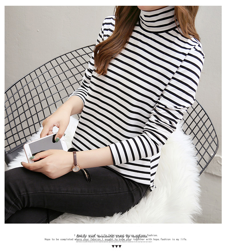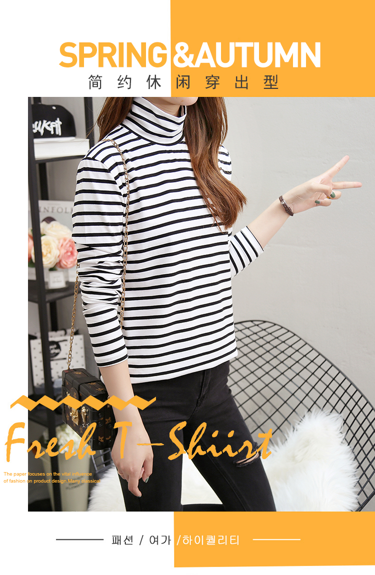 2019春季新款條紋高領打底衫女長袖T恤寬松韓版?加肥大碼上衣服
