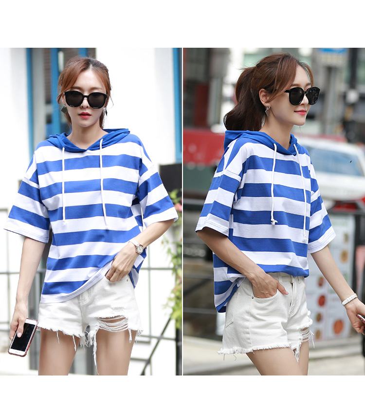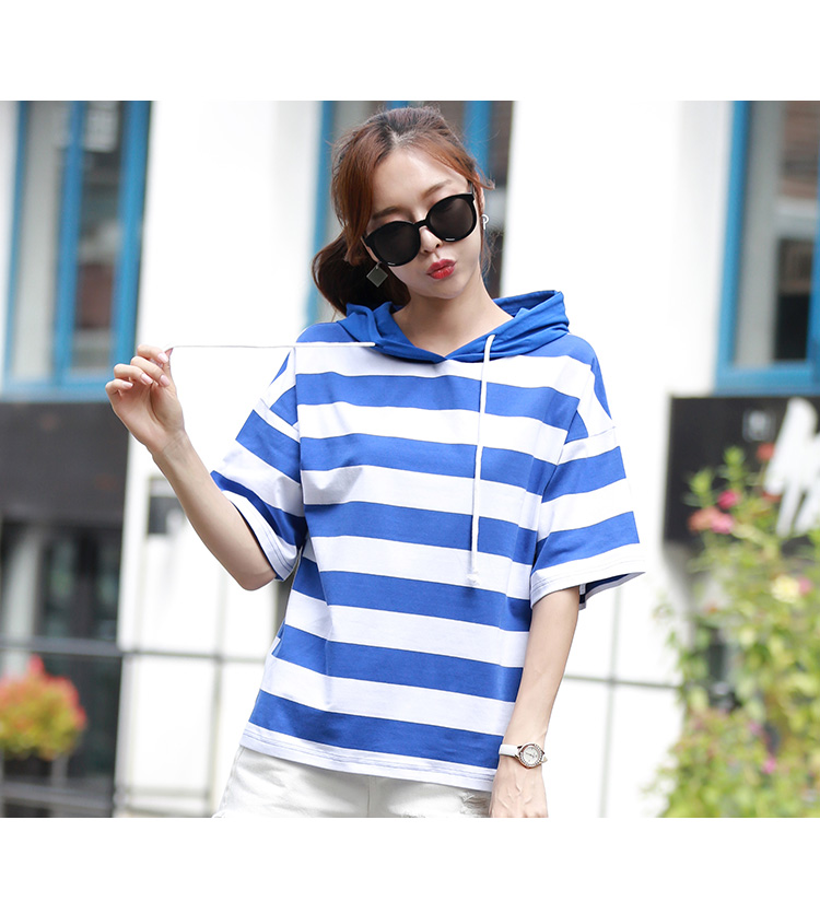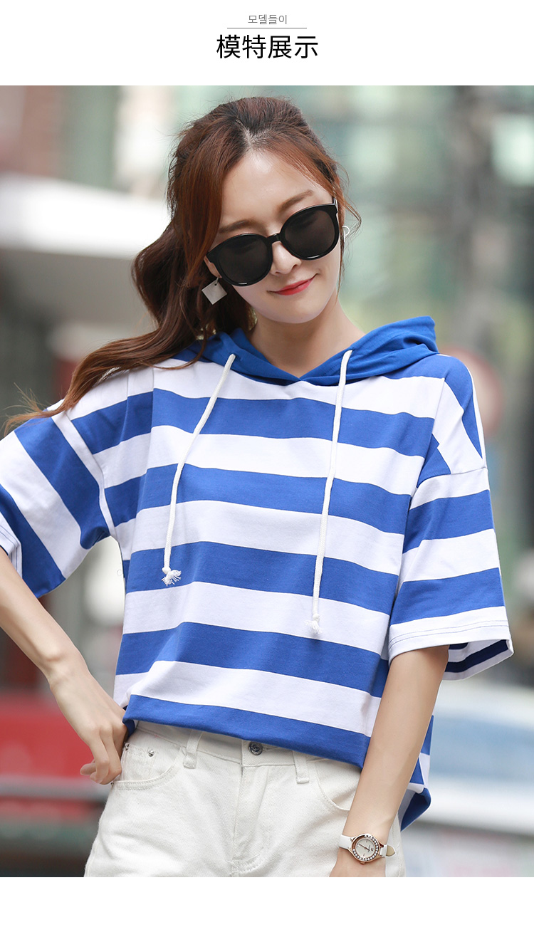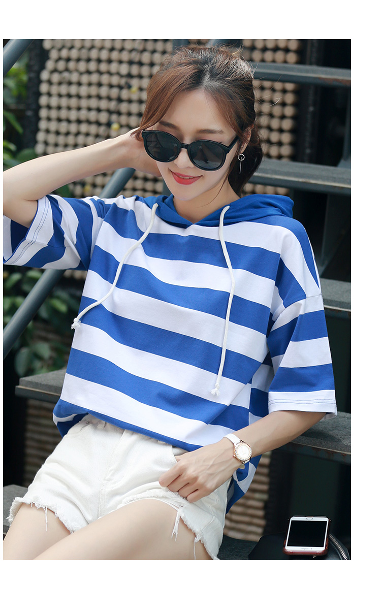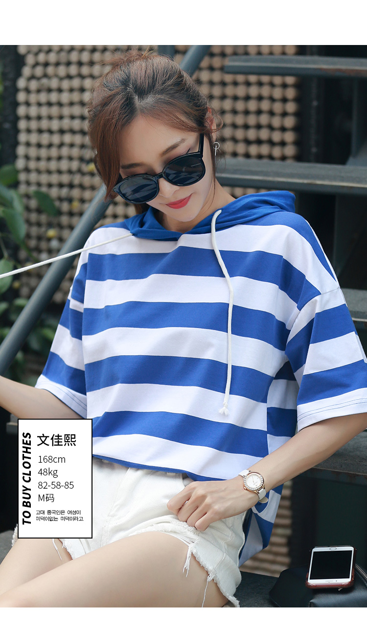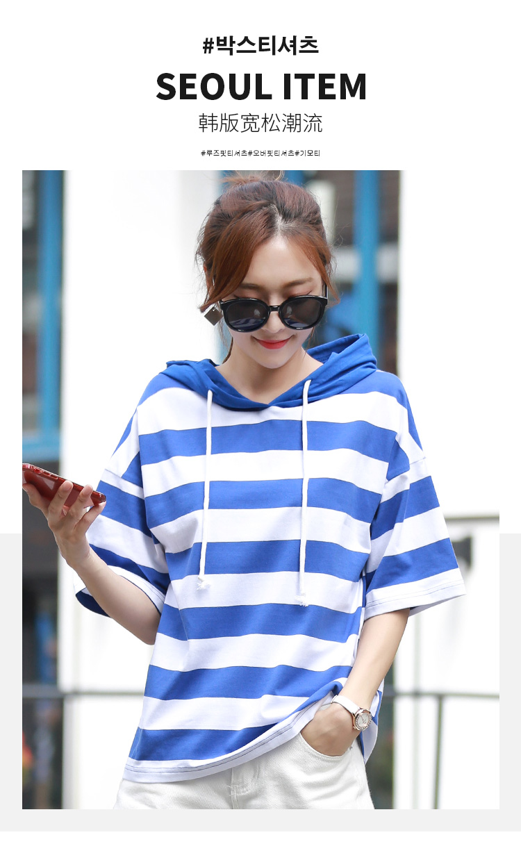 [2]短袖t恤女大碼寬松韓版條紋百搭連帽半袖夏裝2019新款上衣服