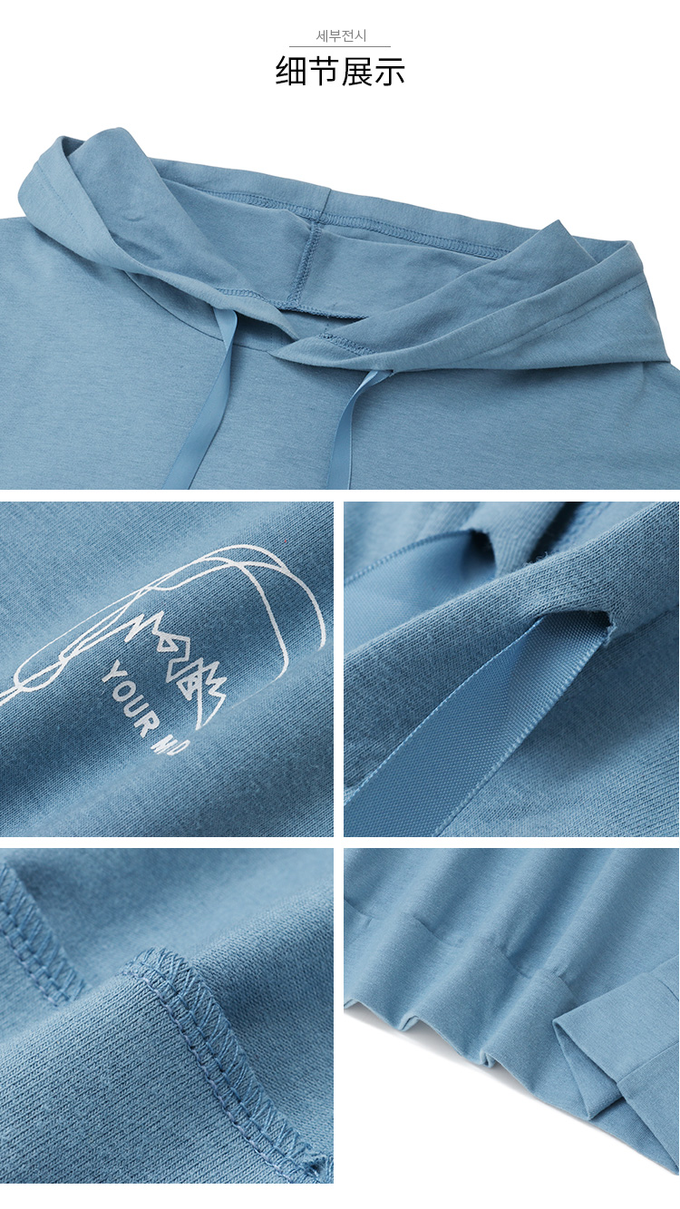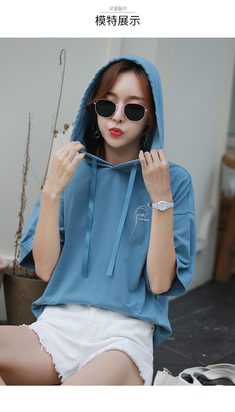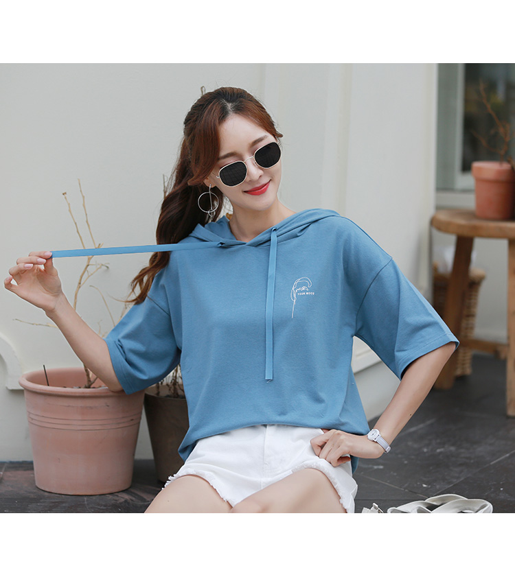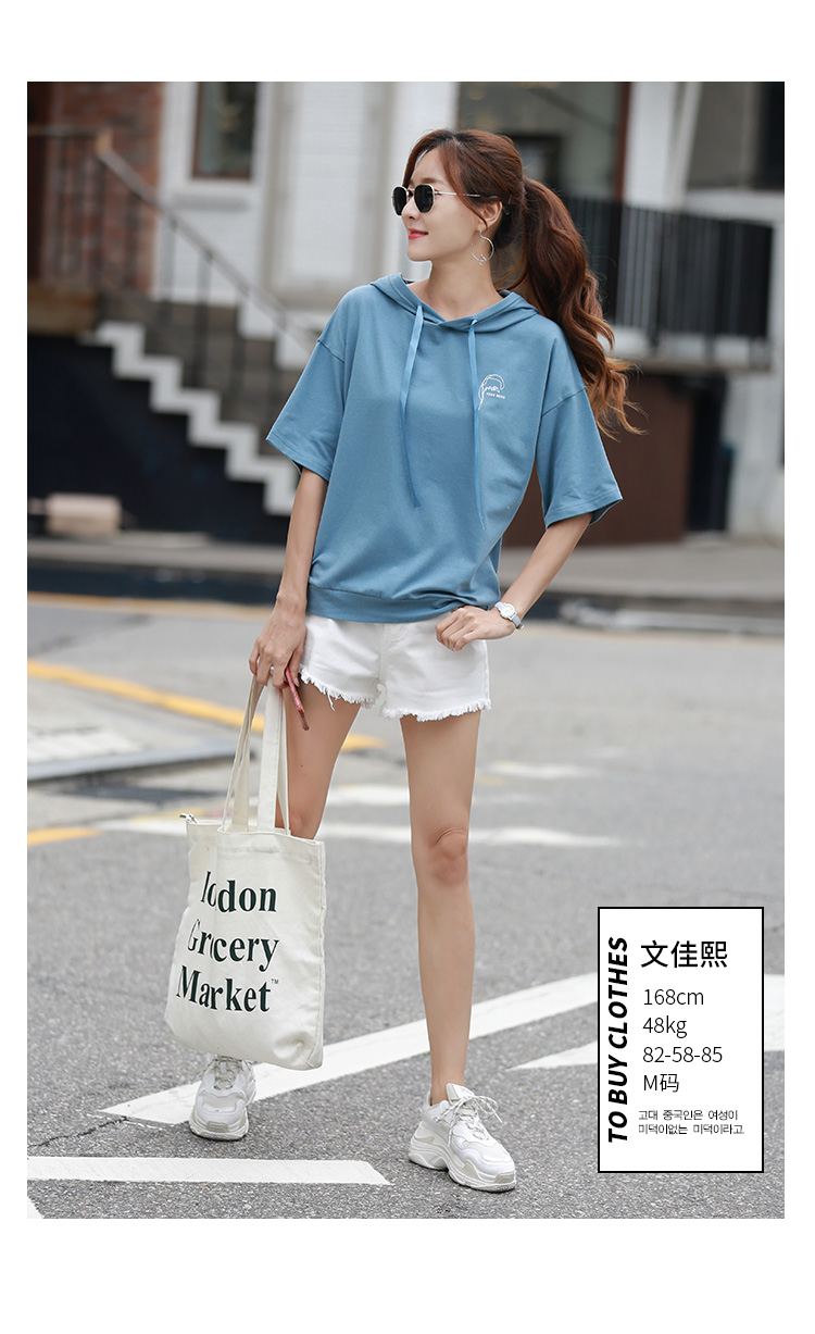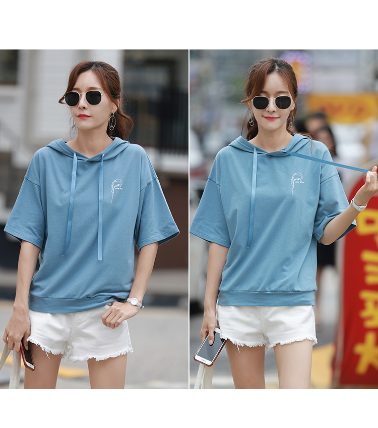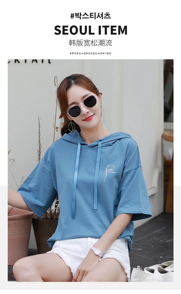 [2]短袖t恤女寬松韓版時尚百搭藍色連帽半袖體恤衫夏裝2019新款上衣
