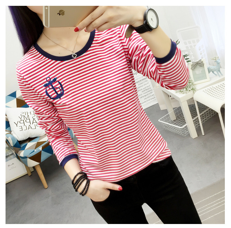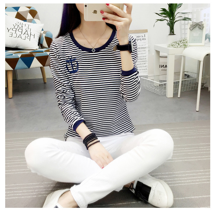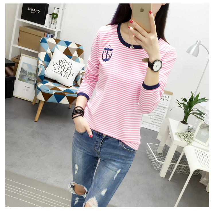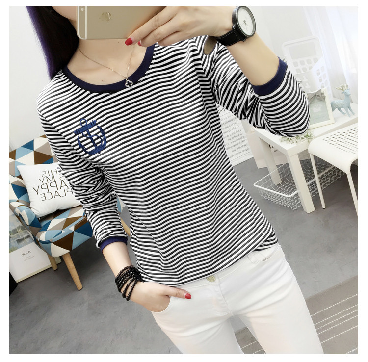 2018秋裝韓國女裝船錨純棉條紋長袖t恤女修身顯瘦體恤女打底衫潮