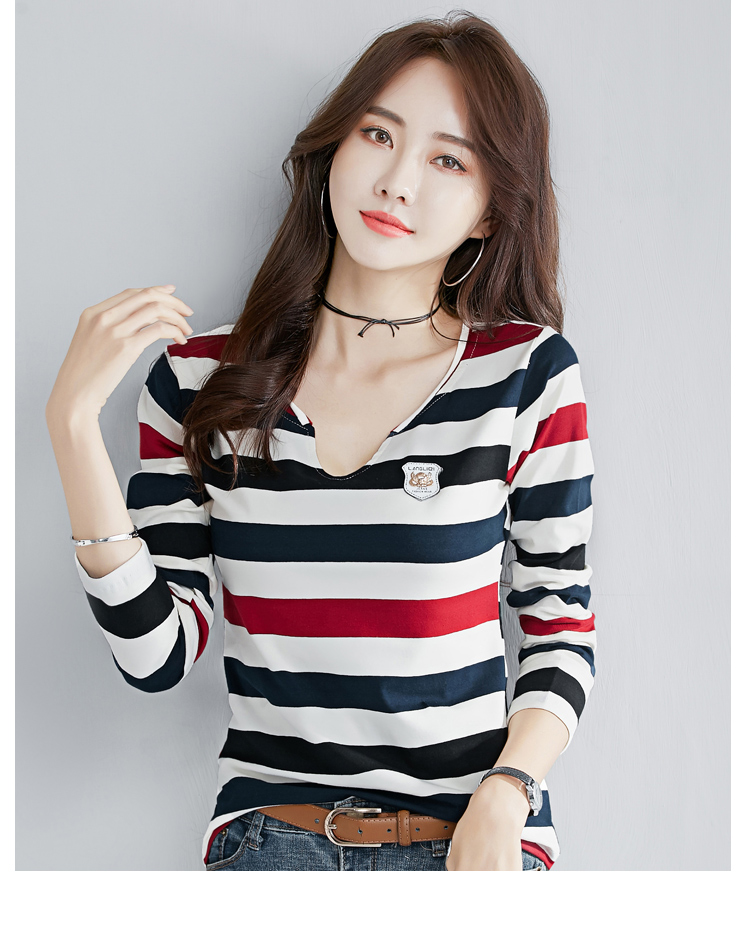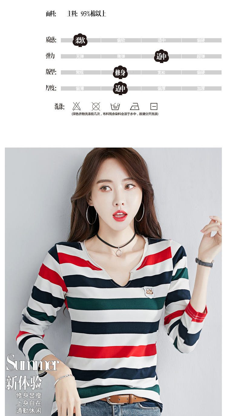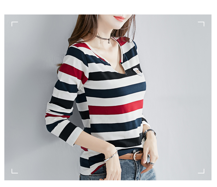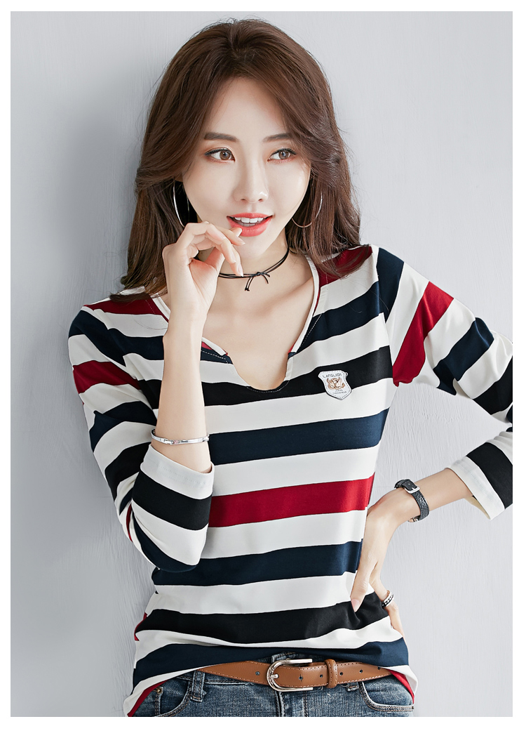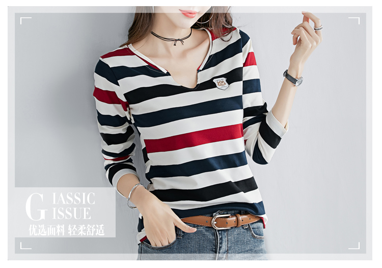 2019春季新款韓版修身條紋t恤女學生長袖上衣休閑純棉內搭打底衫