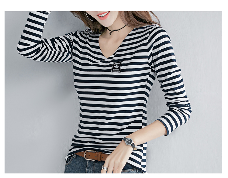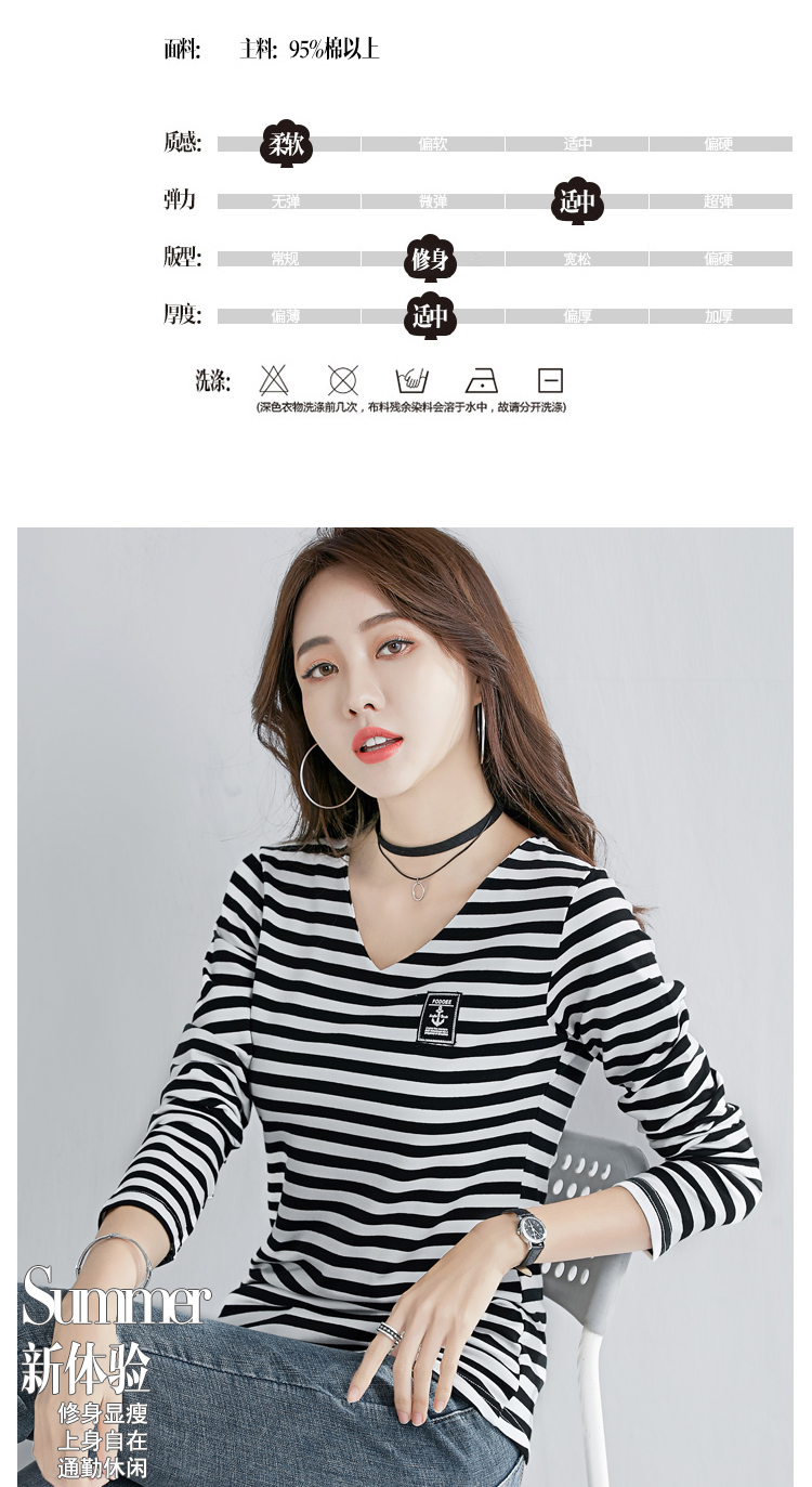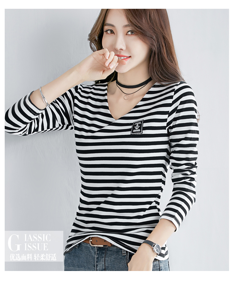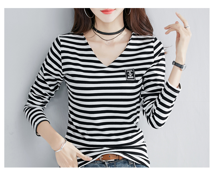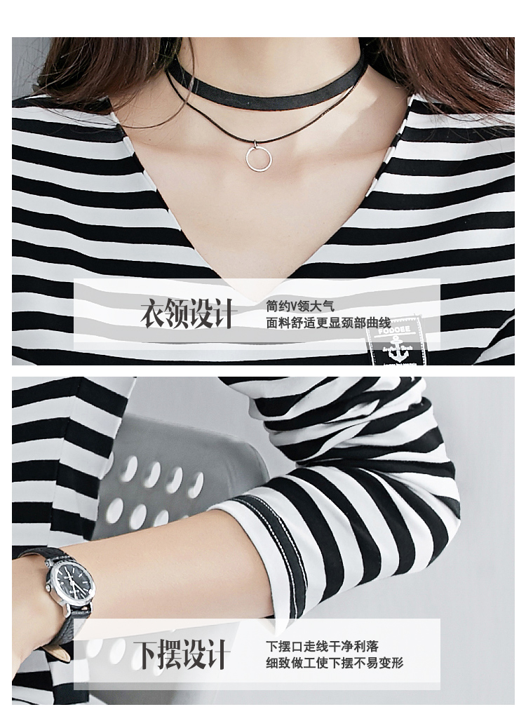 2019春季新款黑白條紋打底衫女長袖t恤棉百搭修身顯瘦體恤上衣服