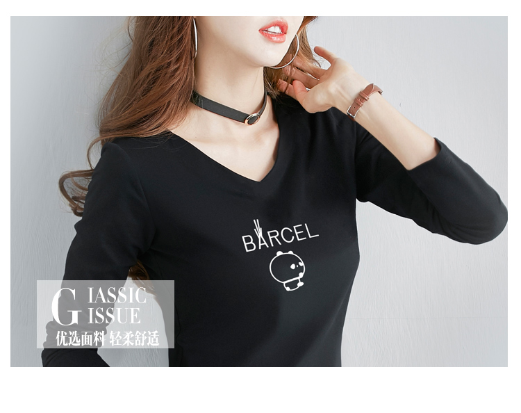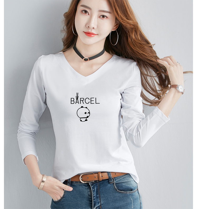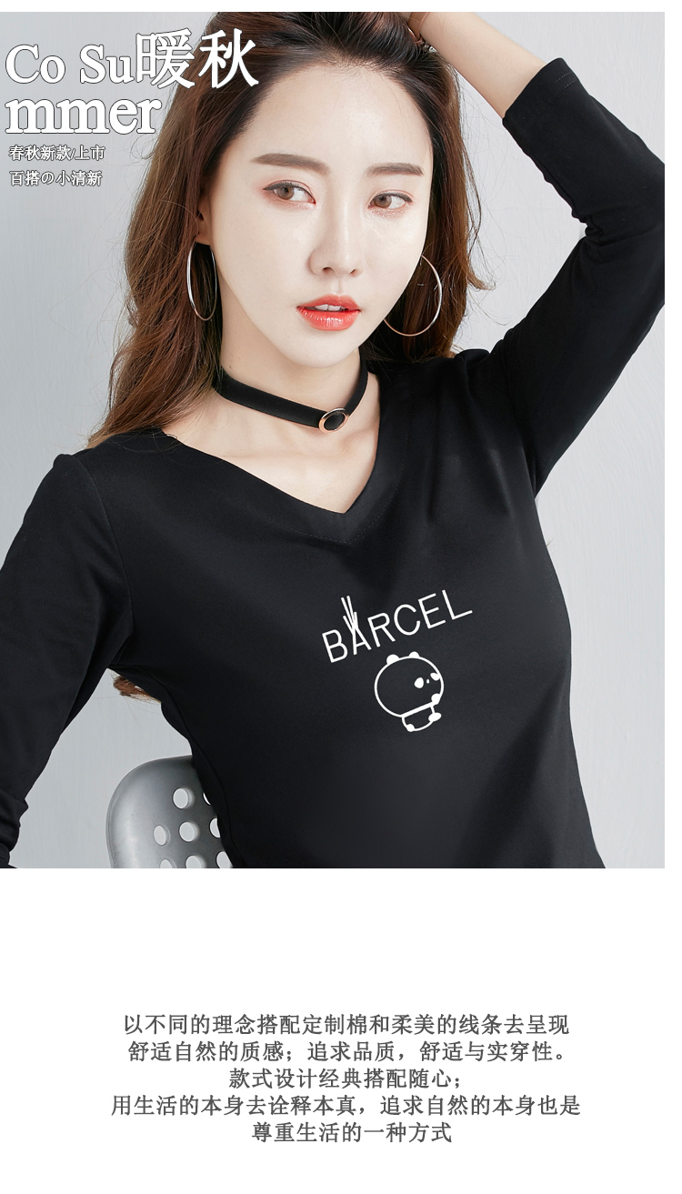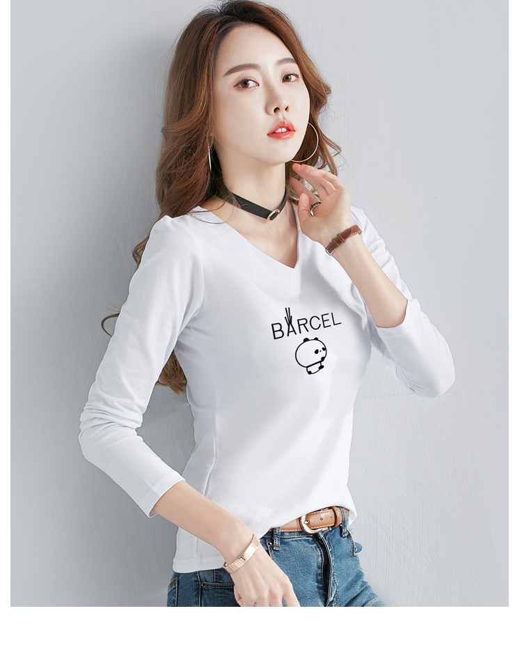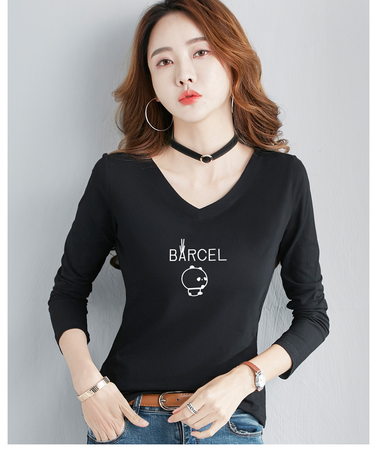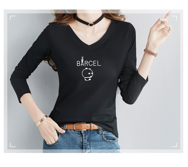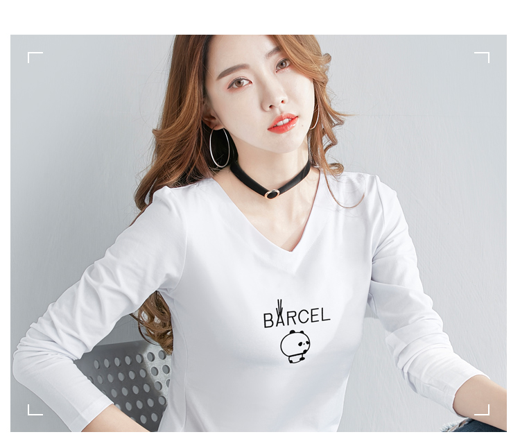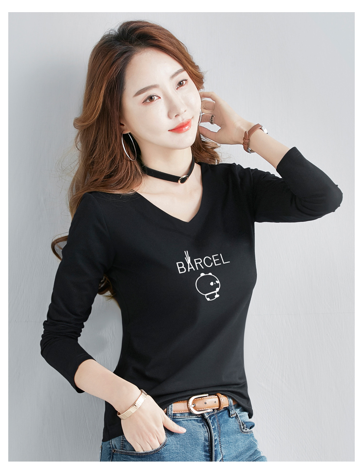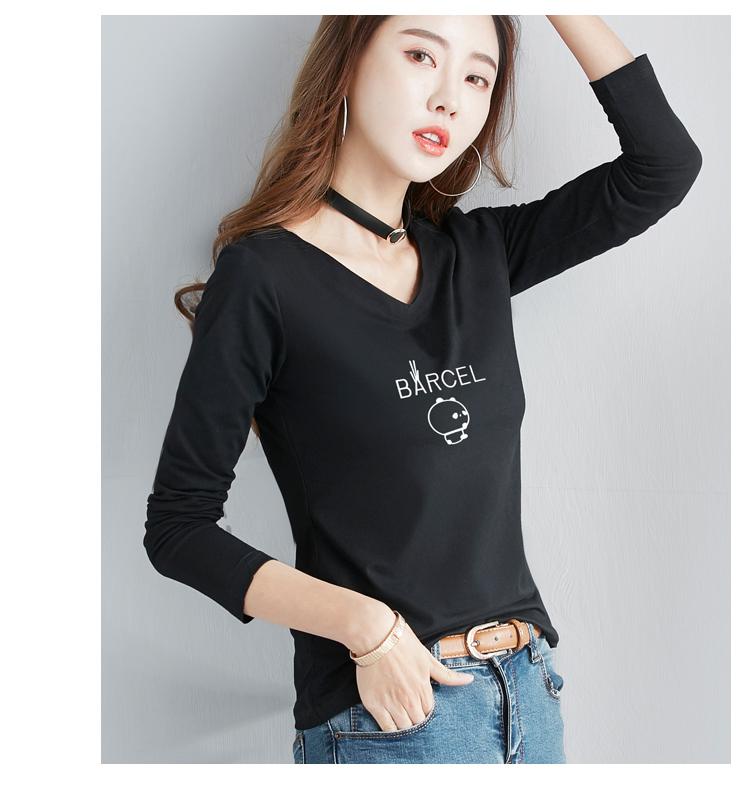 2019春裝新款V領純棉長袖t恤女上衣修身顯瘦字母韓版百搭打底衫潮