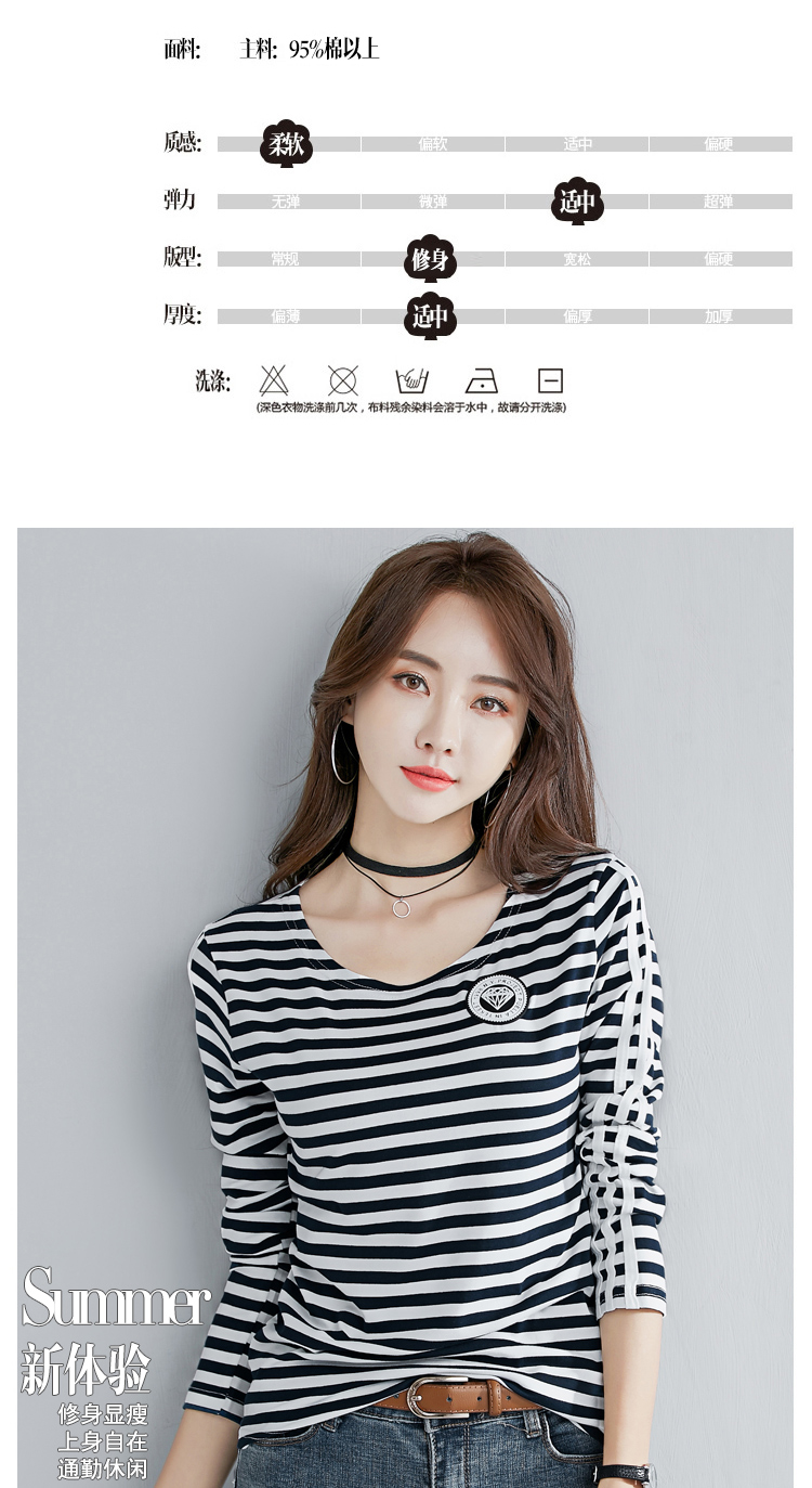 長袖t恤女黑白條紋修身純棉春裝上衣2019新款韓版百搭體恤打底衫