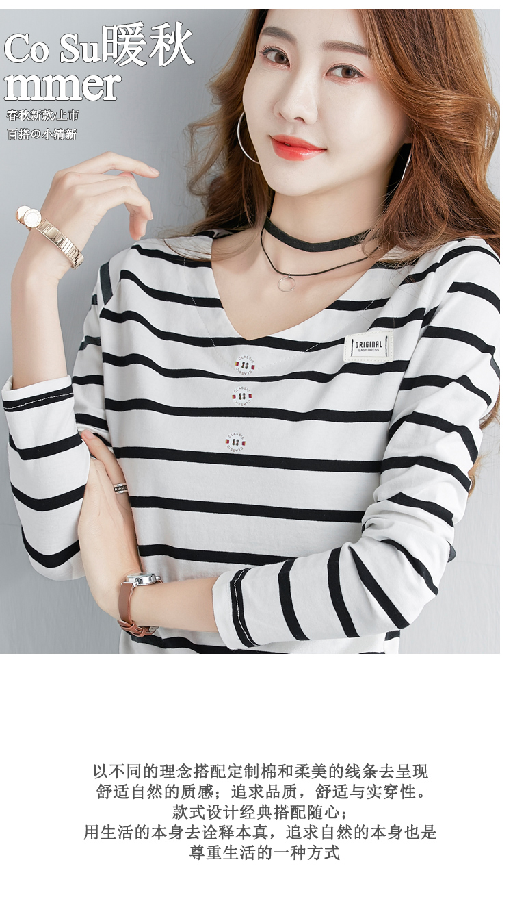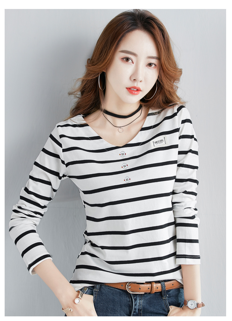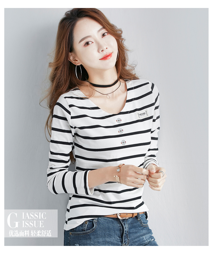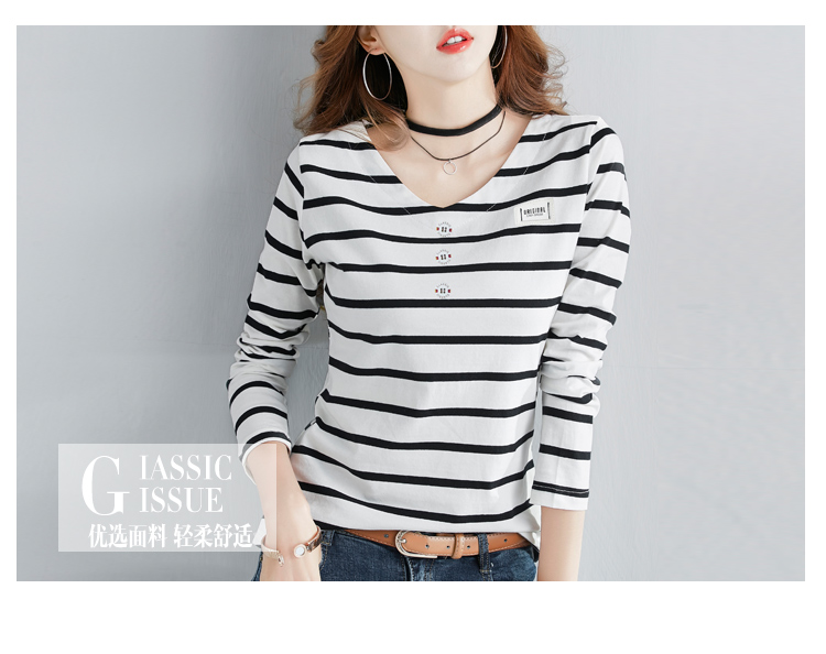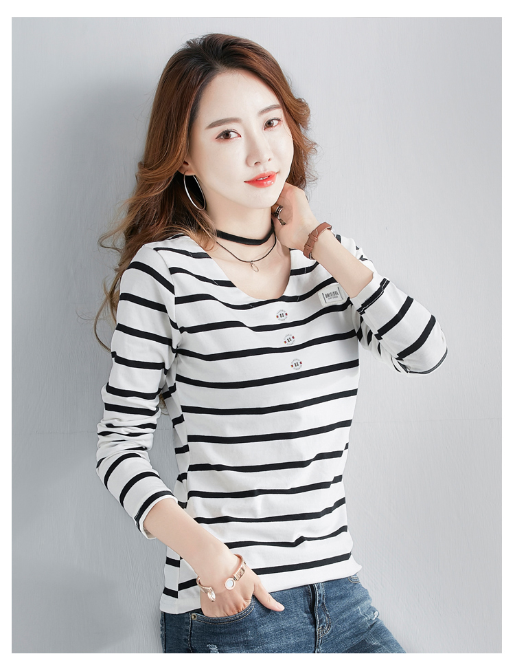 2019春裝新款韓版黑白條紋上衣女百搭顯瘦純棉打底衫長袖t恤女裝