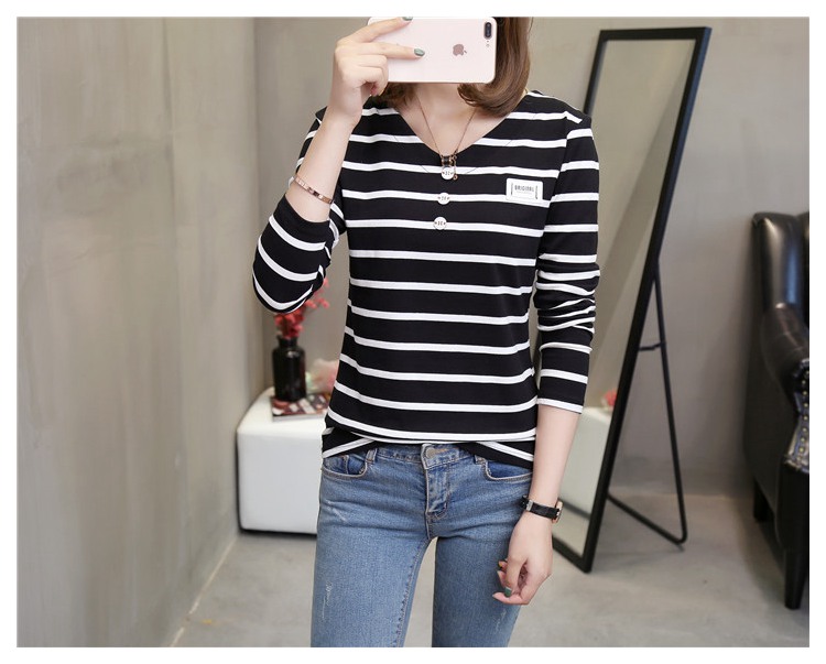 2018新款秋裝韓版條紋長袖t恤女修身顯瘦百搭純棉V領打底衫女上衣