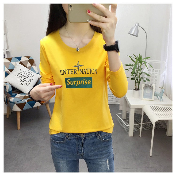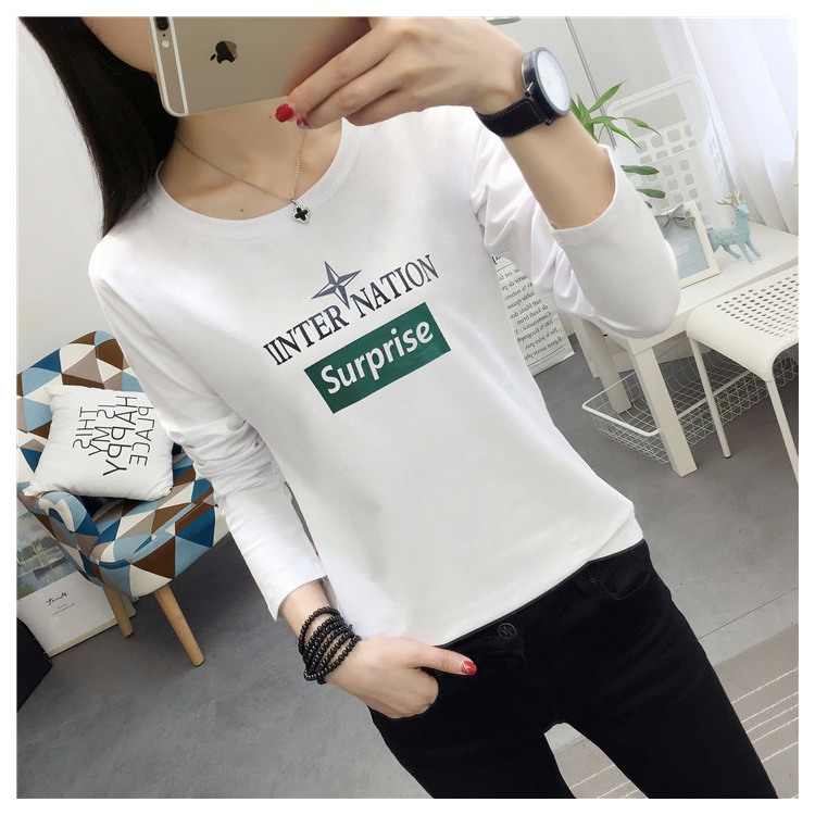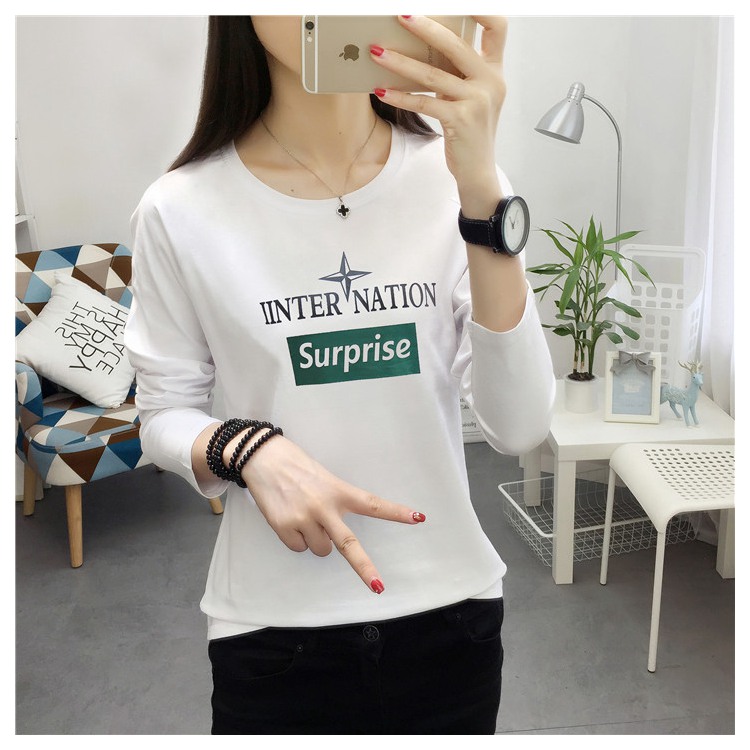 2018新款秋裝韓版長袖t恤女寬松字母百搭白色上衣學生純棉打底衫