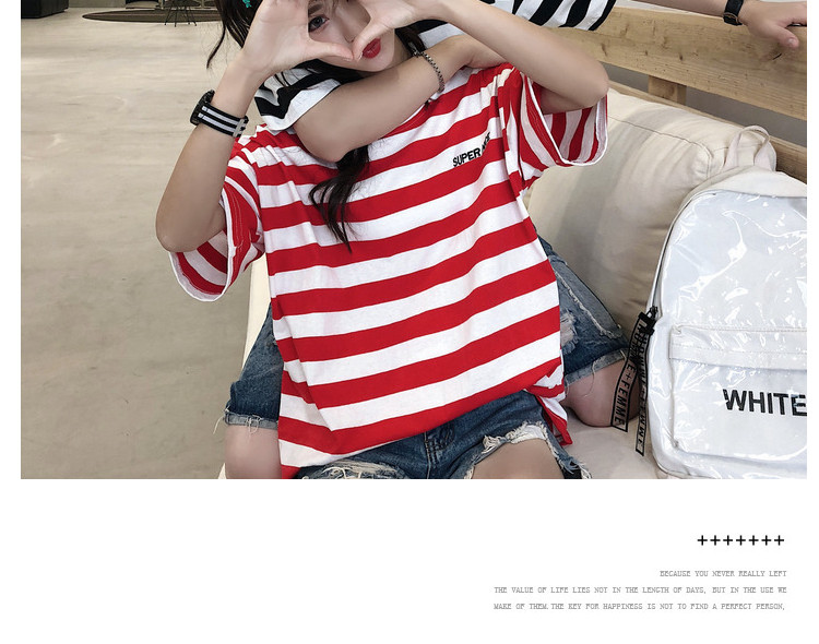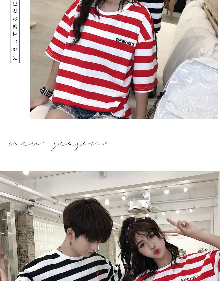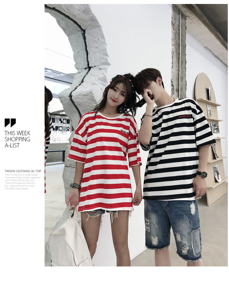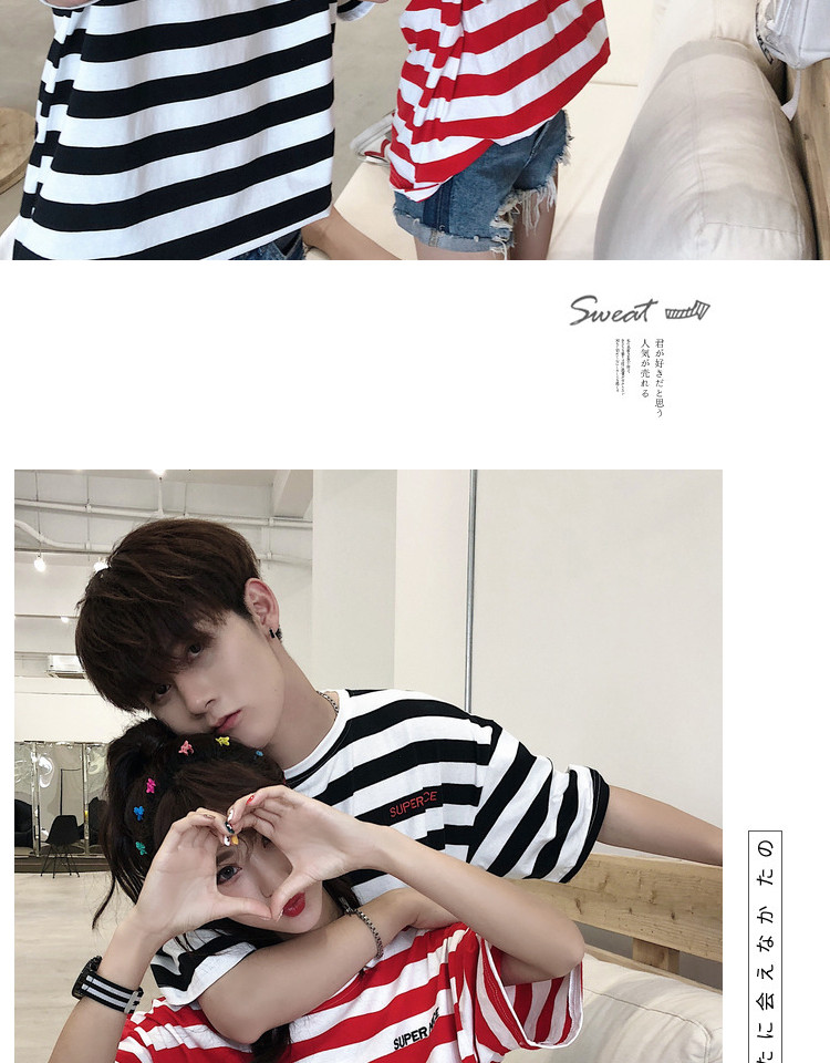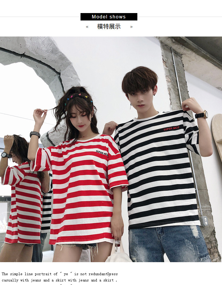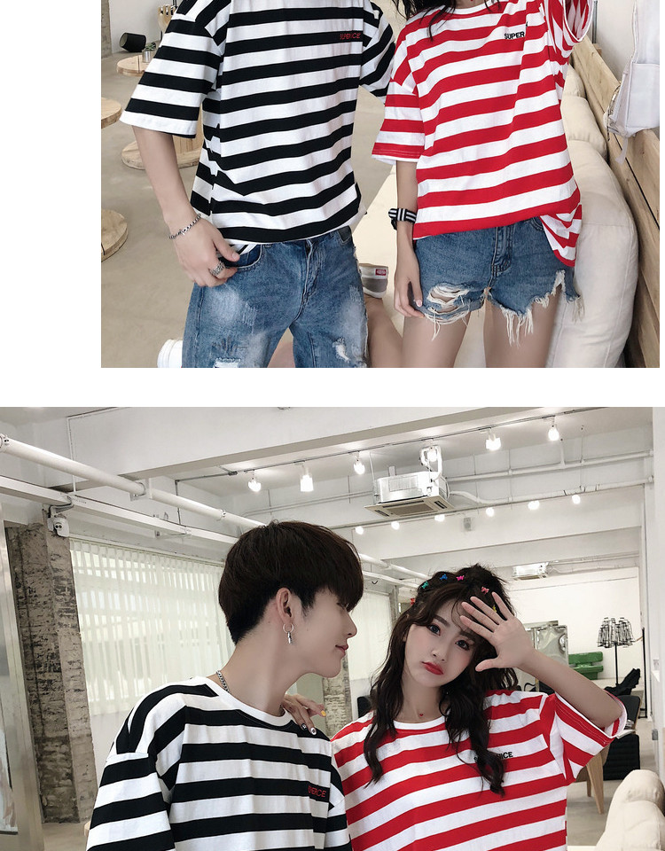 [2]情侶裝夏裝2019新款ins小眾設計感純棉短袖t恤女條紋寬松百搭班服