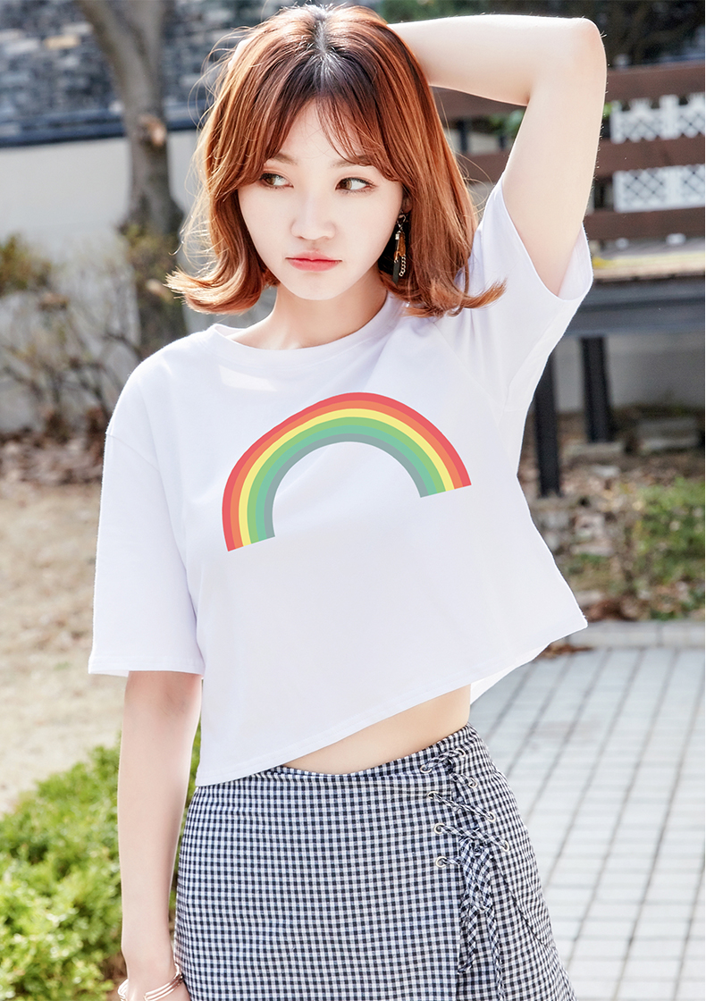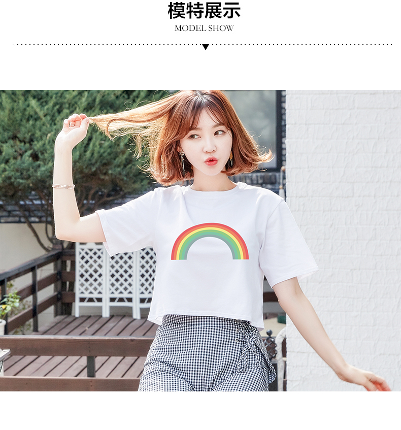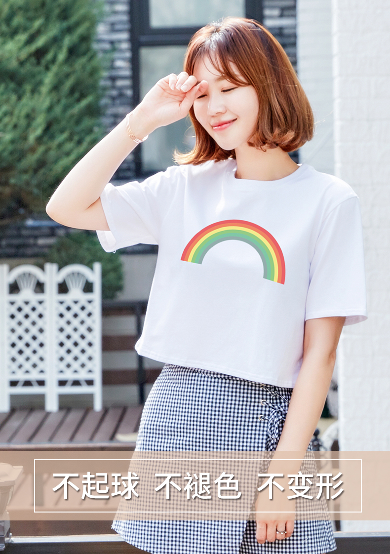 露臍上衣白色短款短袖T恤女彩虹夏裝寬松韓版高腰學生漏肚臍體恤