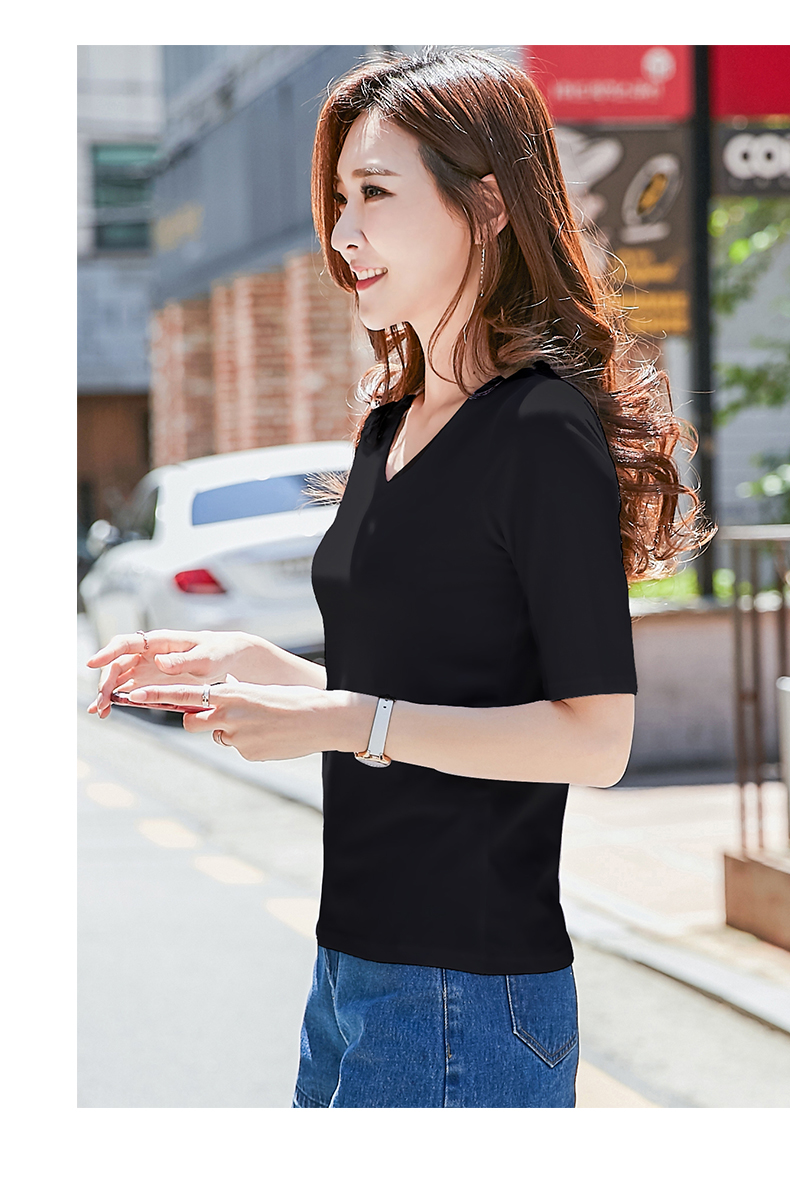黑色中袖V領T恤女2019新款春秋女裝韓版學生五分袖純棉純白色上衣
