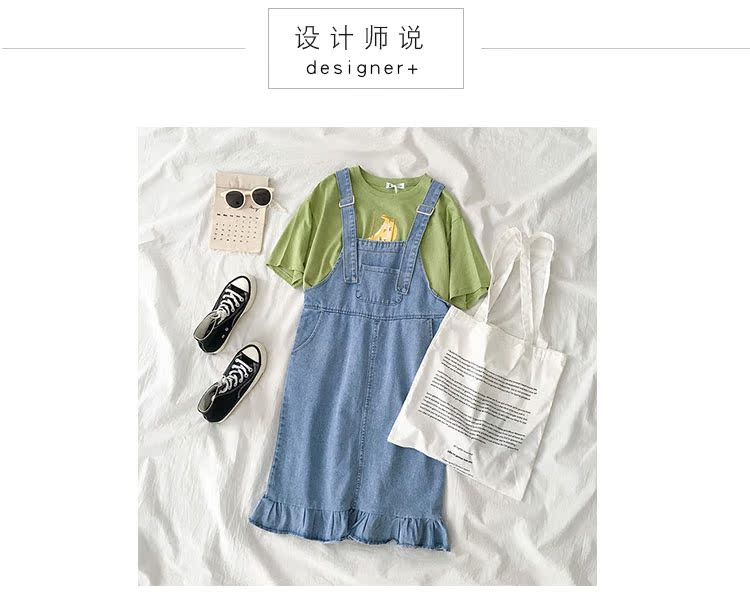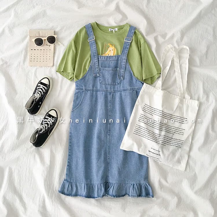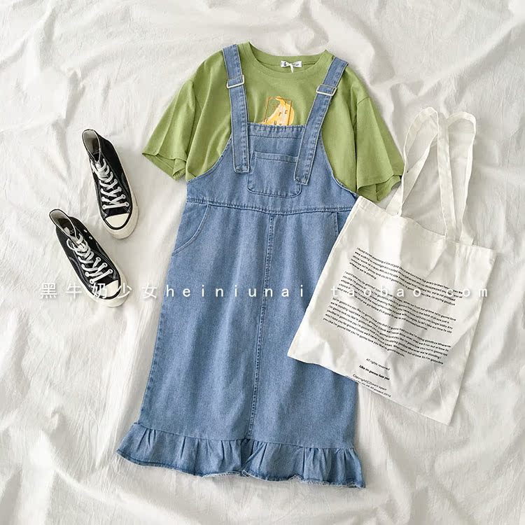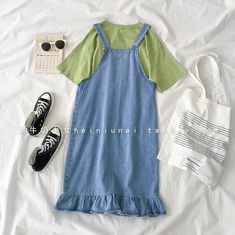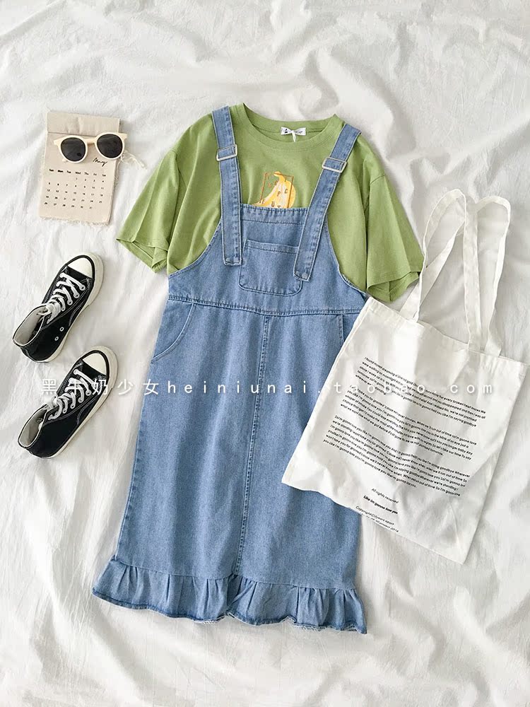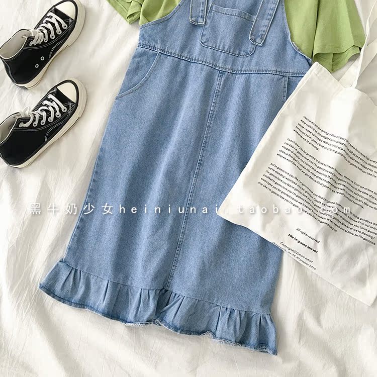 下身是牛仔背帶裙 荷葉邊裙擺 穿出你的小個性