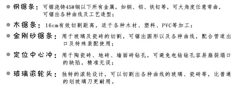 新鋸,原單出口日本,泰國,馬來西亞等國家,功能優化,是以前任何一款都無法相比的,不論是做工還是耐用度都比以前任何一款強,我們的產品在線下與馬來西亞合作過多次! 性價比比較好的一款產品, 方便模型制作的使用,迷你卻又不乏使用! 本產品具有設計巧妙,美觀 ,符合人機功能學原理,經久耐用,攜帶方便等特點。僅用一把鋸就可以輕松自如地切割,加工金屬,木材,塑料,橡膠,玻璃,瓷磚等一般家庭常見的各種材料。線鋸可安裝不同角度,根據不同角度,可以加直線,弧形,圓形,波浪形等各種幾何形狀。 產品被廣泛用于建筑,裝潢,工藝品加工,廣告制作,DIY制作等各種行業,以及作為登山,釣魚等戶外休閑活動和家庭的工具。 鋸身:外帶掰玻璃用槽口設計,可以安裝不同鋸條,順著手用力便可輕松切割,無需電源,即可實現曲線鋸的功能; **鋼鋸條:可鋸澆鑄45#鋼以下所有金屬,如銅、鋁、鐵、釘等,可大角度任意彎曲,可鋸出各種曲線及工藝造型;木鋸條:16cm有效切割距離,適于各種小型木材、塑料、PVC等加工。 *金剛砂鋸條:用于玻璃及瓷磚的切割,可鋸出圓形以及各種曲線,配合管道出口及特殊裝配使用; *定位中心沖:用于陶瓷磚、地磚、墻面磚鉆孔,可避免電鉆鉆孔容易崩裂塌口的缺陷,無誤; *玻璃滾輪頭:獨特的滾輪設計,可以切割出各種曲線的玻璃、瓷磚等,比普通的劃玻璃刀更耐用; 適于:鋸木、PVC、塑膠、金屬、陶瓷、瓷磚等 含鋸身帶刀頭1副、鋼鋸條5根、金剛砂鋸條2根、木鋸條1根、定位中心沖2個。 鋼鋸條:150mm;金剛砂鋸條150mm;木鋸條:180mm