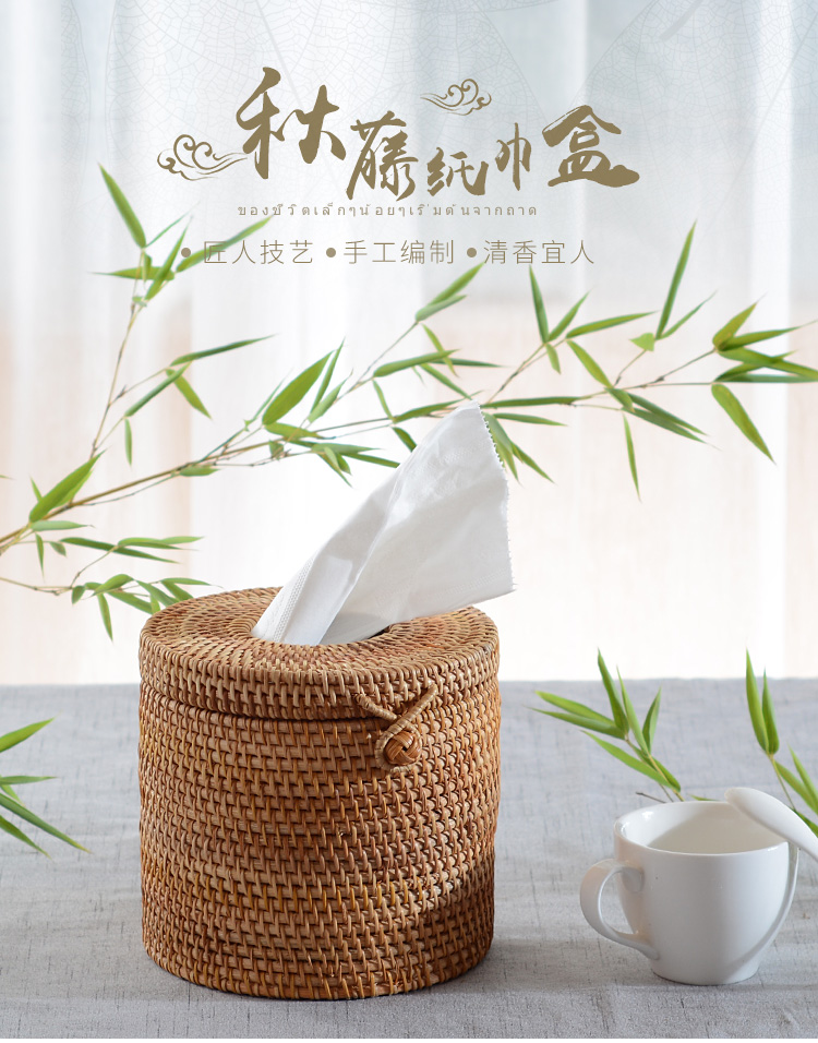 越南藤編圓形紙巾盒手編紙抽盒桌面紙巾收納盒秋藤編紙筒手工藝品