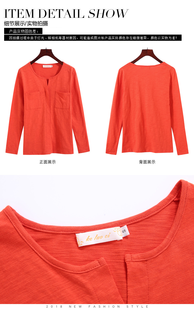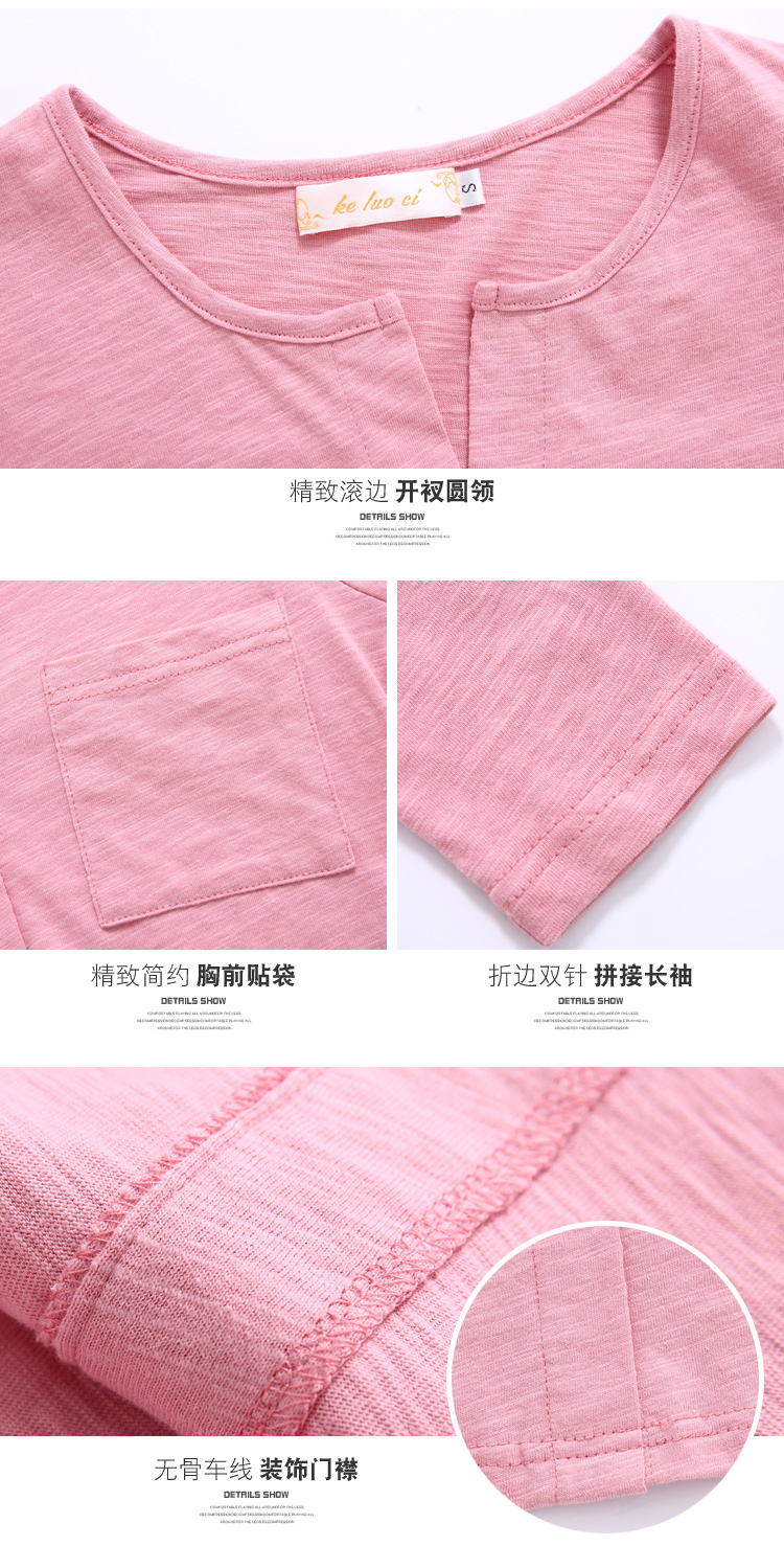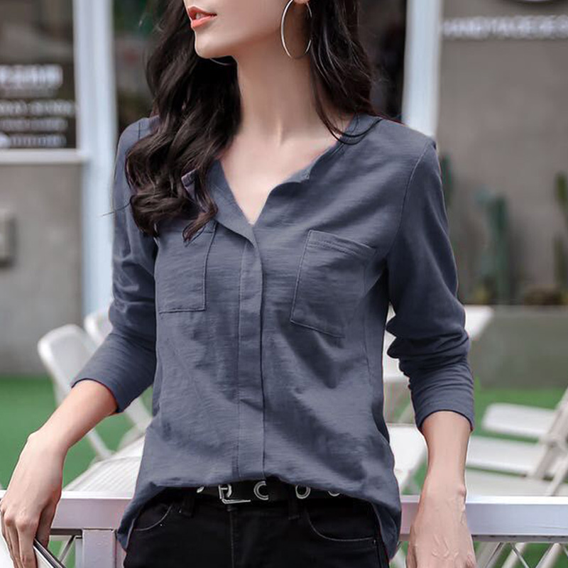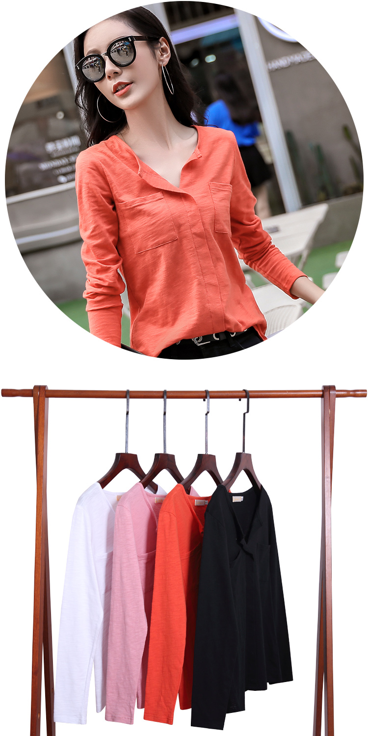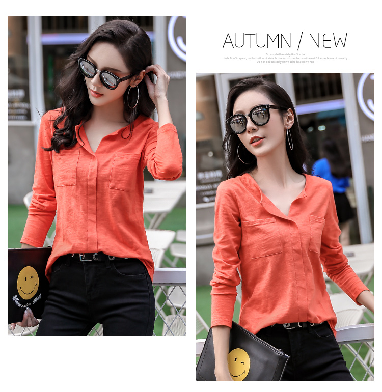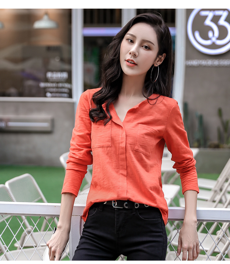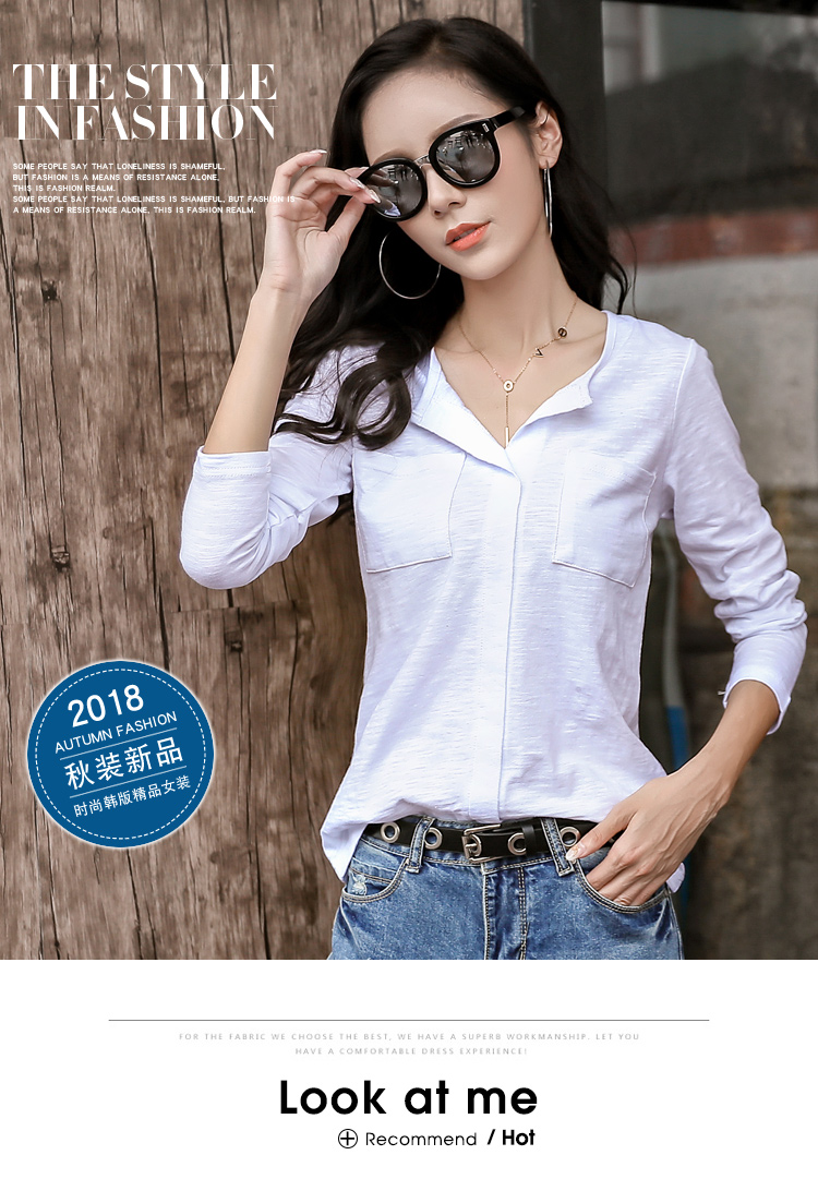 2019秋裝新款韓版竹節棉長袖t恤女寬松大碼純色打底衫純棉v領上衣