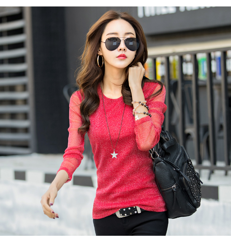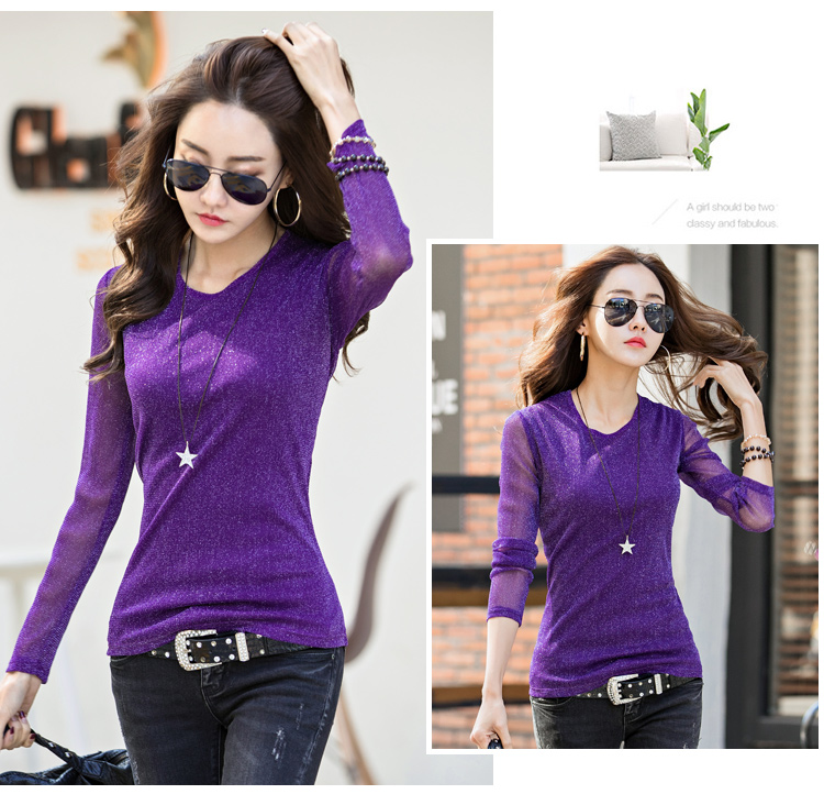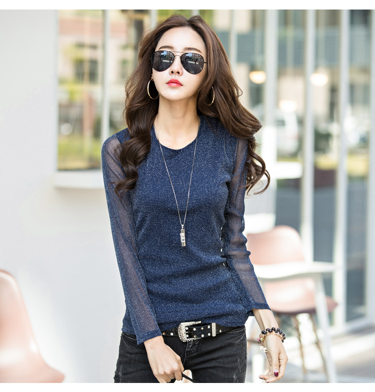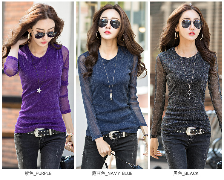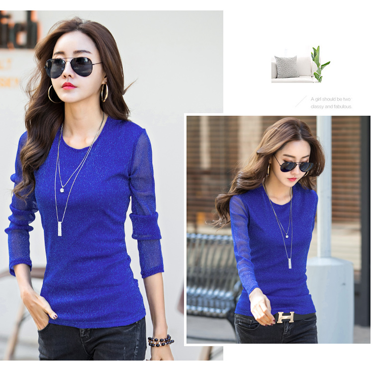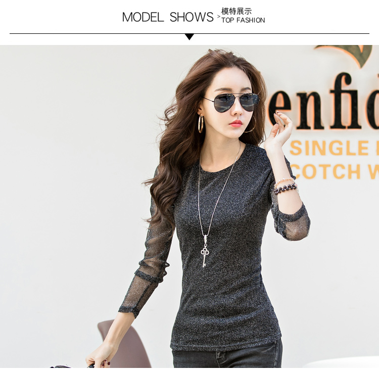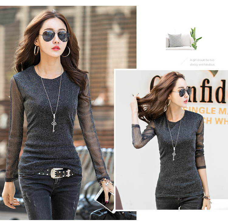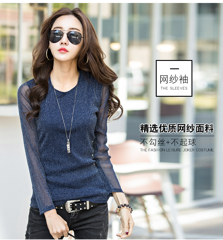 2019秋裝新款女裝韓版亮絲打底衫修身網紗長袖t恤胖妹妹大碼體恤