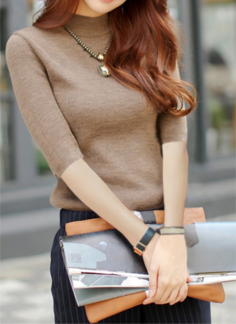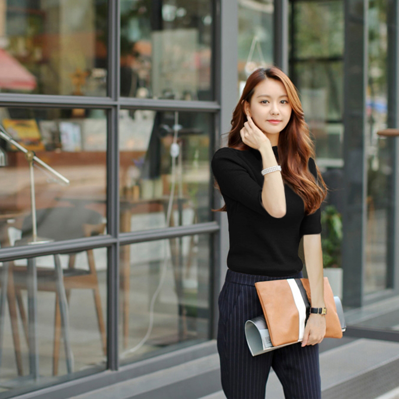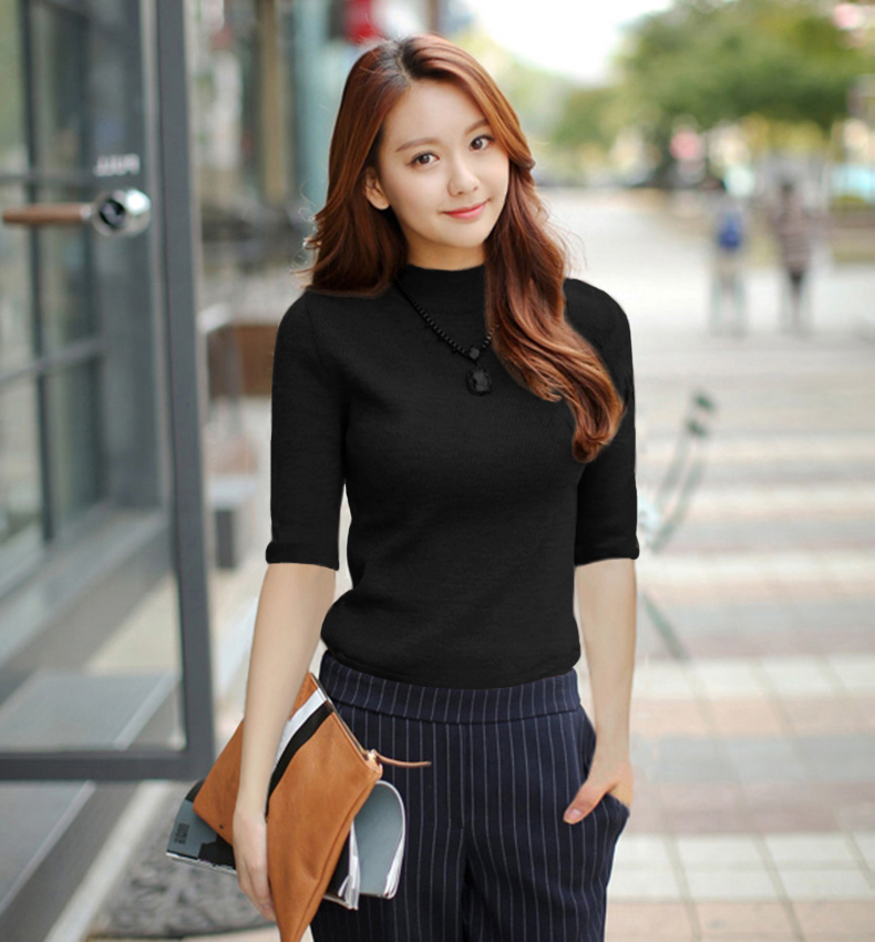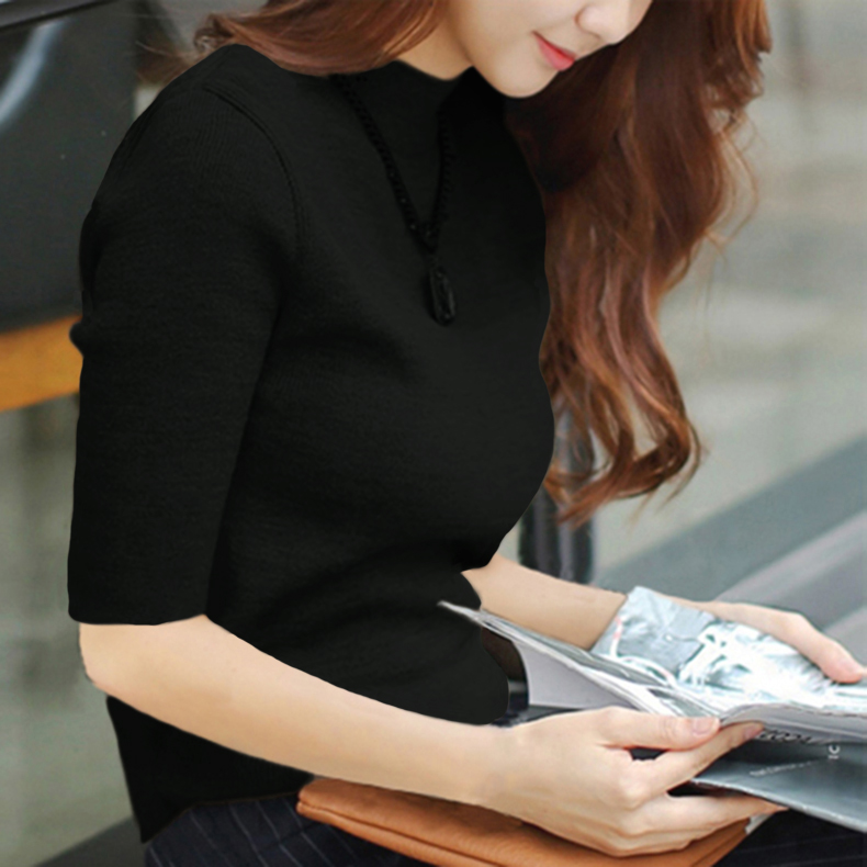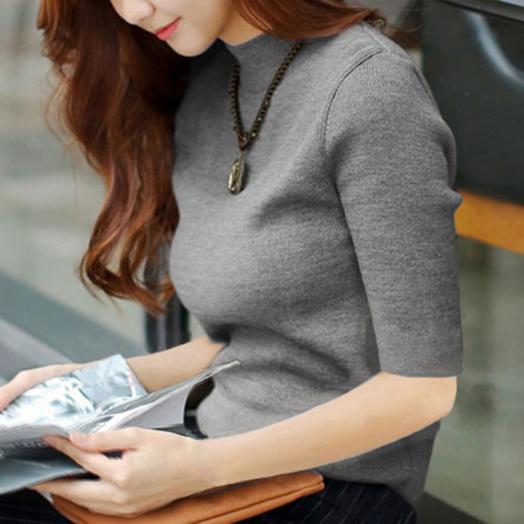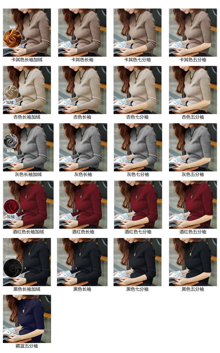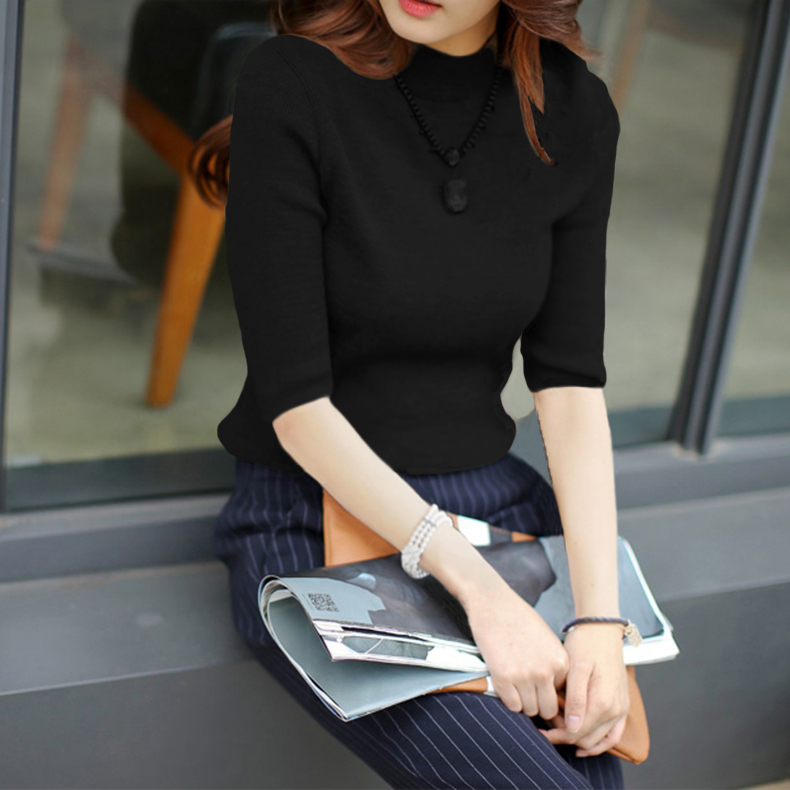 2019秋裝新款韓版五分袖針織t恤女修身中袖半高領打底衫女士上衣