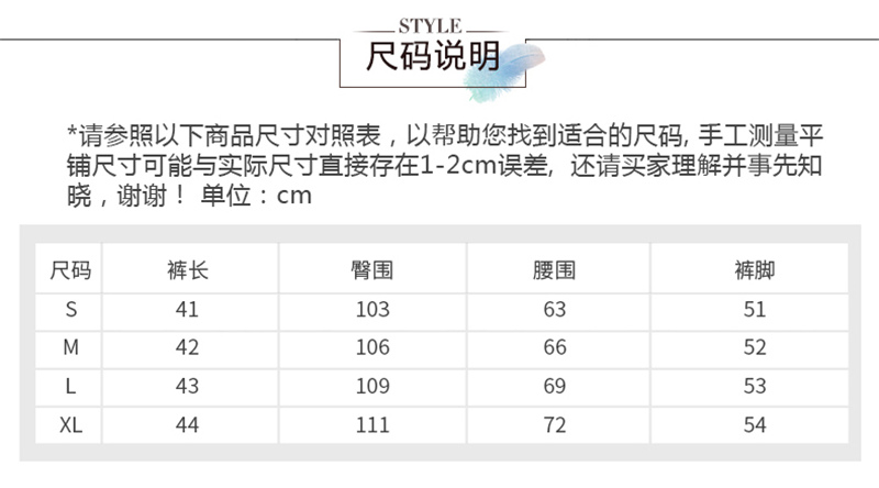 本款寶貝質量保證,做工精美 不褪色 好質量 實物拍攝,請大家放心購買 用心對待每一位顧客---努力做好每一款衣服 我們鄭重承諾:檢查每一個位置,剪好每一個線頭,不合格不發貨! 有什么問題及時與我們聯系,收貨不是終點,服務不會停止~ 7天無理由退換貨,優質售前,售后 新品上架 面料舒適 關注店鋪 優先發貨 SIZE尺碼表 S:腰圍:63臂圍:103 褲長:41 褲腳:51 M:腰圍:66臂圍:106 褲長:42 褲腳:52 L:腰圍:69 臂圍:109 褲長:43 褲腳:53 XL:腰圍:72 臂圍:112 褲長:44 褲腳:54 ◆備注:手工測量 單位:cm