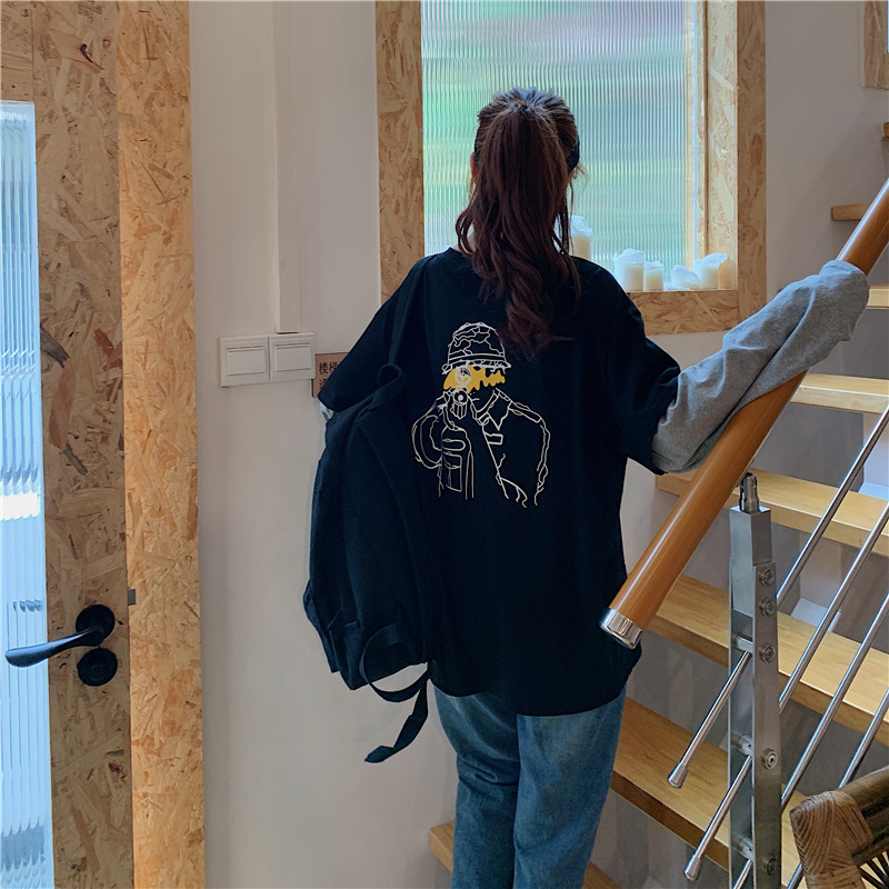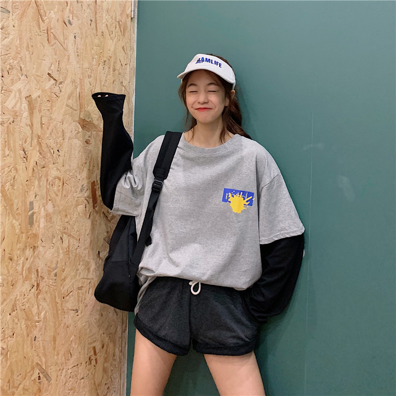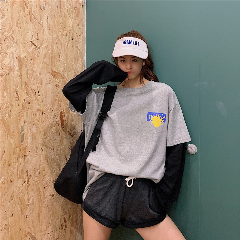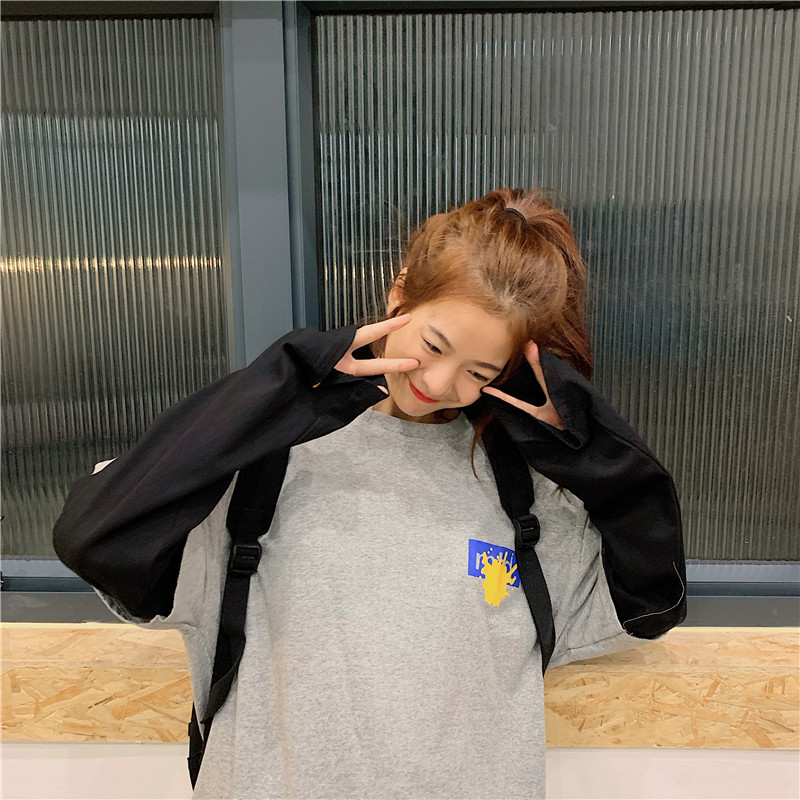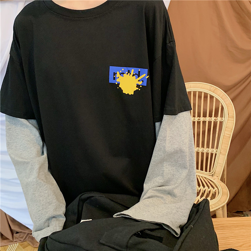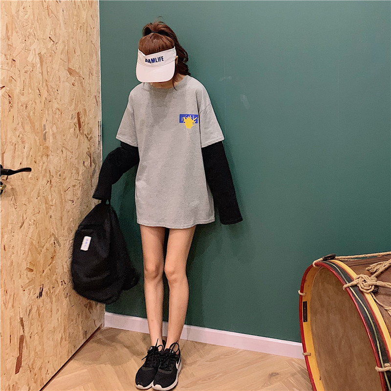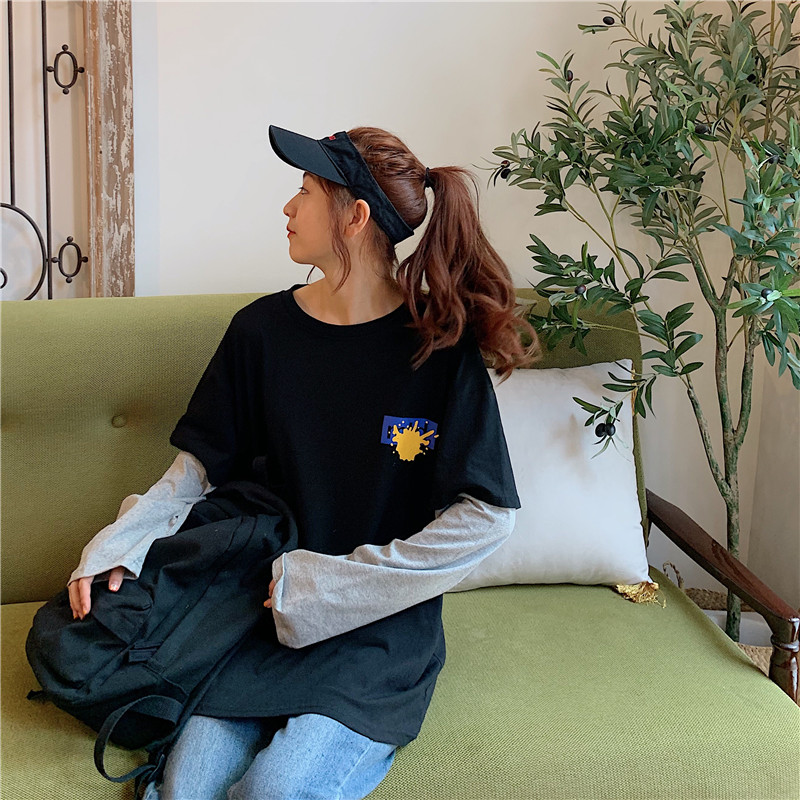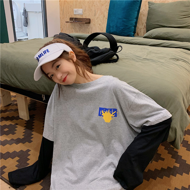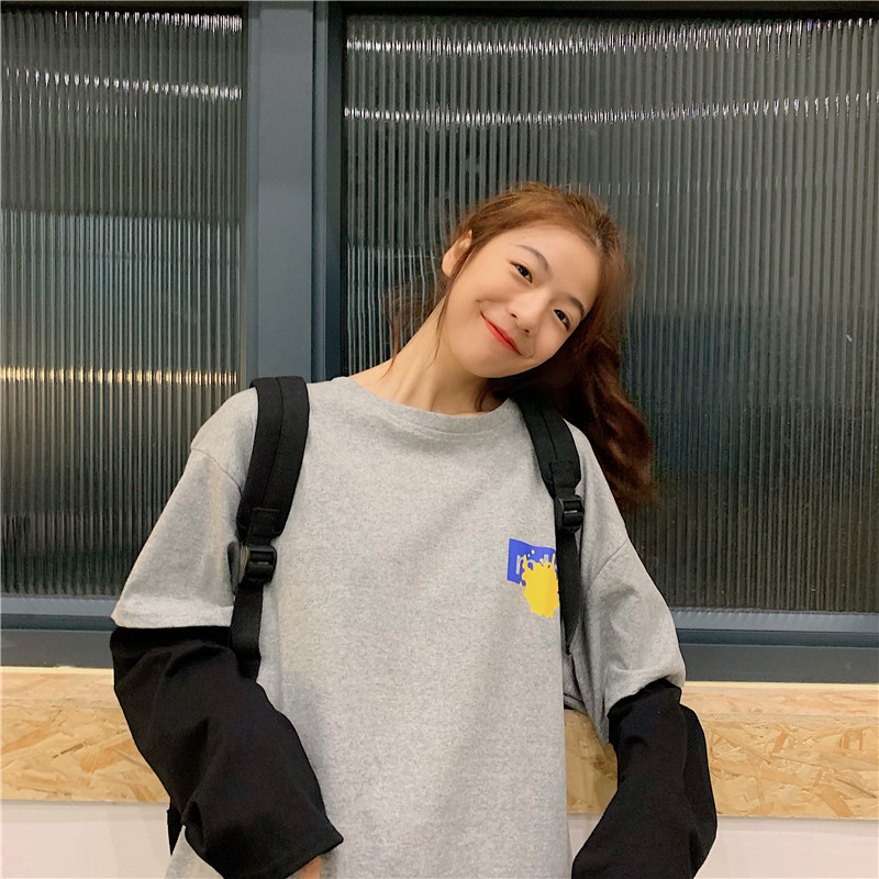 韓國長袖t恤女2019早秋bf風寬松學生上衣服拼接假兩件打底衫潮ins