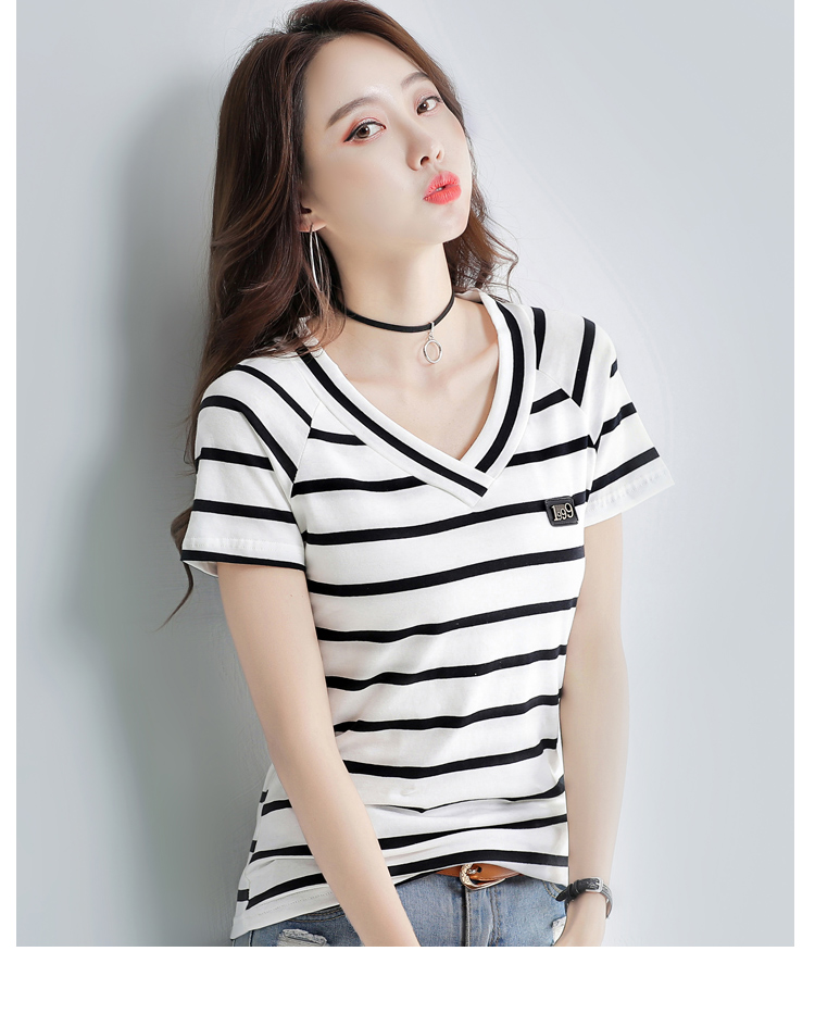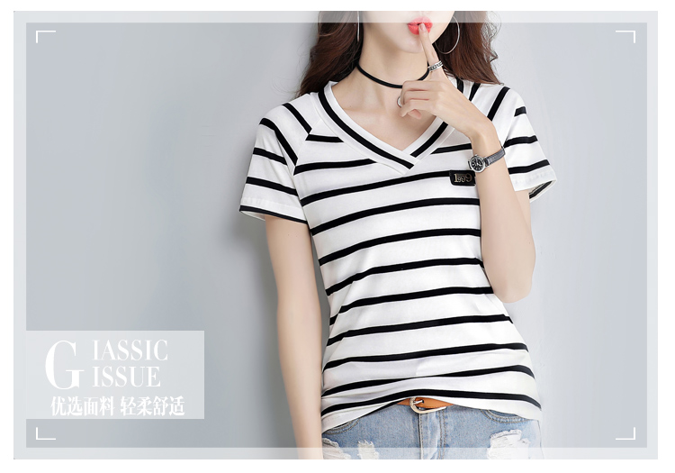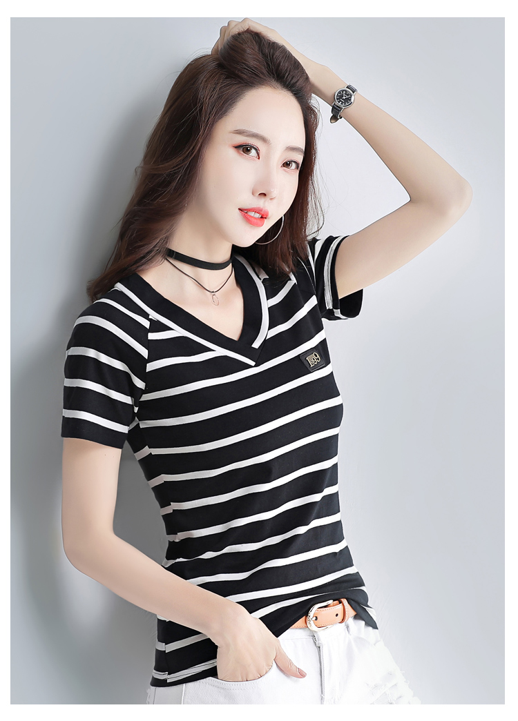 2019夏裝韓版新款純棉V領女T恤百搭修身條紋拼接短袖女上衣打底衫