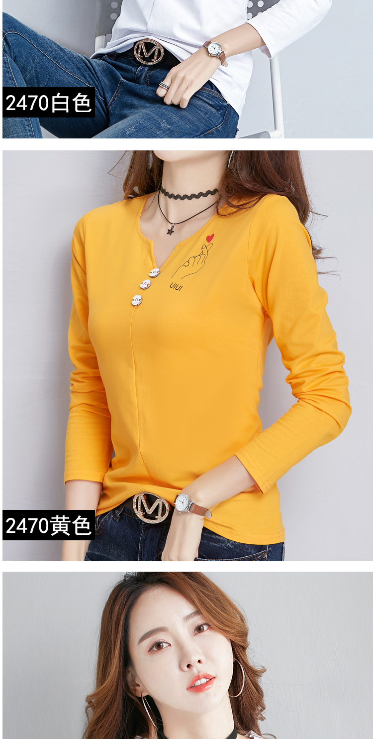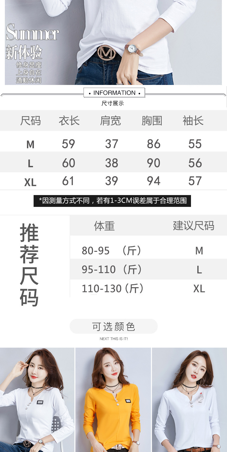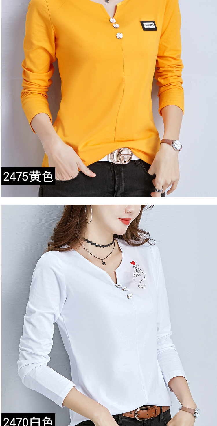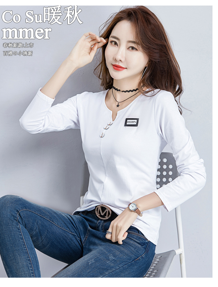 2019秋裝新款V領純棉上衣女修身紐扣韓版百搭t恤時尚長袖打底衫女