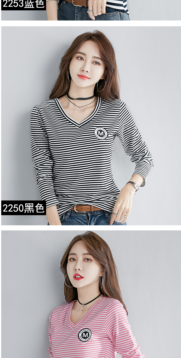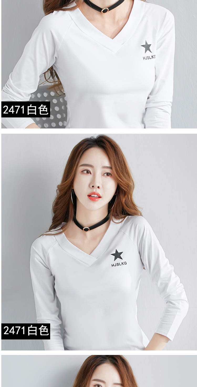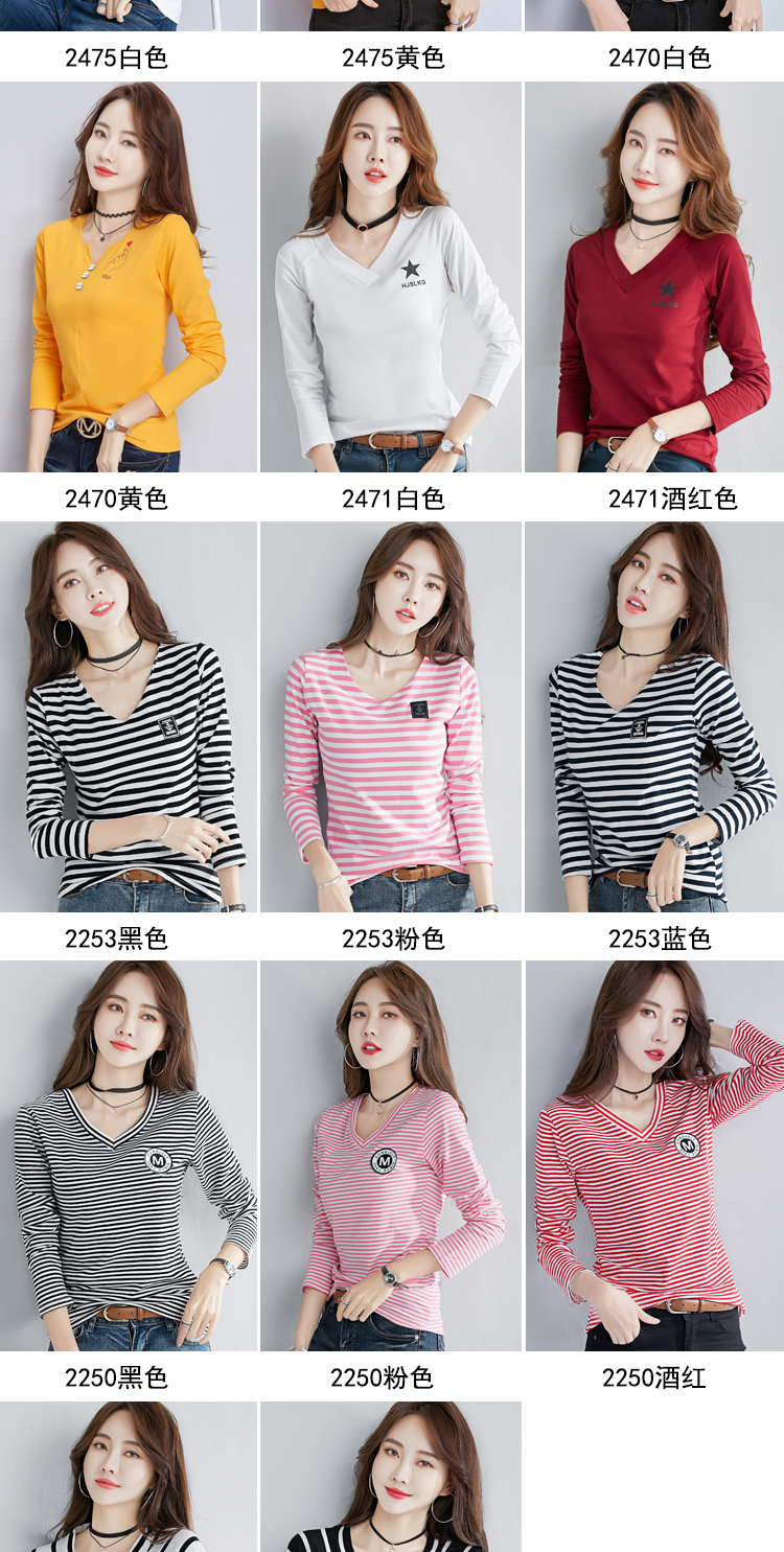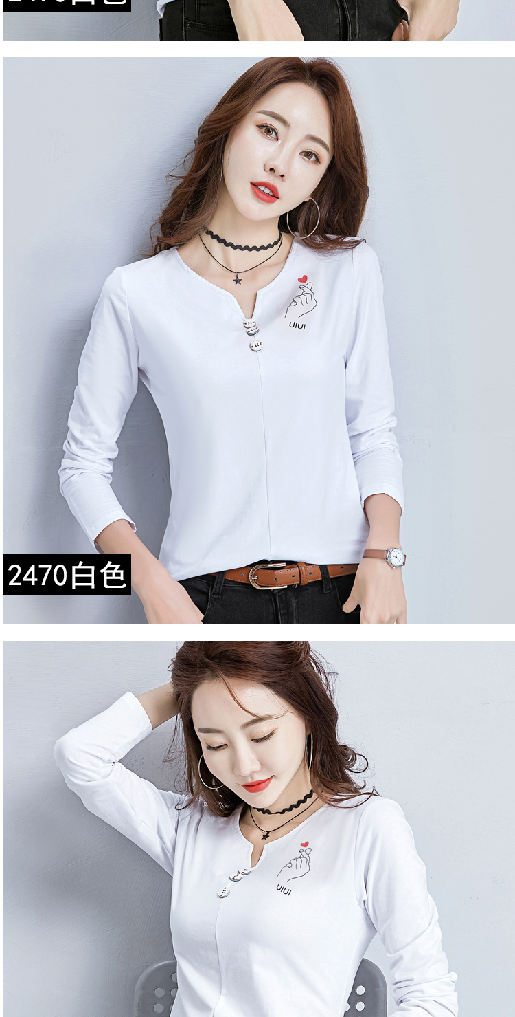 2019秋裝新款V領純棉上衣女修身紐扣韓版百搭t恤時尚長袖打底衫女