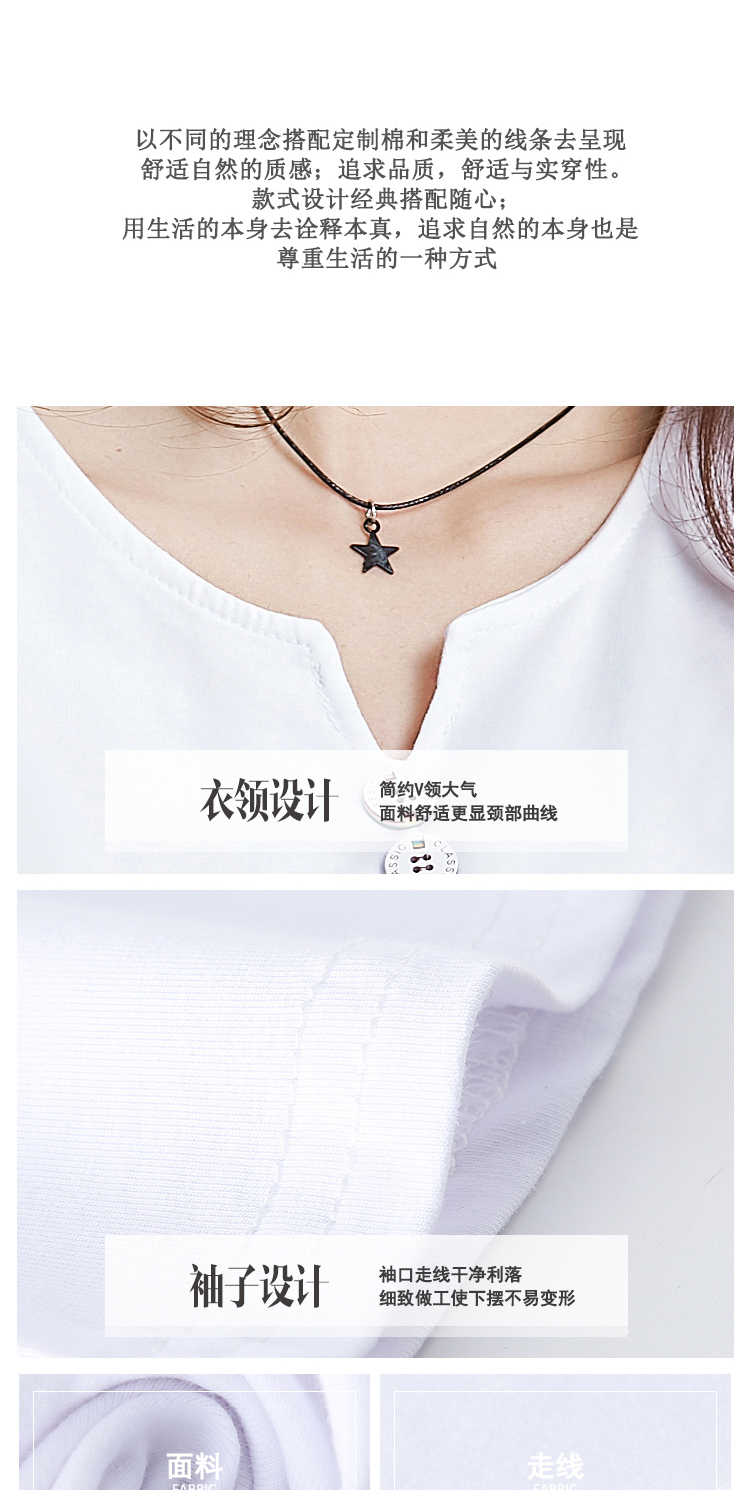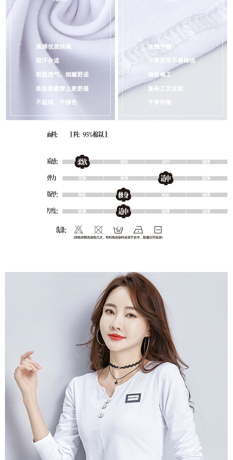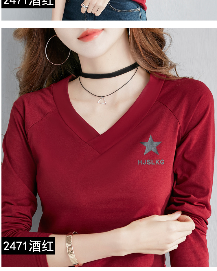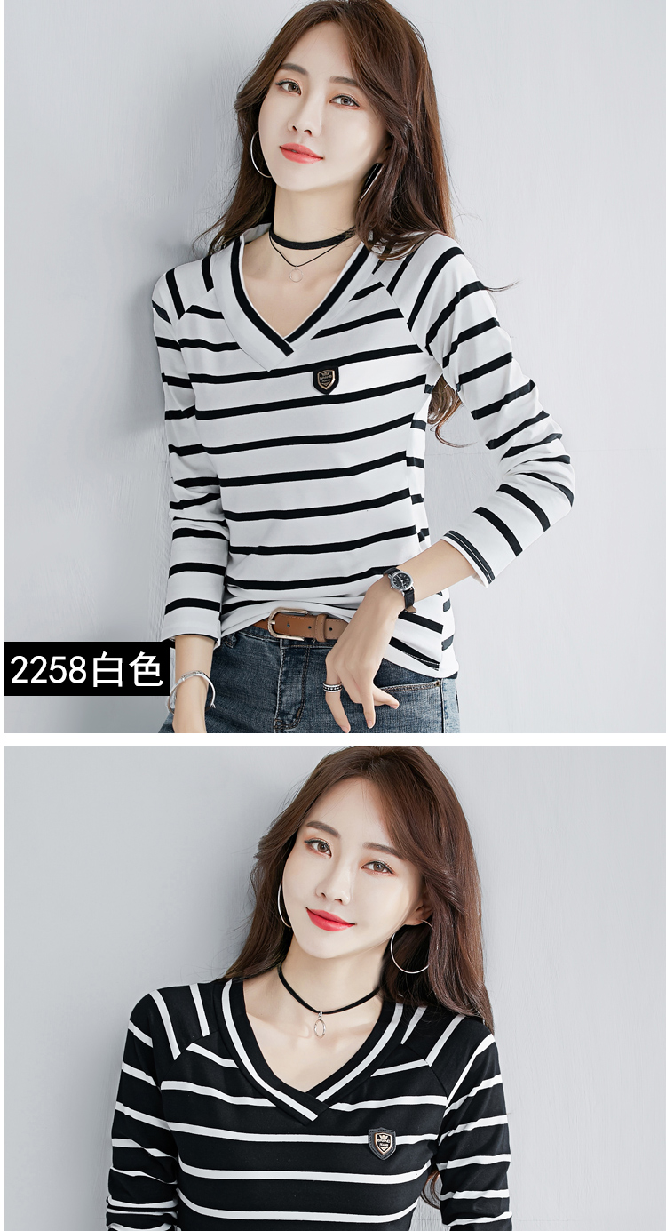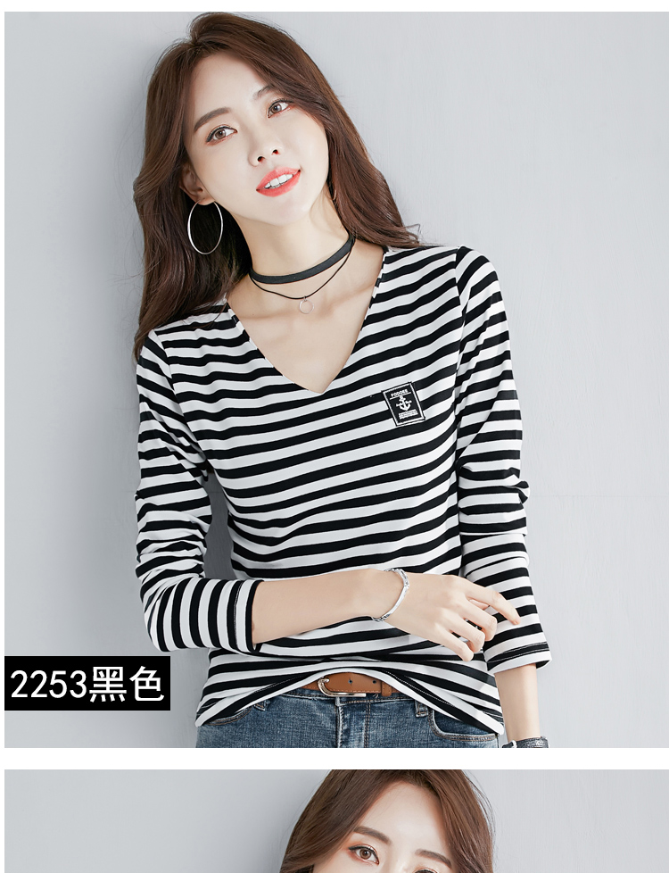 2019秋裝新款V領純棉上衣女修身紐扣韓版百搭t恤時尚長袖打底衫女