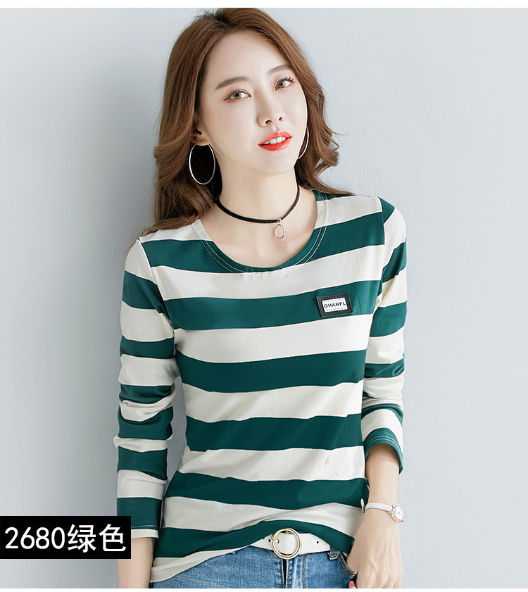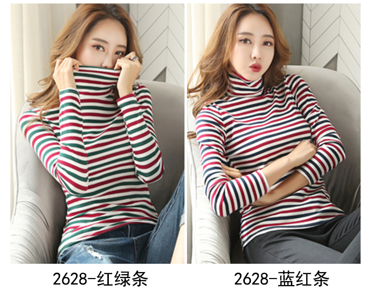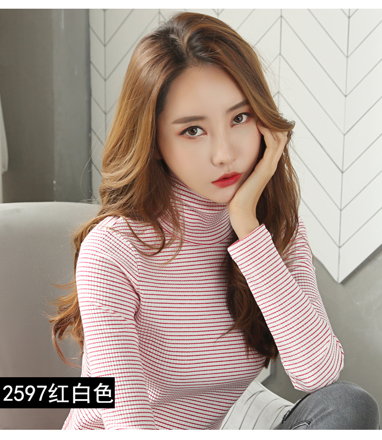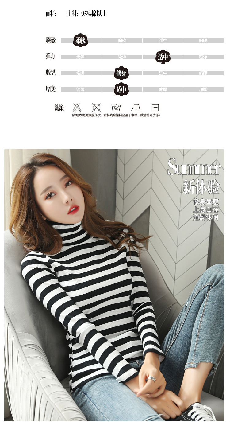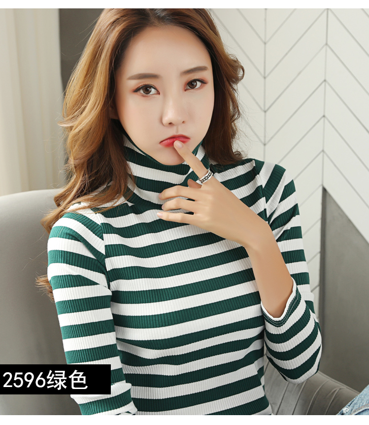 高領打底衫女長袖2019新款秋冬季條紋t恤女純棉修身緊身內搭上衣