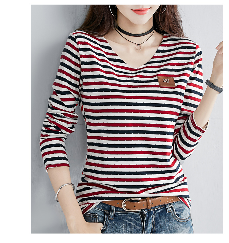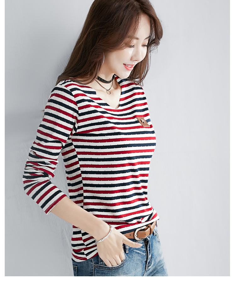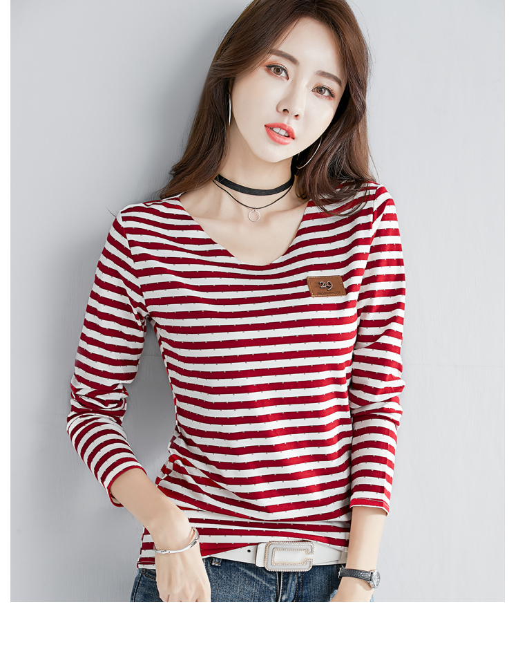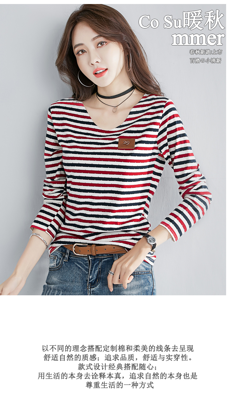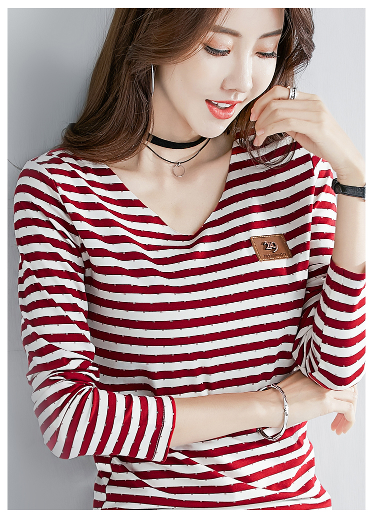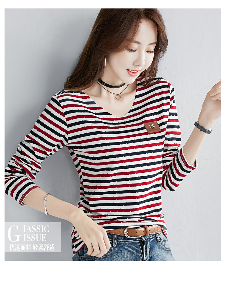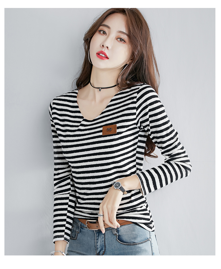 2019秋裝新款修身純棉上衣女時尚打底衫女V領條紋韓版百搭長袖t恤