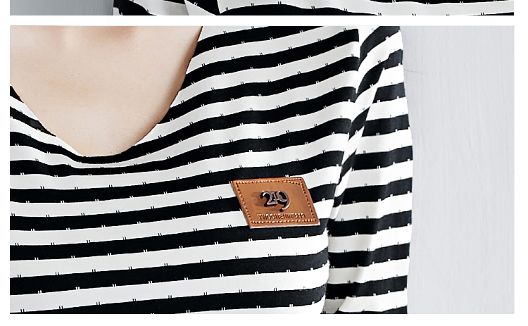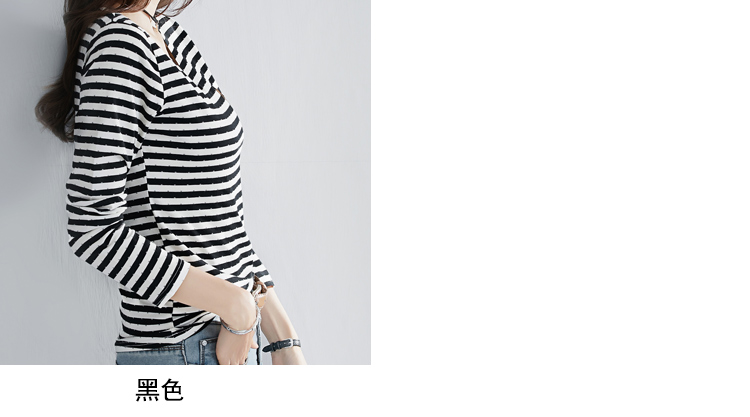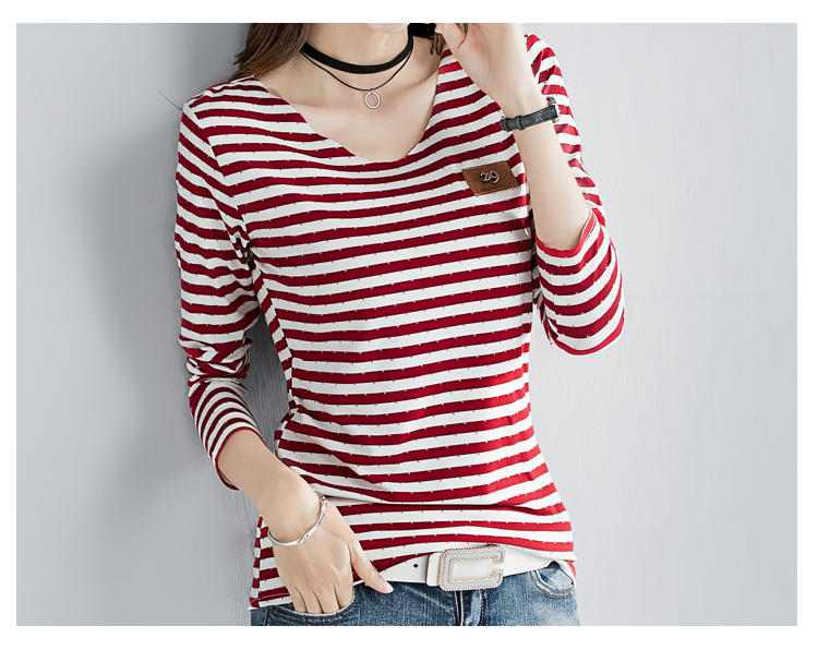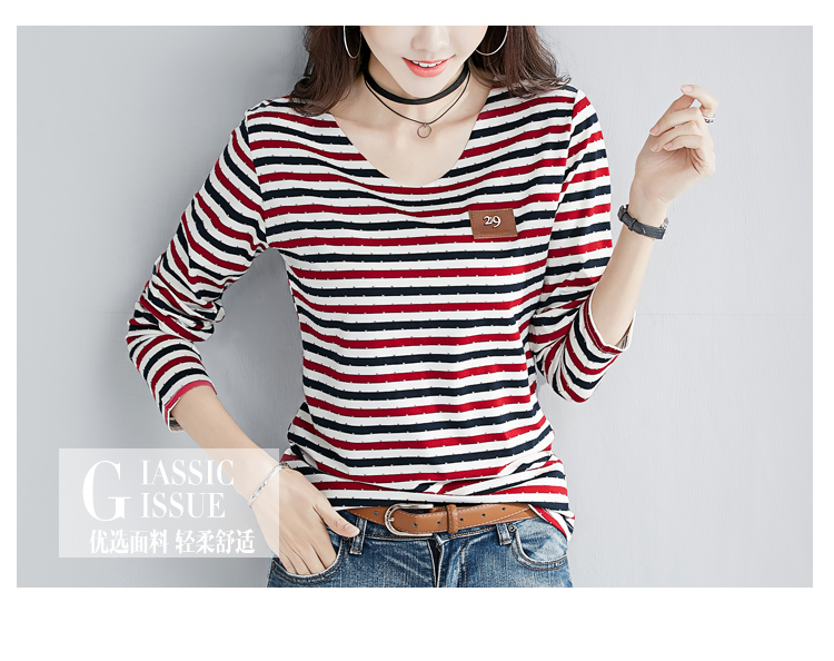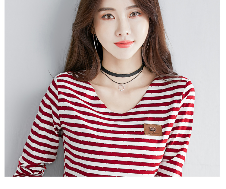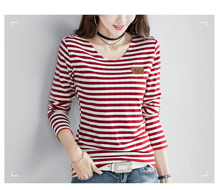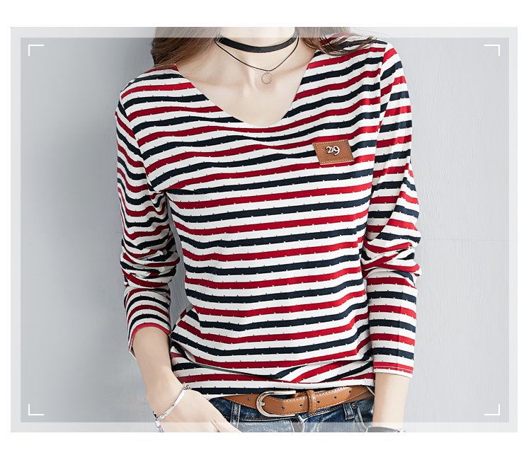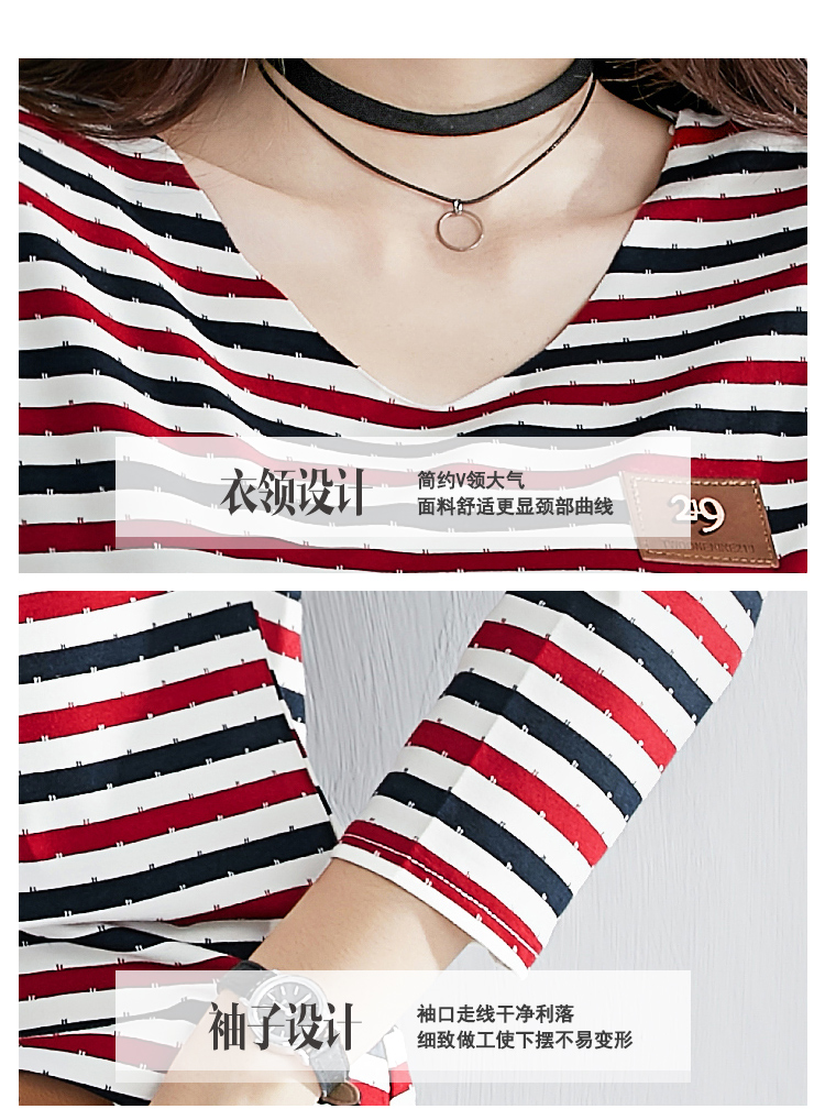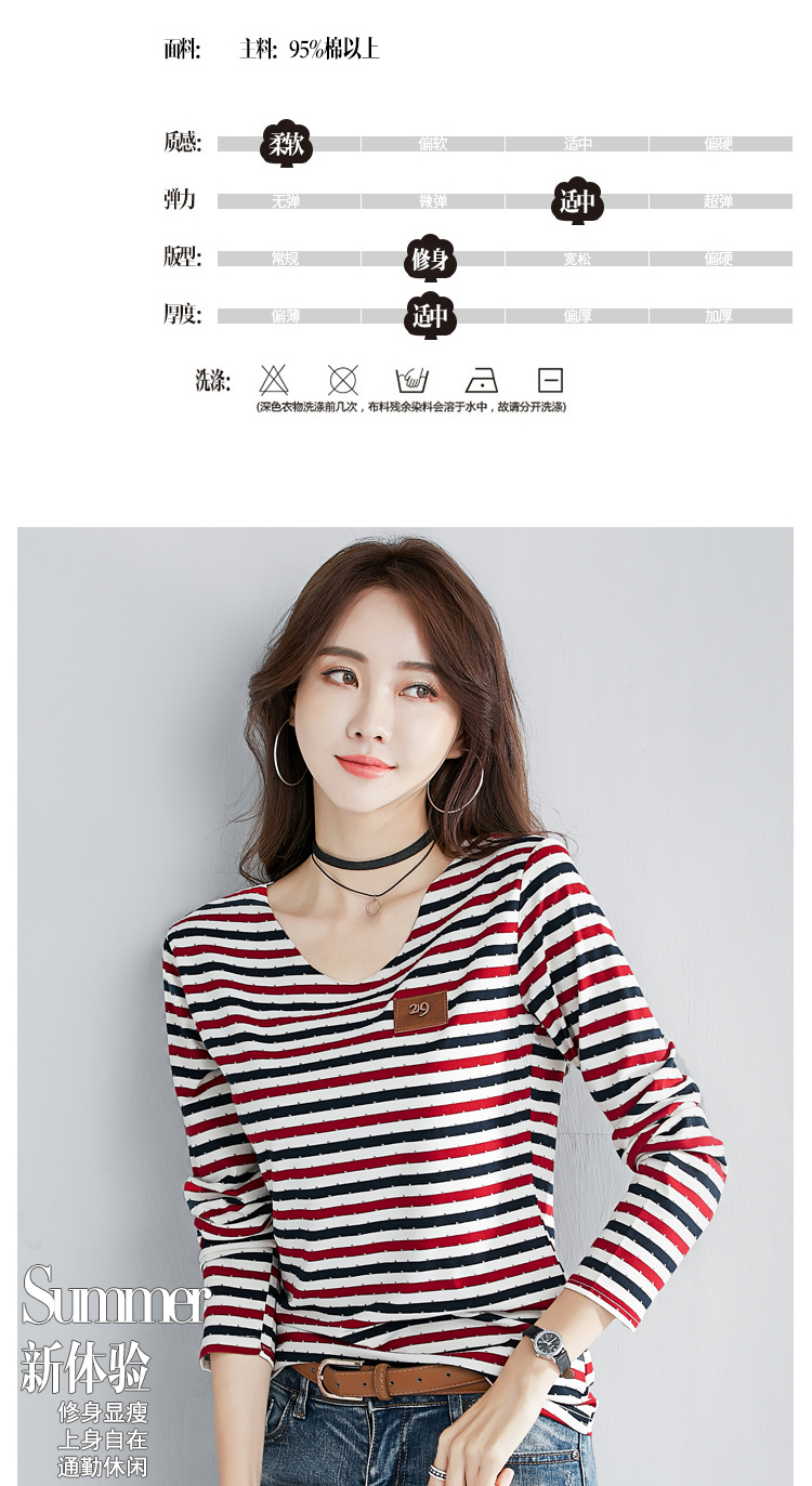 2019秋裝新款修身純棉上衣女時尚打底衫女V領條紋韓版百搭長袖t恤