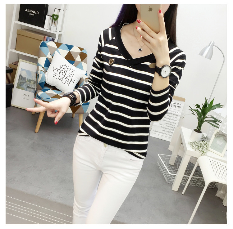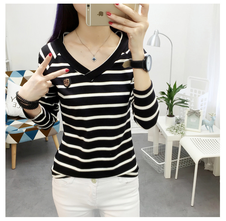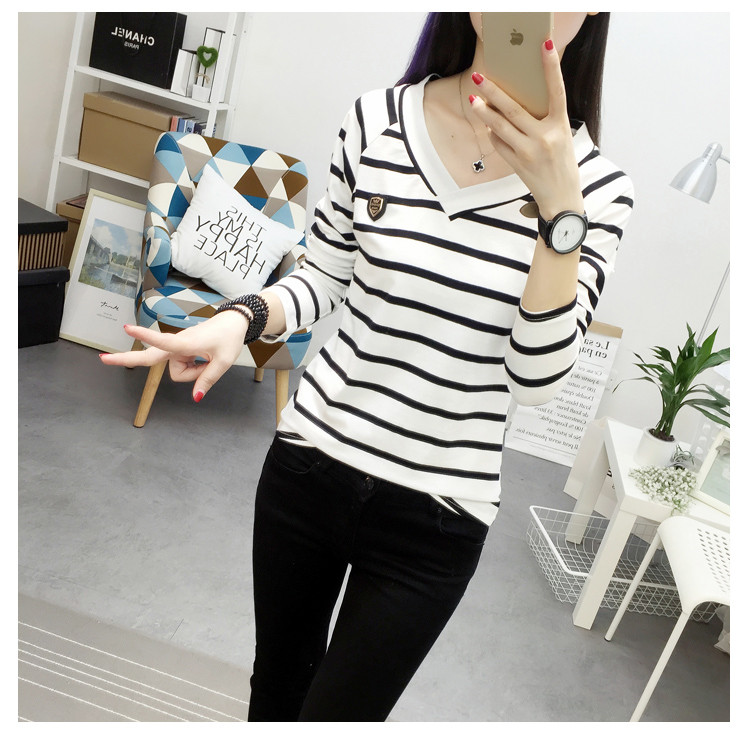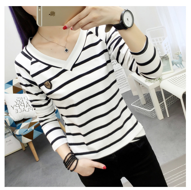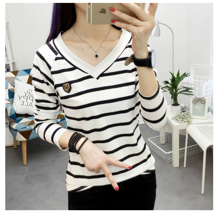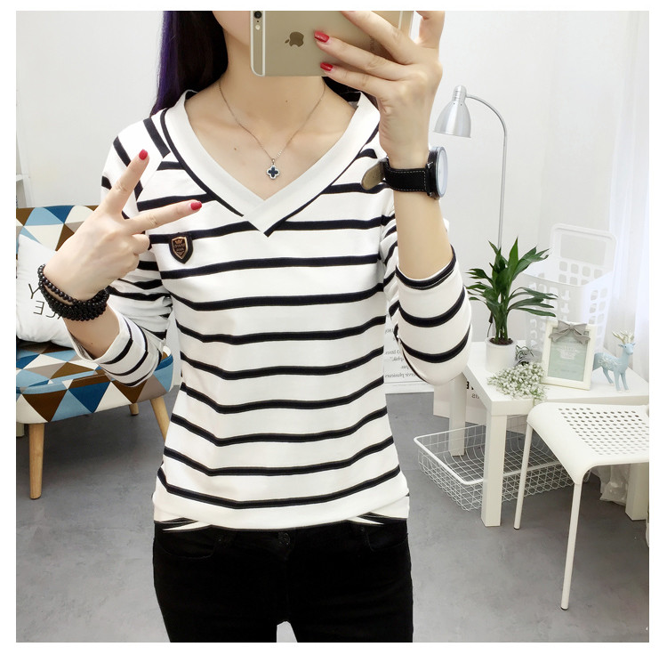 2019秋季新款韓版修身顯瘦女條紋純棉V領秋衣長袖T恤女春裝打底衫