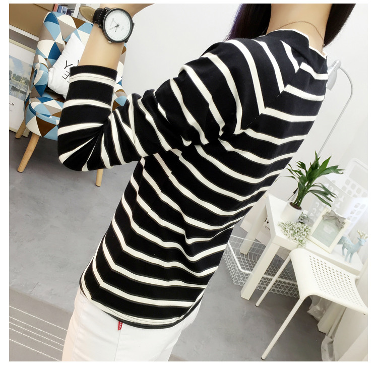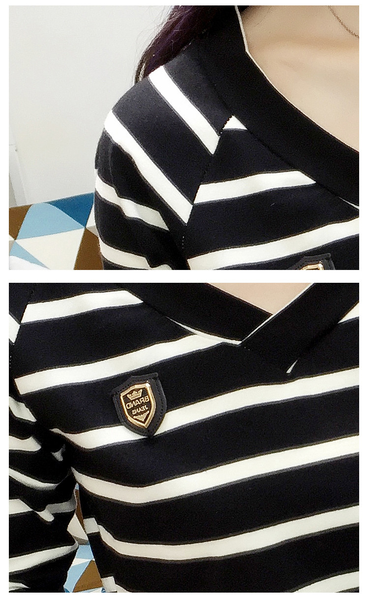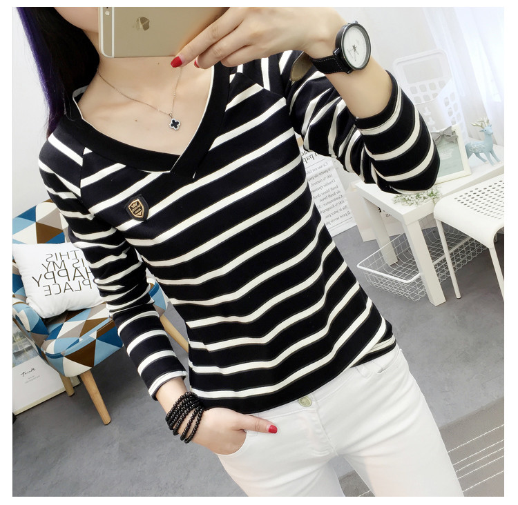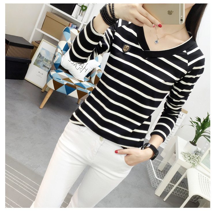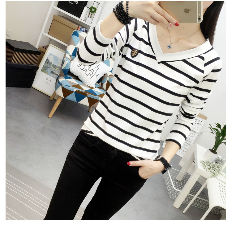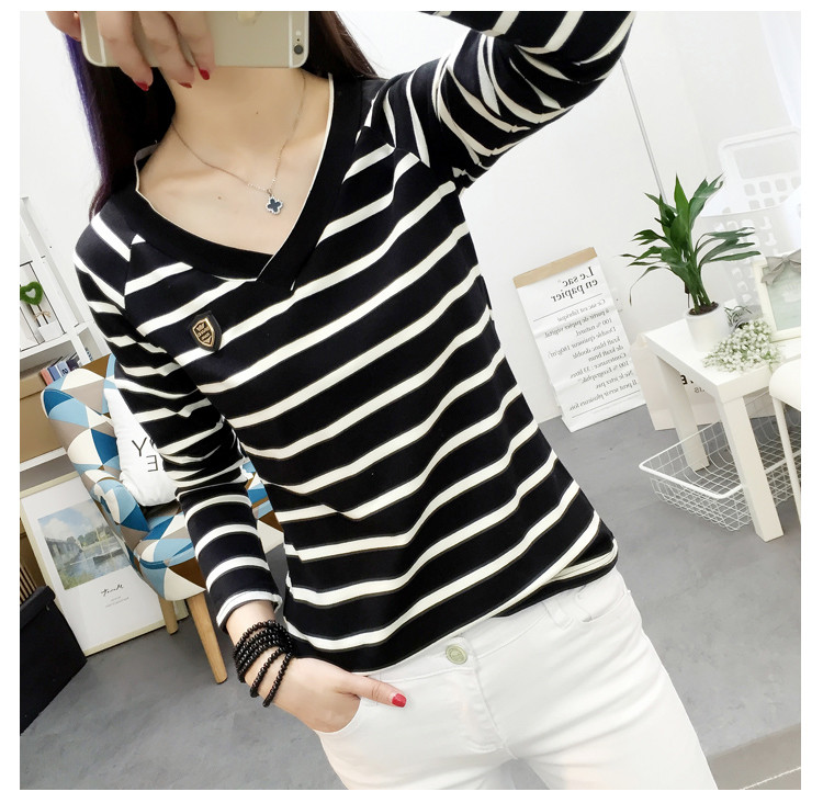 2019秋季新款韓版修身顯瘦女條紋純棉V領秋衣長袖T恤女春裝打底衫