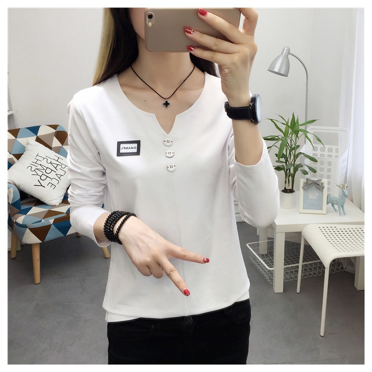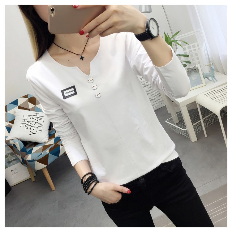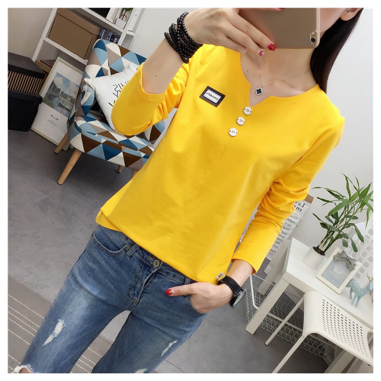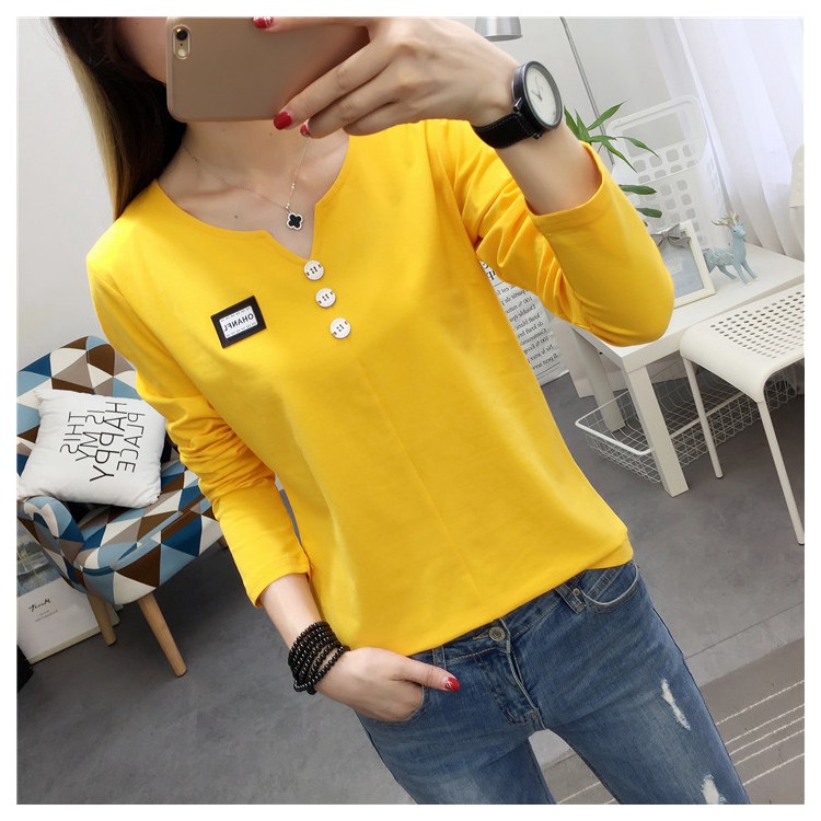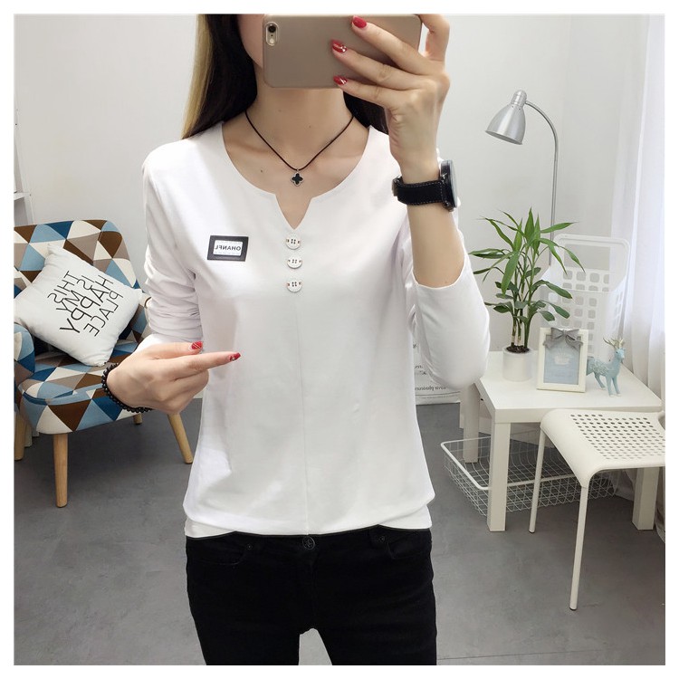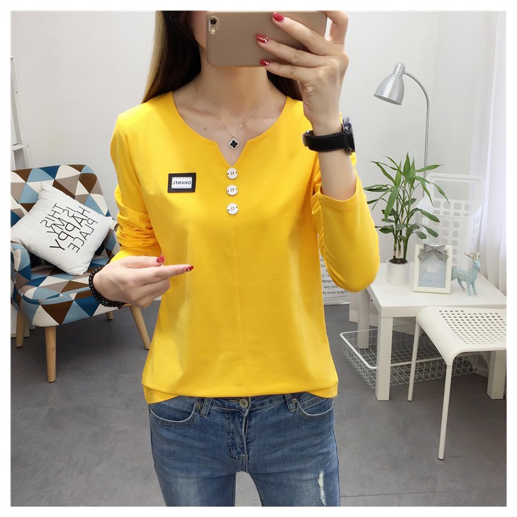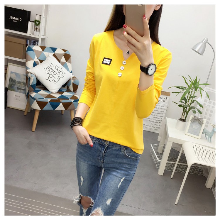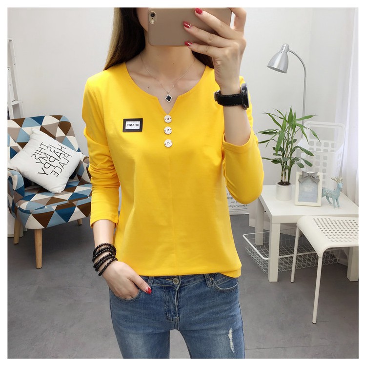 2019秋裝新款女裝純色簡約上衣修身顯瘦學生純棉長袖t恤打底衫潮