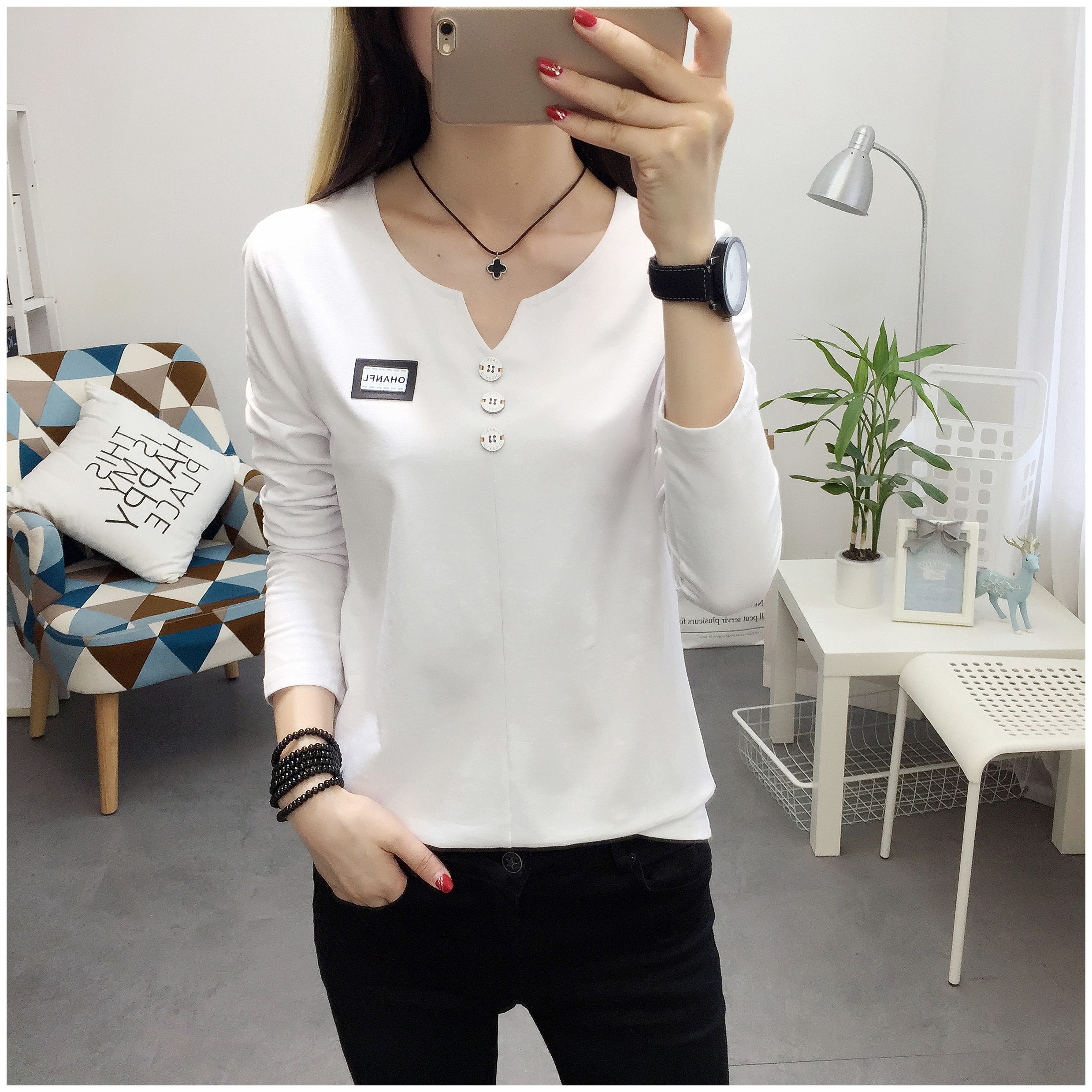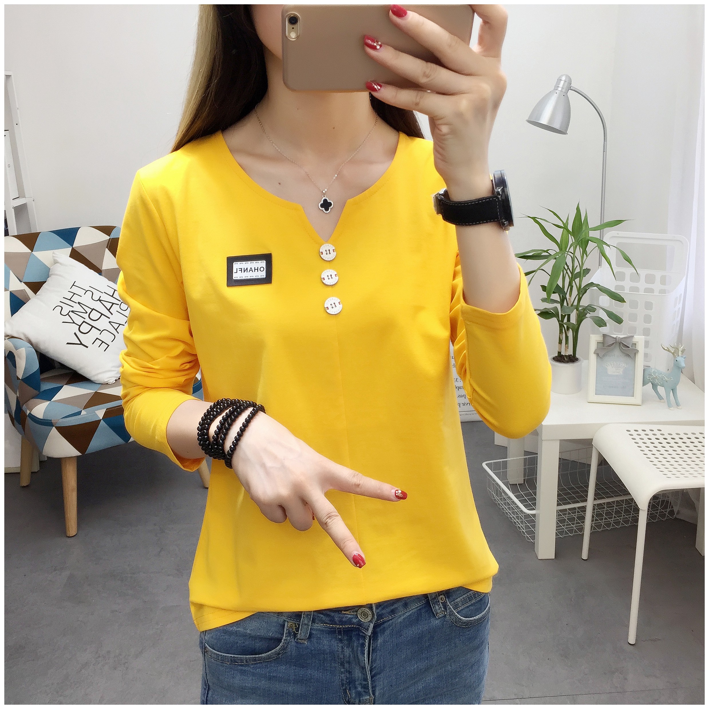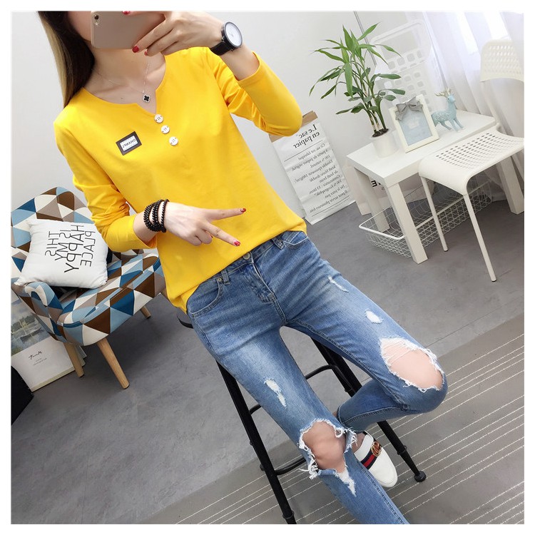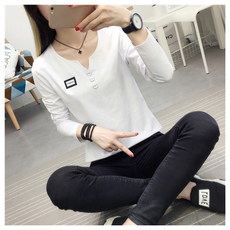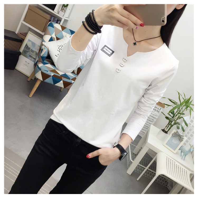 2019秋裝新款女裝純色簡約上衣修身顯瘦學生純棉長袖t恤打底衫潮