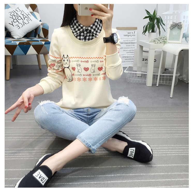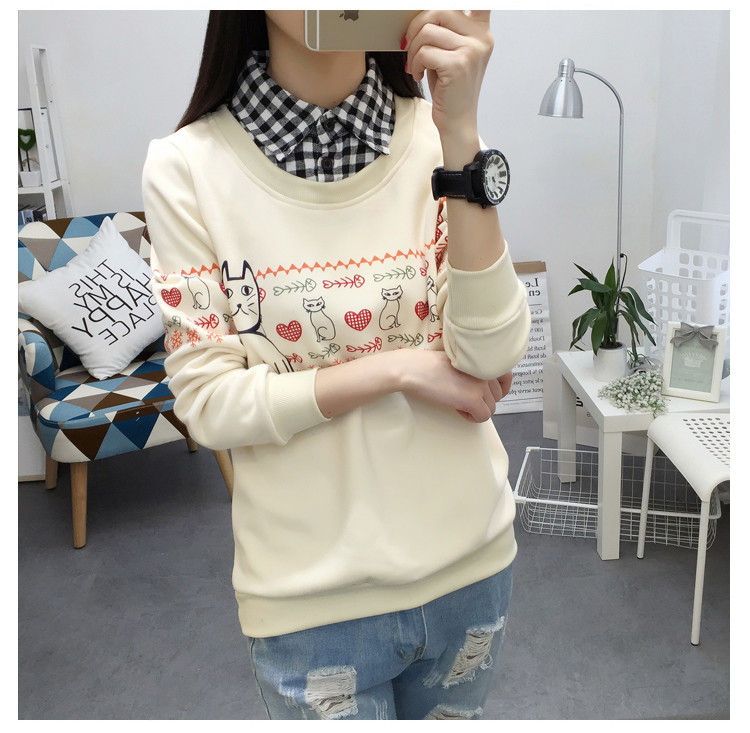 長袖t恤女秋冬加絨保暖加厚韓版寬松大碼假兩件學生上衣打底衫女