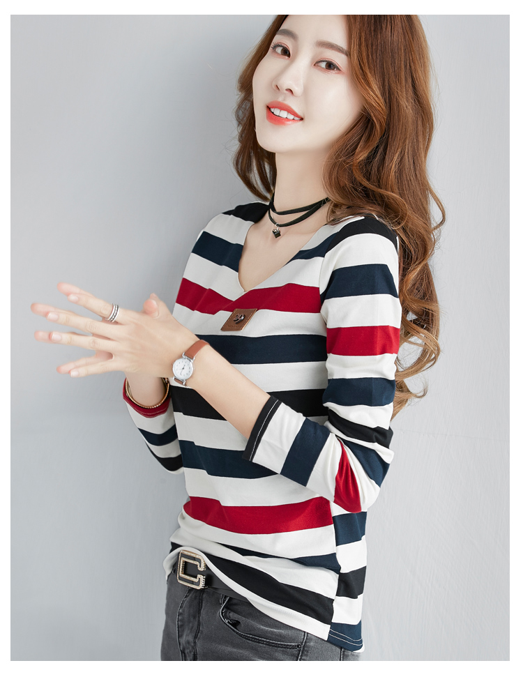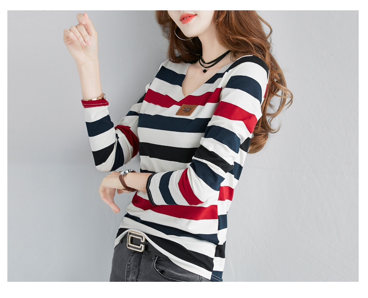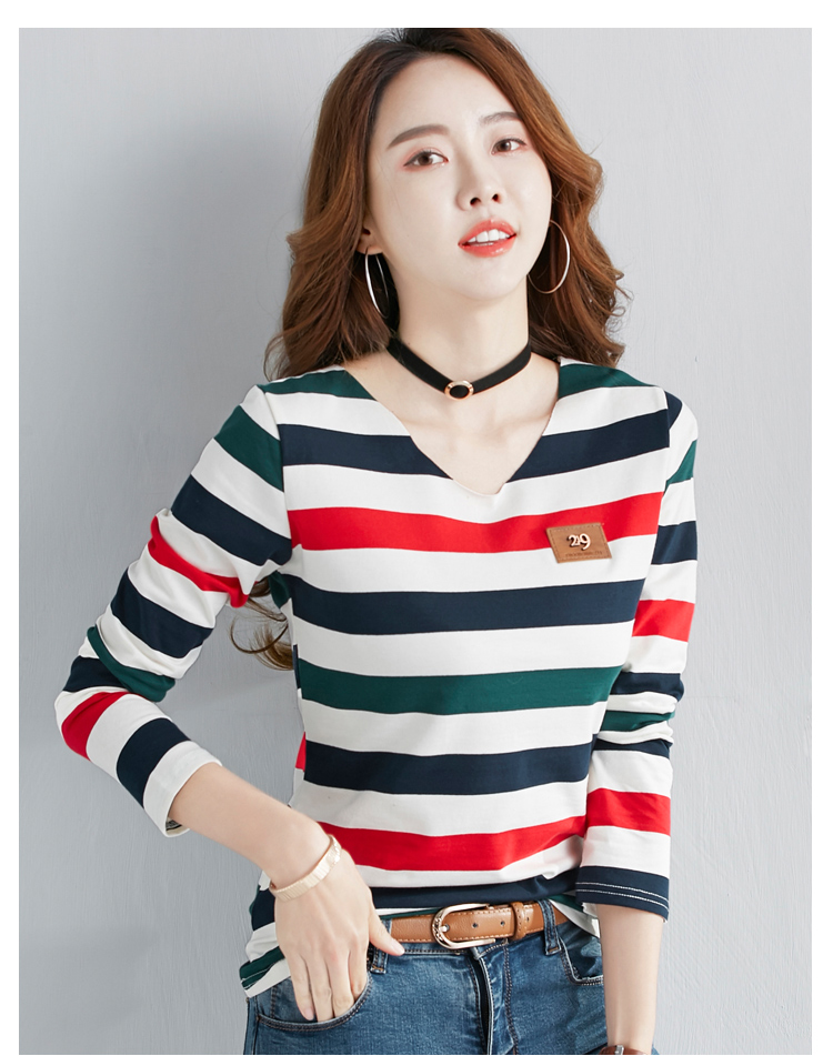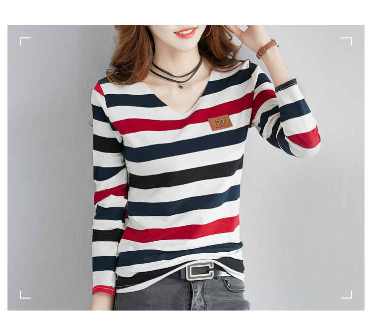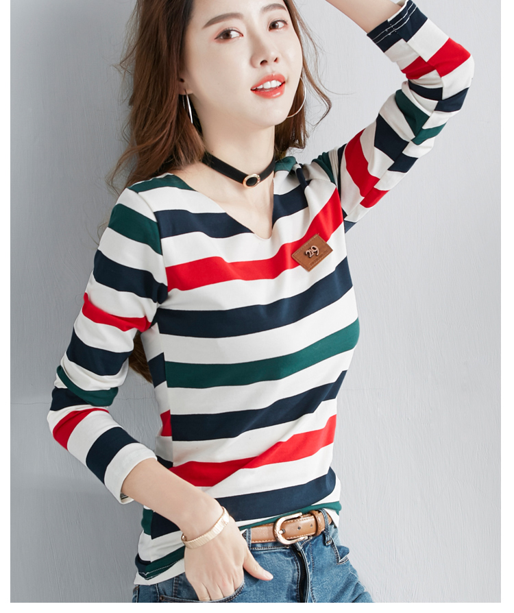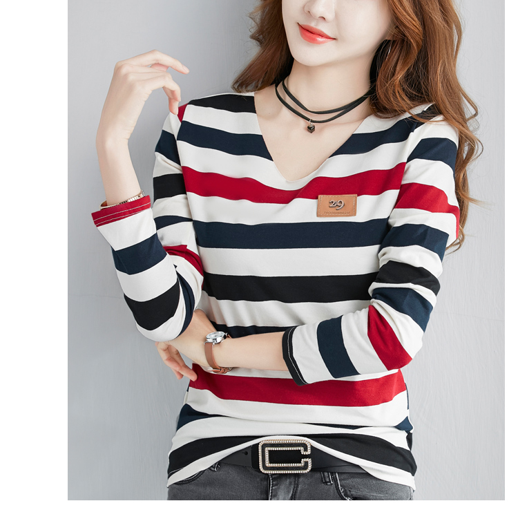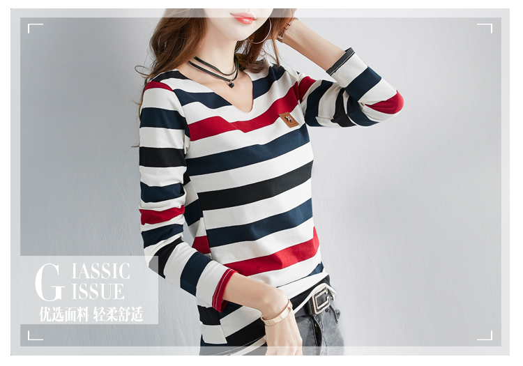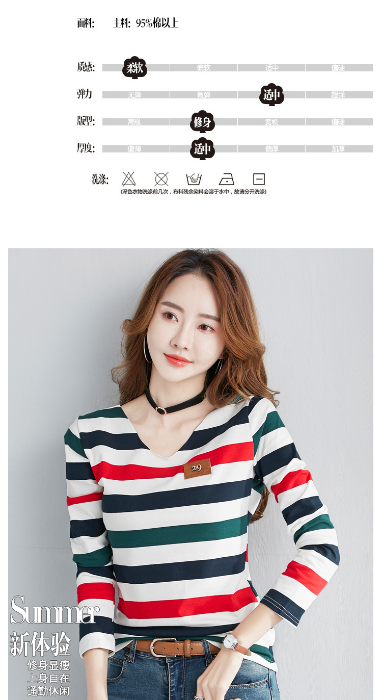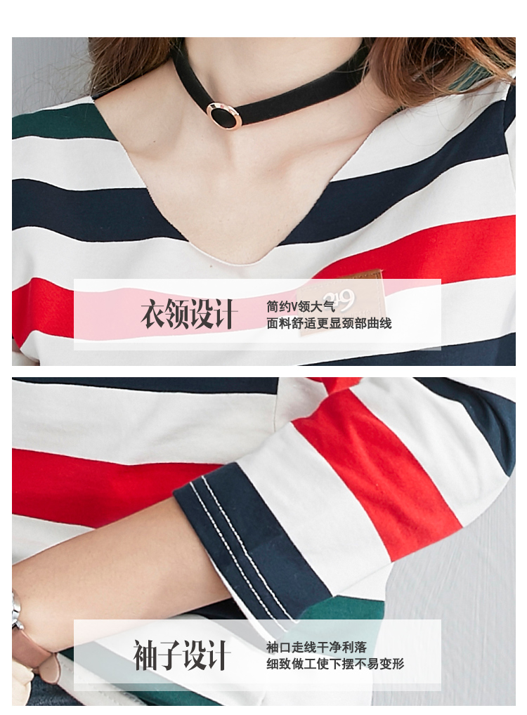 2019秋裝新款修身純棉上衣女時尚條紋韓版百搭長袖t恤V領打底衫女