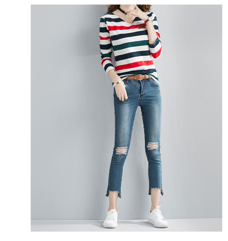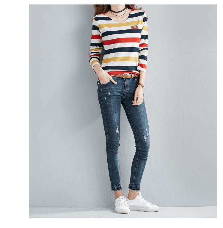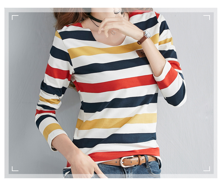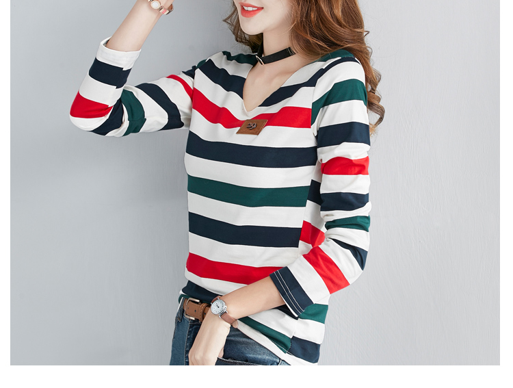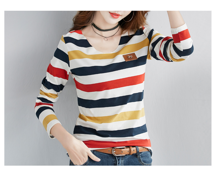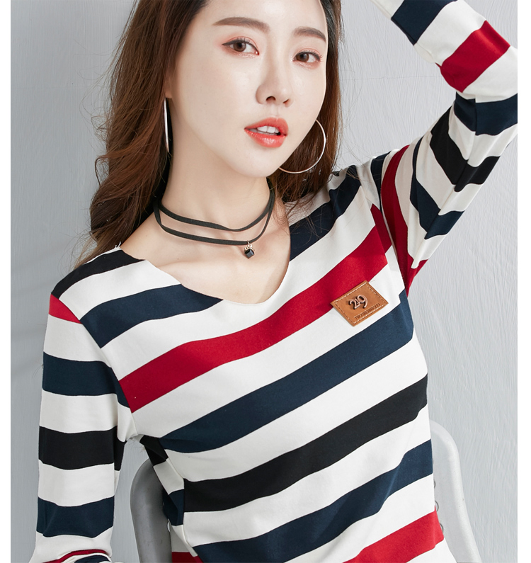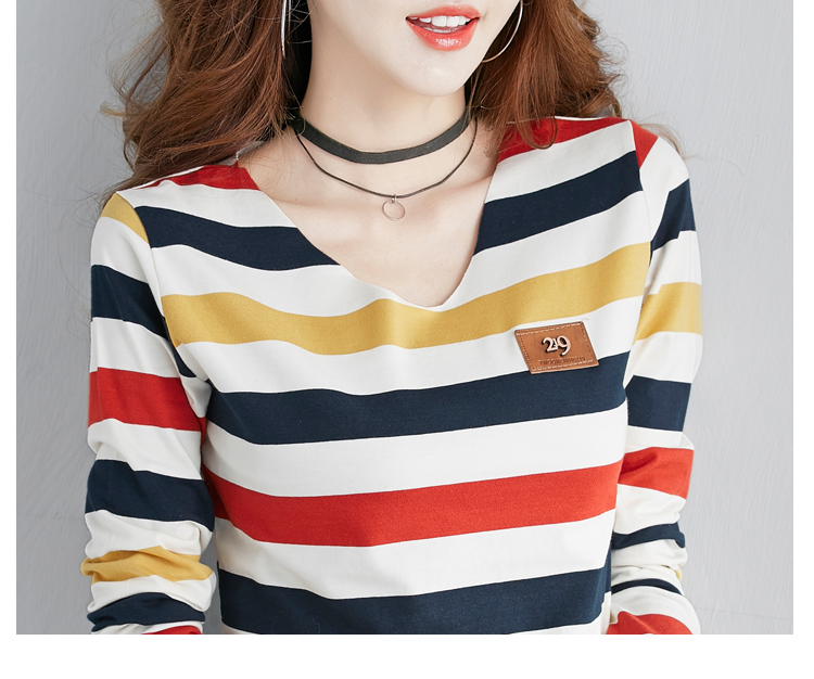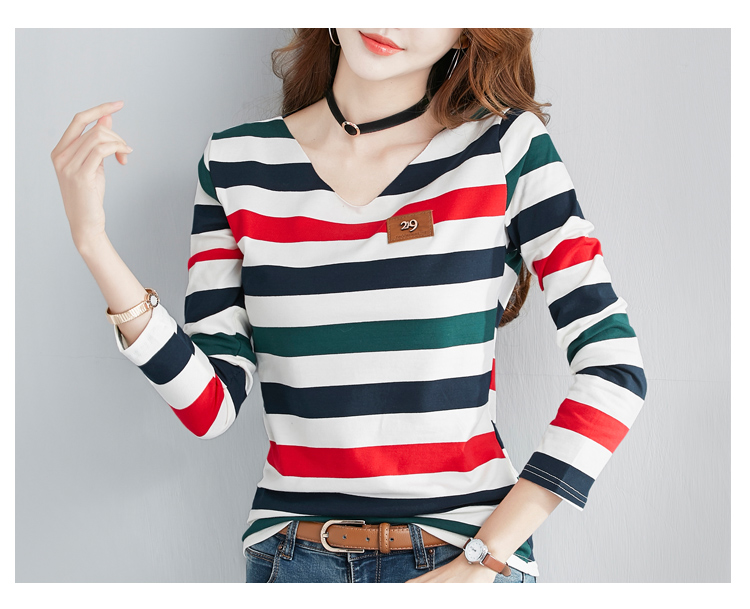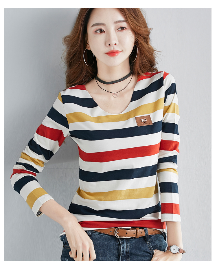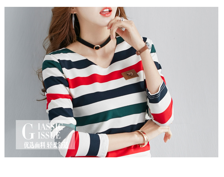 2019秋裝新款修身純棉上衣女時尚條紋韓版百搭長袖t恤V領打底衫女