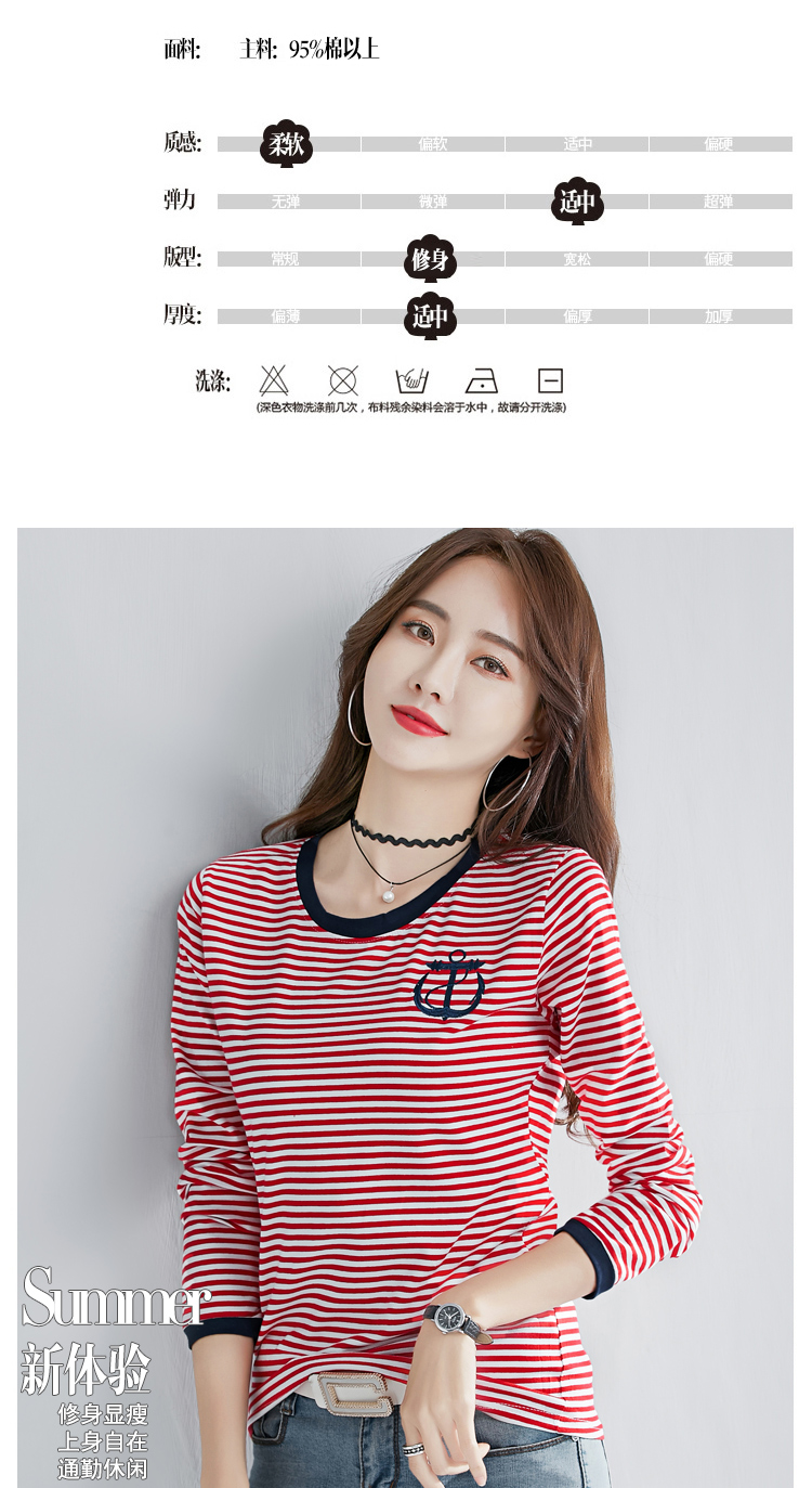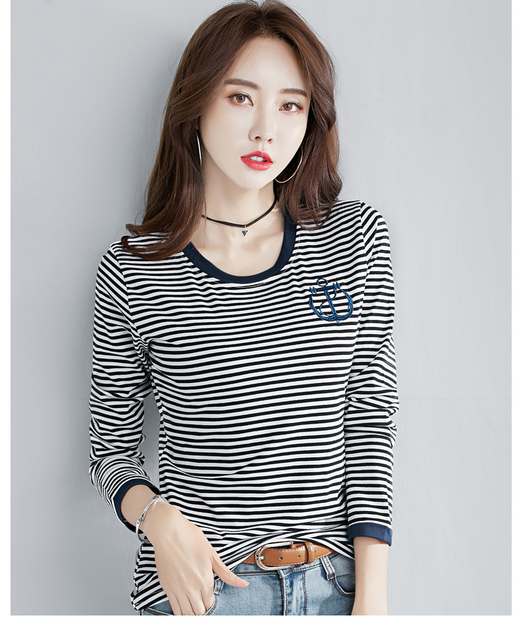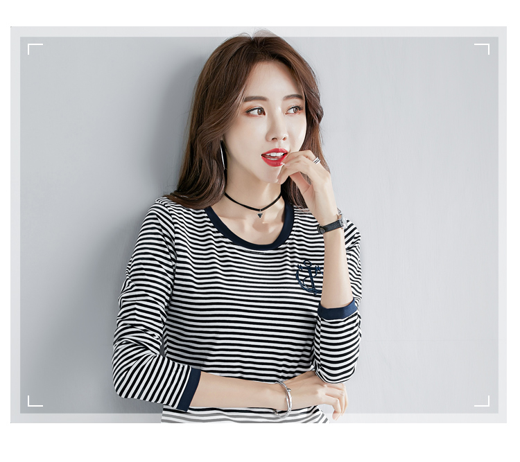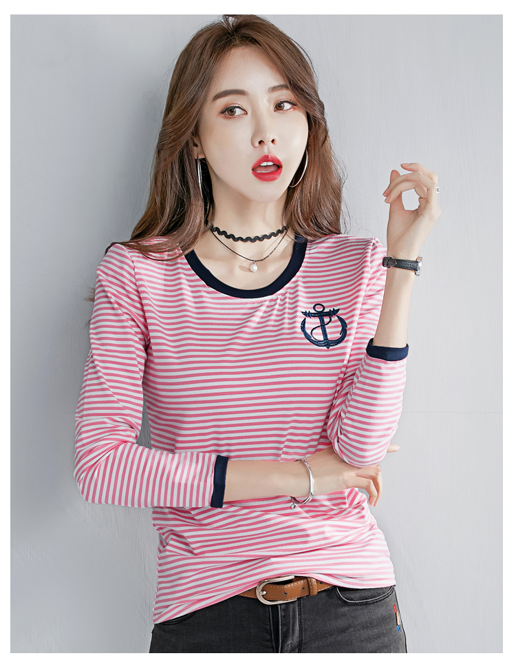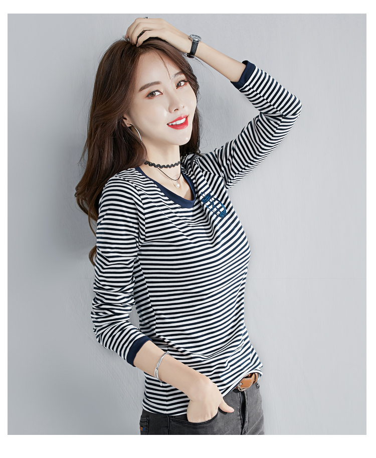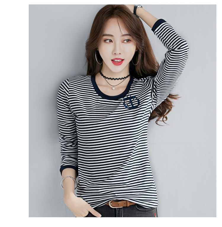2019秋新款時尚打底衫女圓領條紋韓版百搭長袖t恤修身純棉上衣女