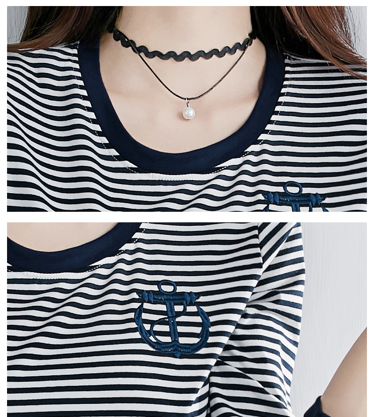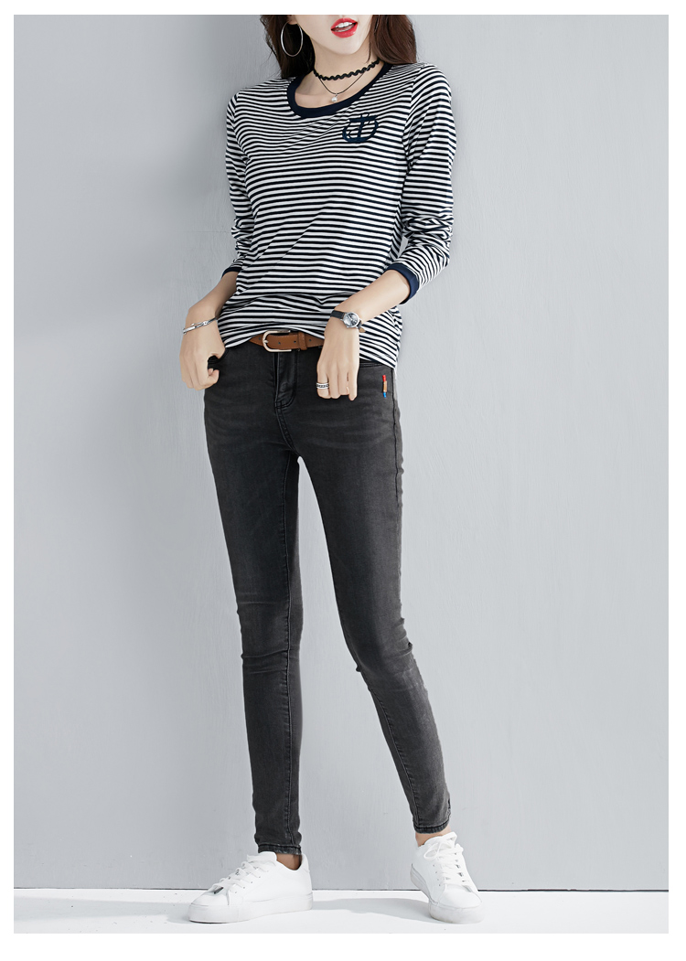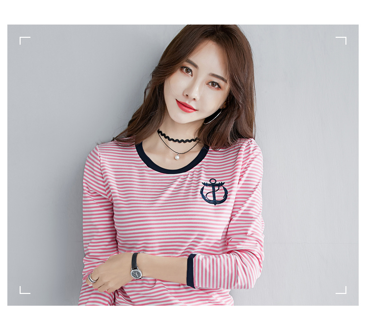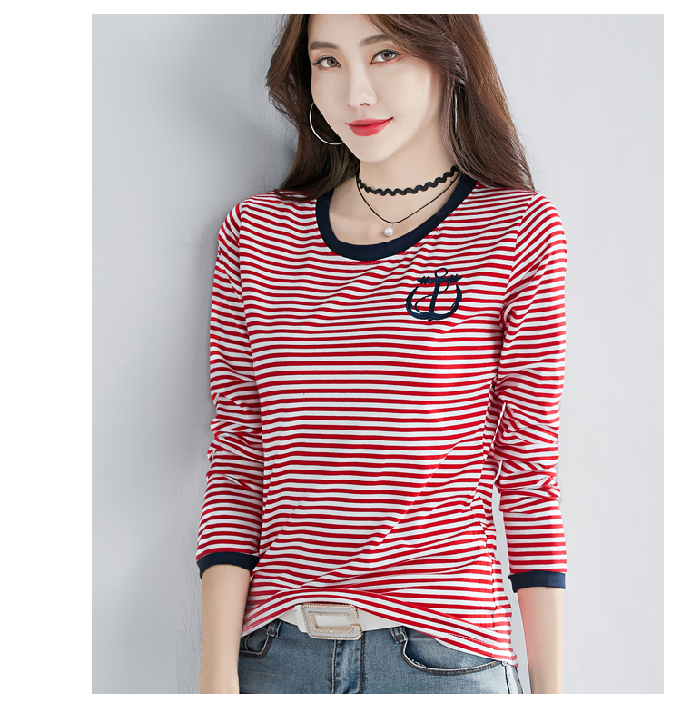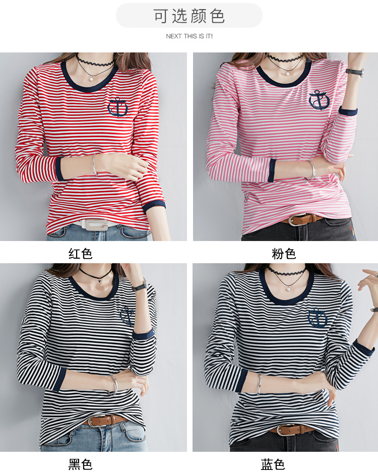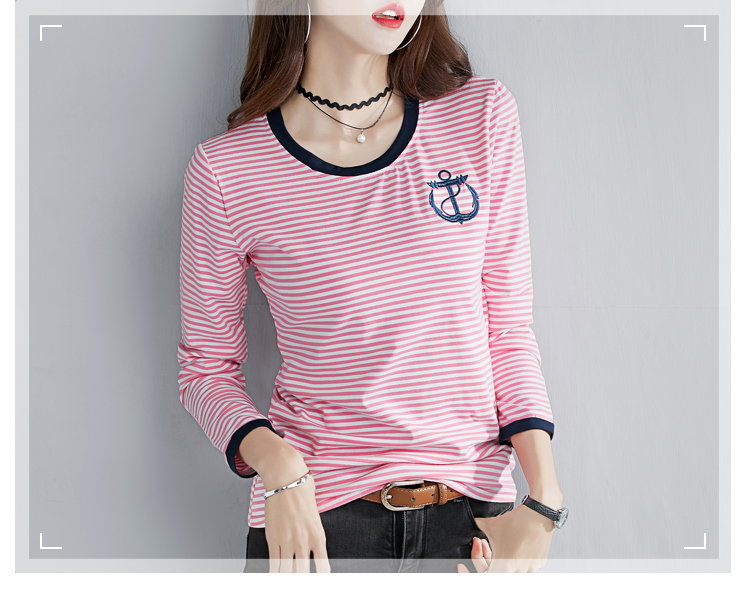 2019秋新款時尚打底衫女圓領條紋韓版百搭長袖t恤修身純棉上衣女