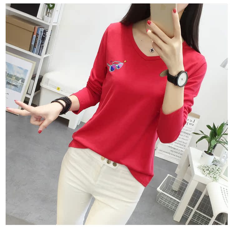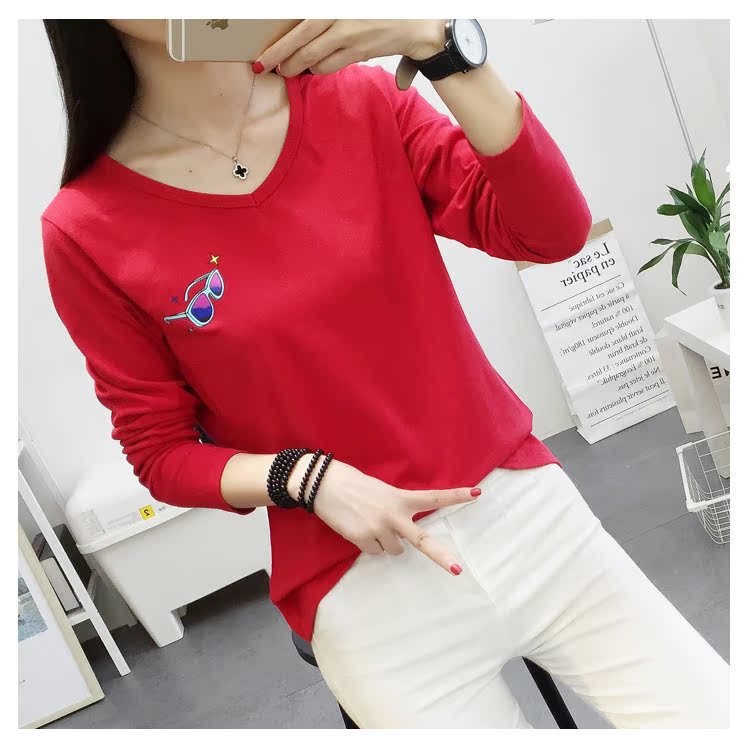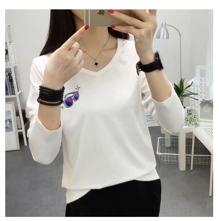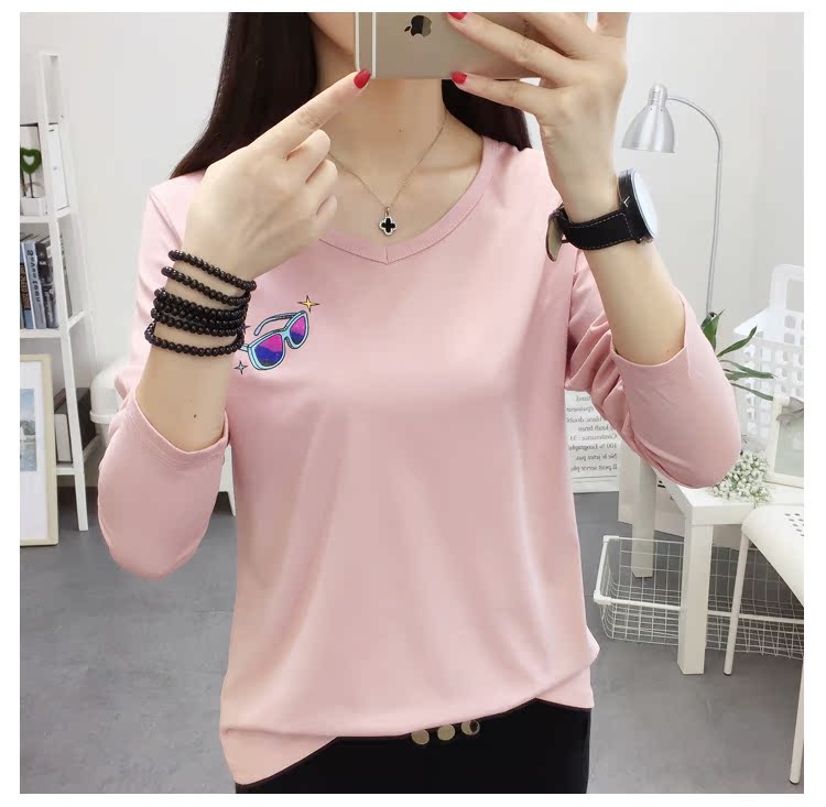 長袖t恤女士秋衣外穿上衣V領韓版百搭顯瘦寬松大碼學生印花打底衫