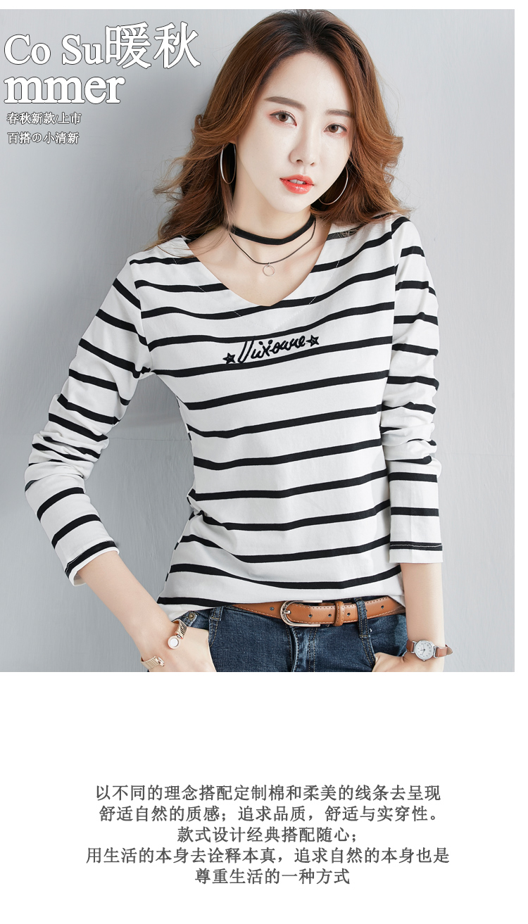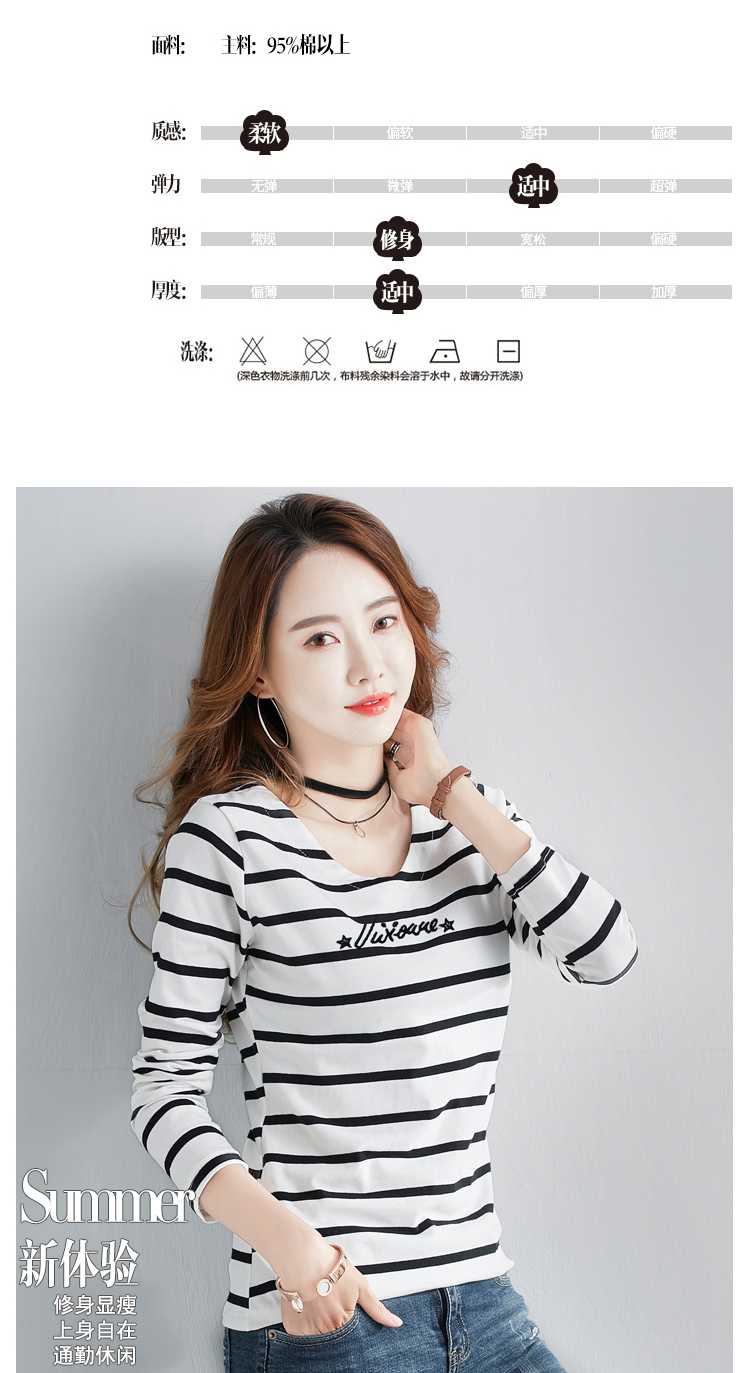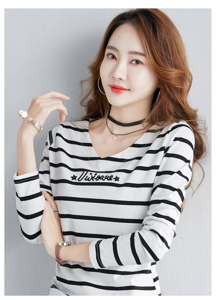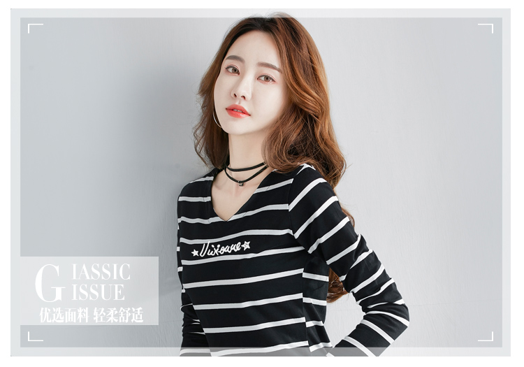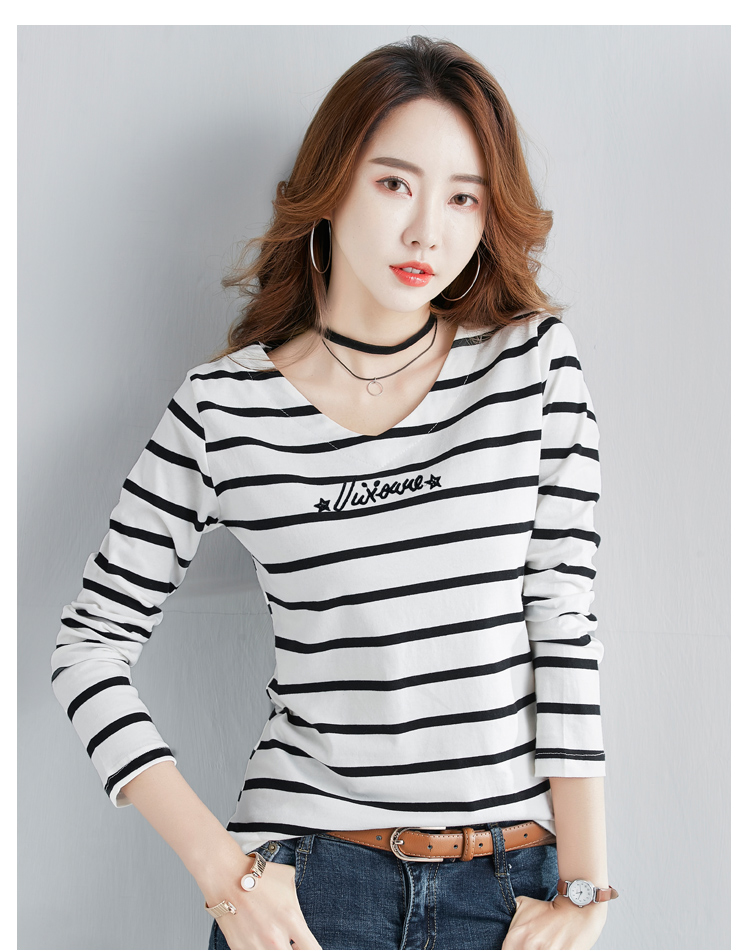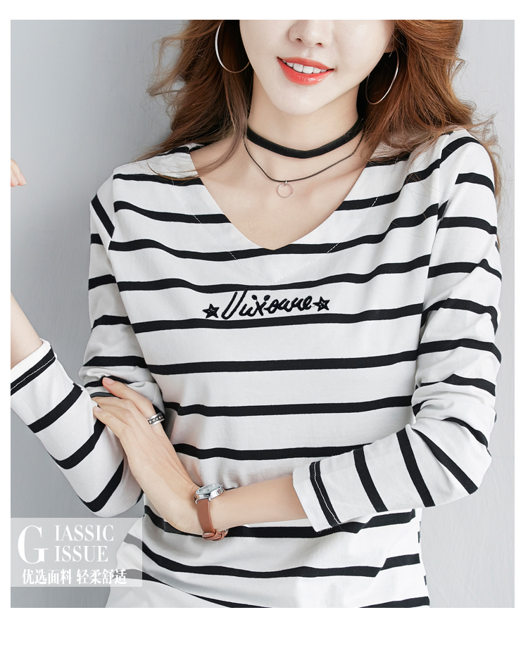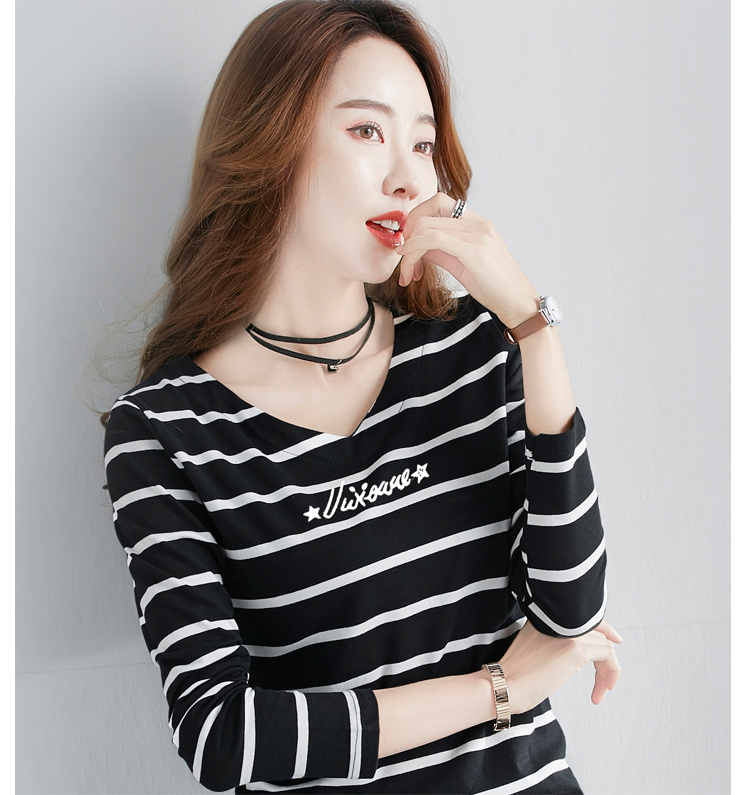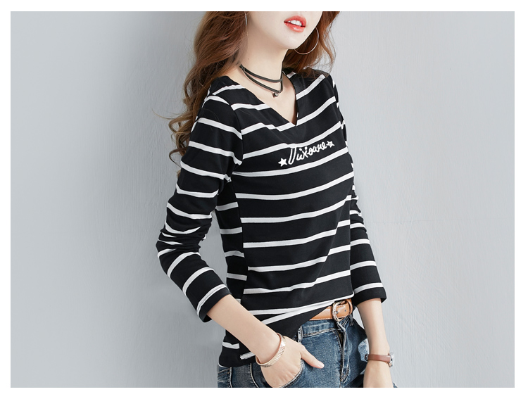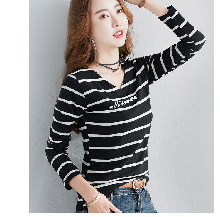 2019秋裝新款條紋字母長袖t恤V領純棉上衣女韓版修身百搭打底衫女