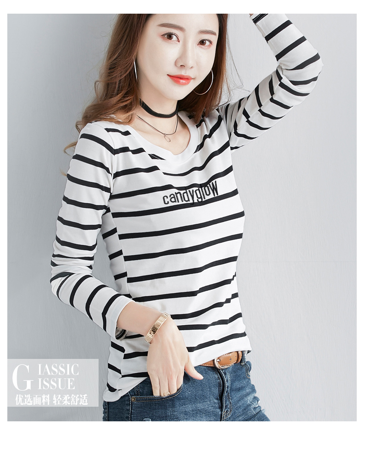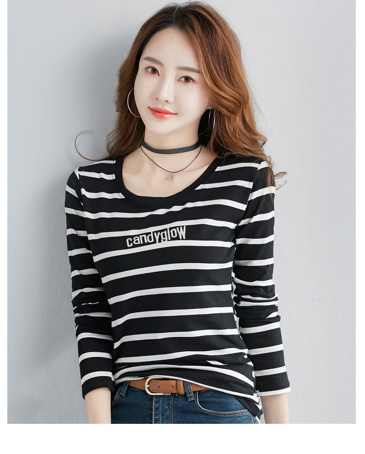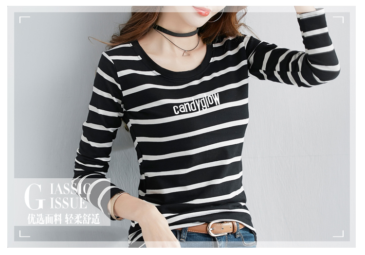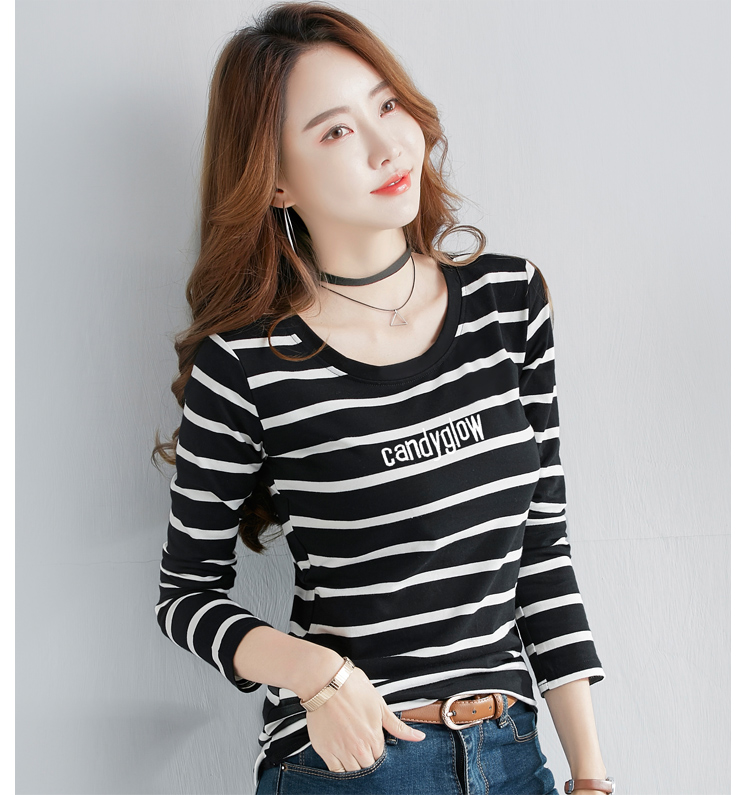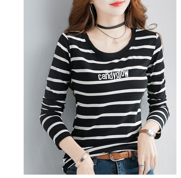 2019春裝新款修身純棉上衣女圓領條紋百搭長袖t恤女時尚打底衫女