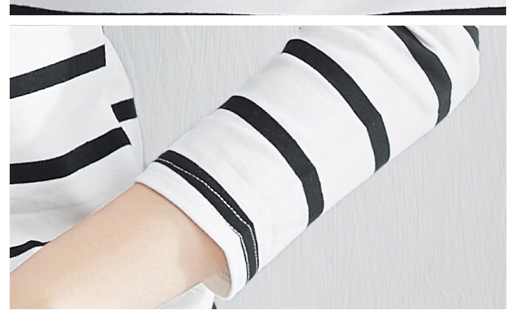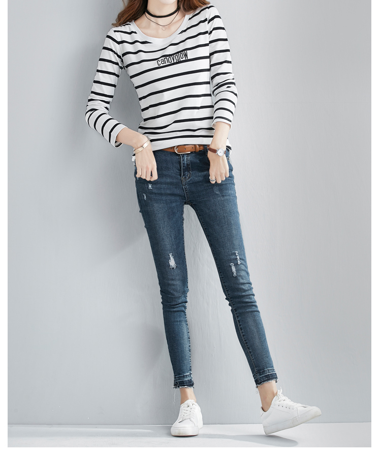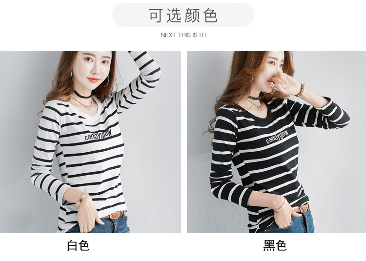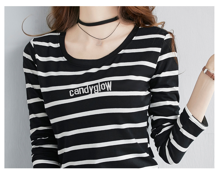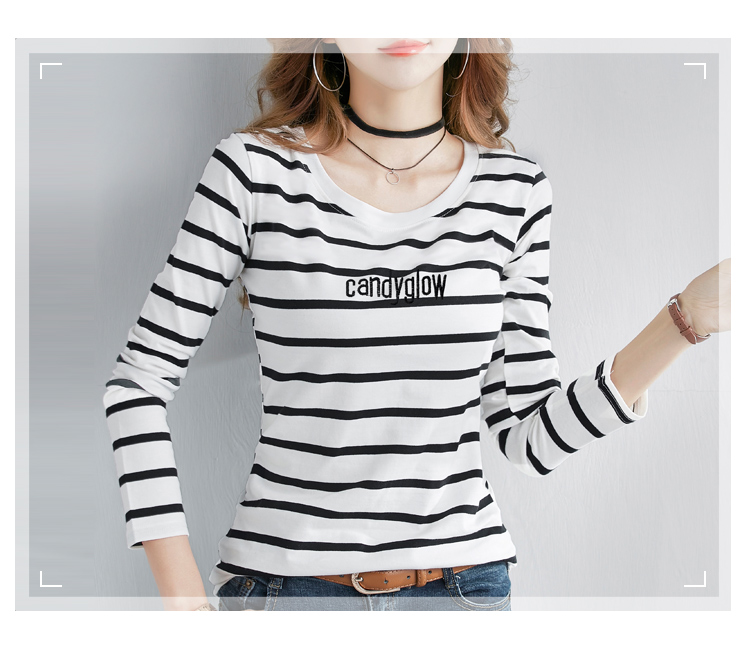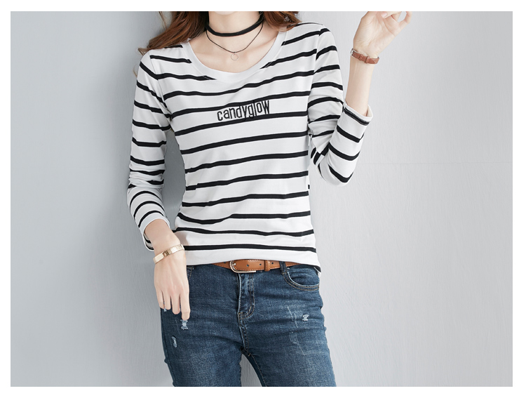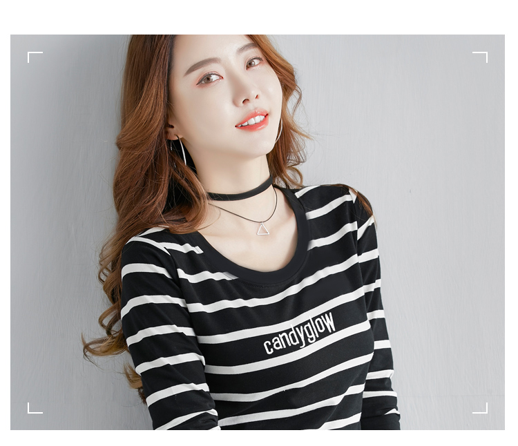 2019春裝新款修身純棉上衣女圓領條紋百搭長袖t恤女時尚打底衫女