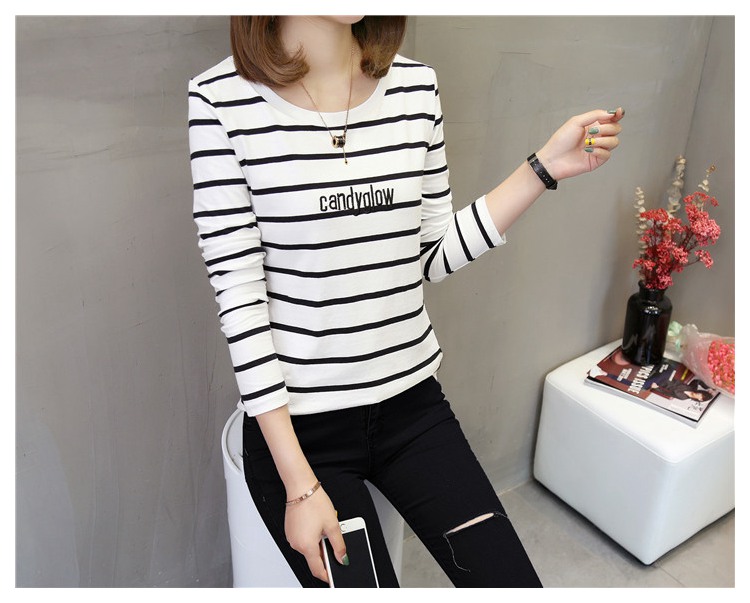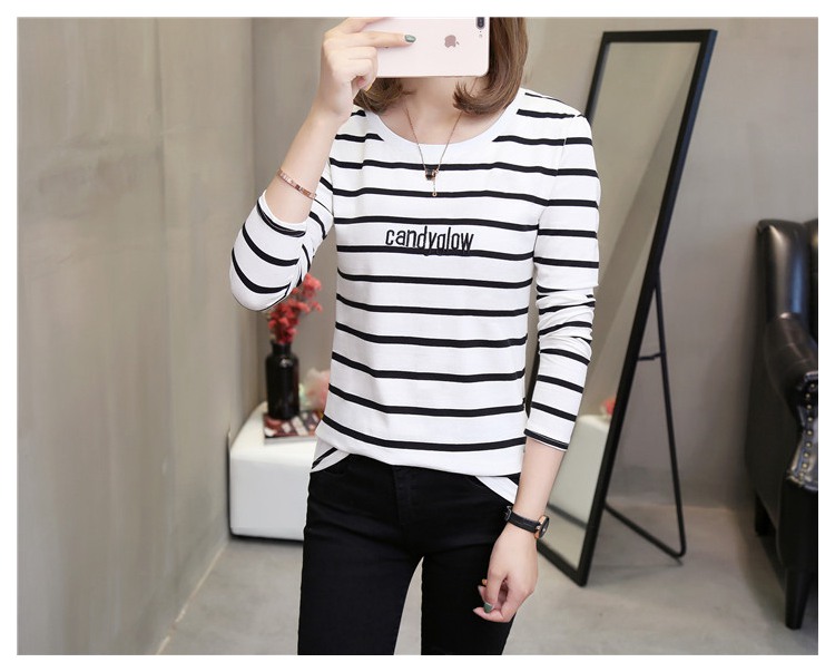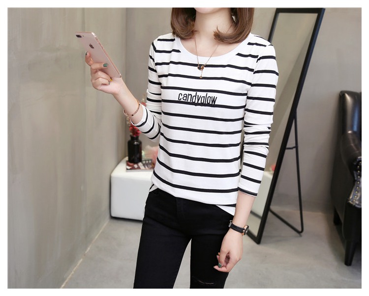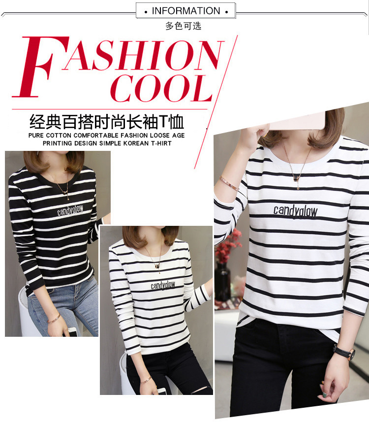 2019新款秋裝條紋長袖t恤女修身顯瘦純棉韓版百搭上衣內搭打底衫