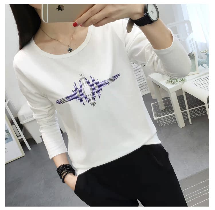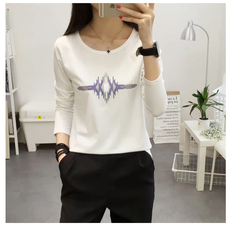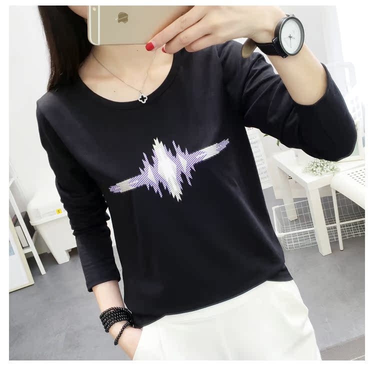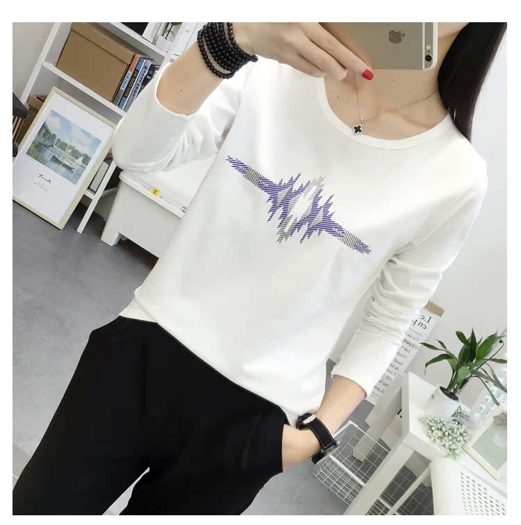 長袖t恤女學生韓版百搭寬松大碼春裝新款2019上衣打底衫印花圓領